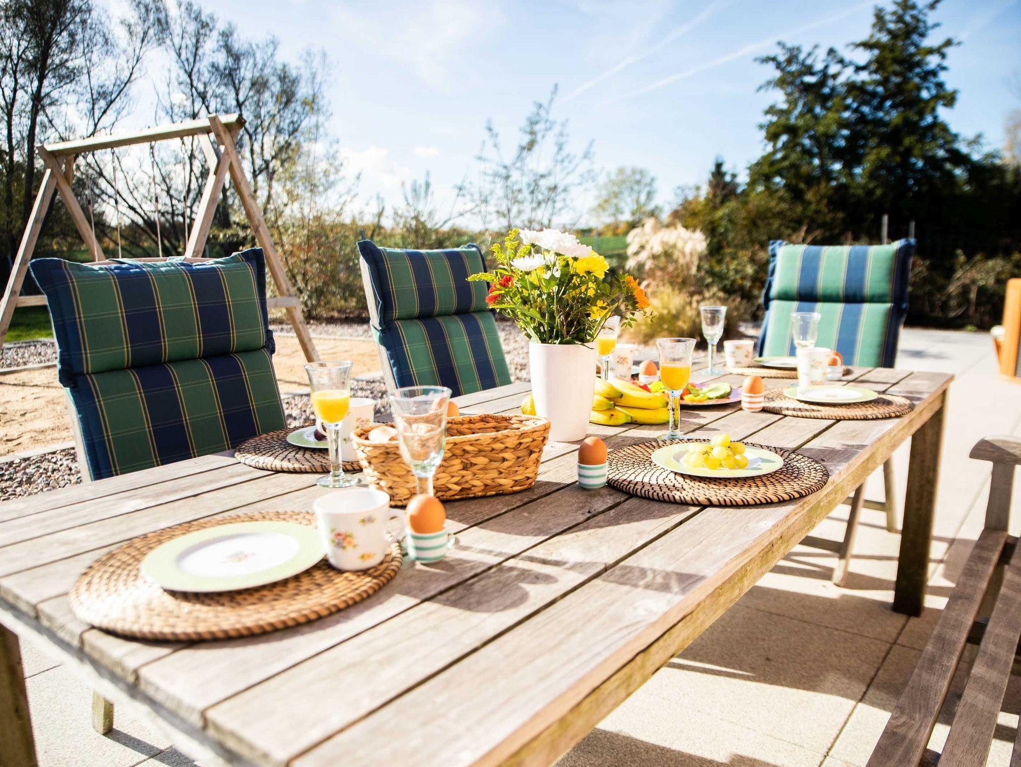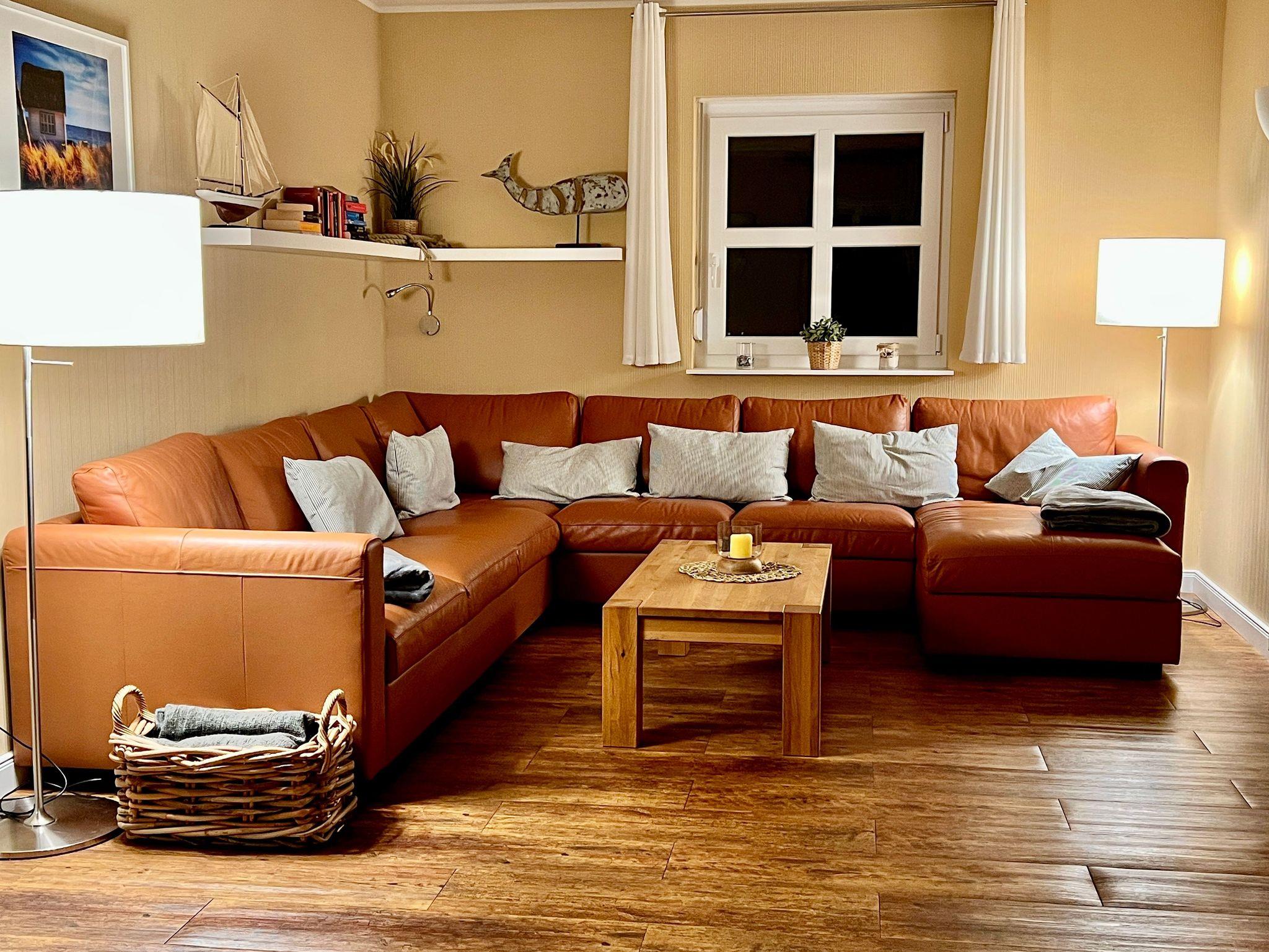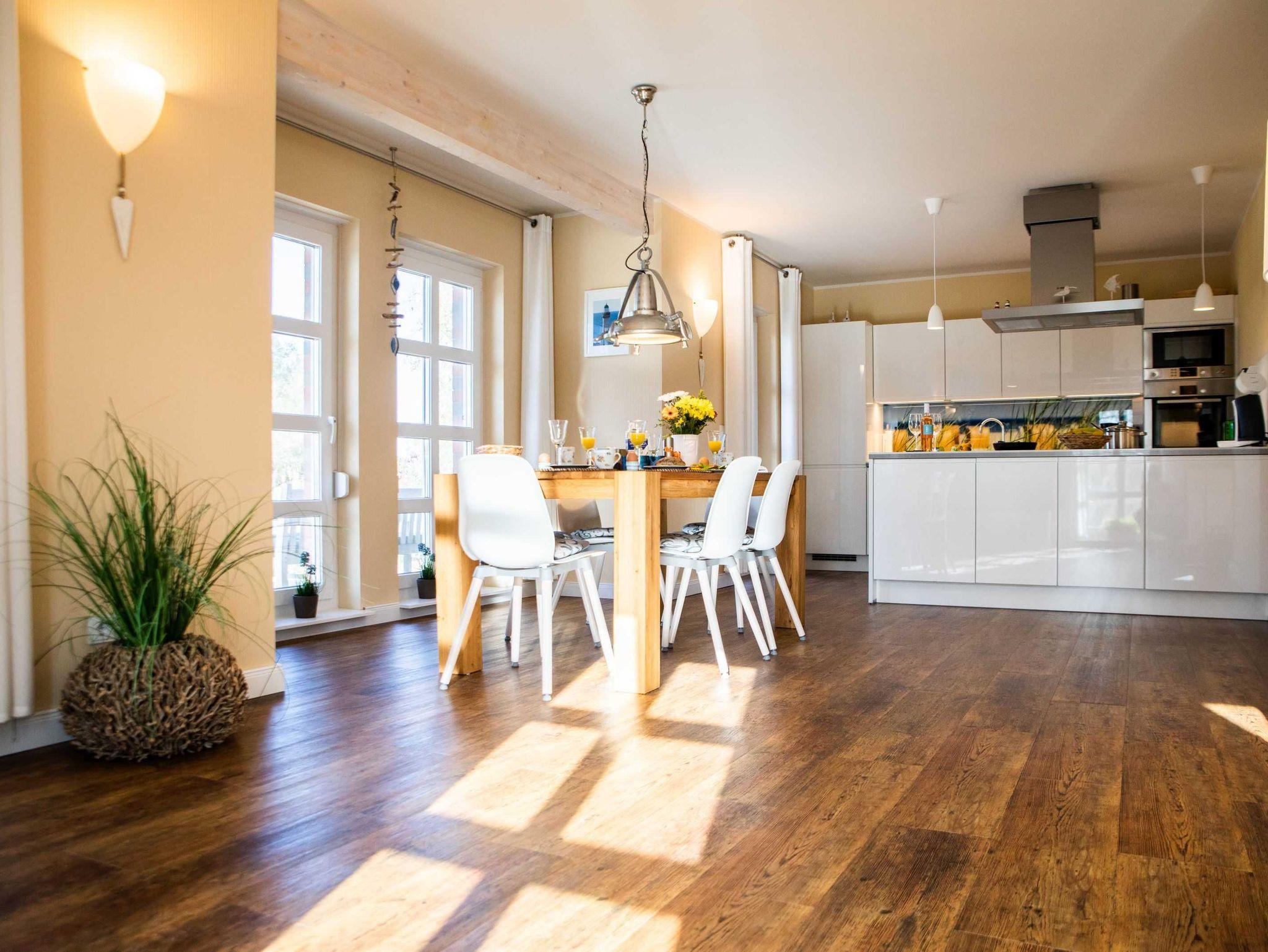 Zum 4-Sterne-Ferienhaus gehört eine moderne Einbauküche mit Geschirrspüler, großem Kühlschrank inkl. geräumigen Gefrierfach, Induktionskochfeld, Backofen, Mikrowelle, Filterkaffee- sowie Senseokaffeemaschine, Wasserkocher, Toaster und Waschmaschine. Das Wohnzimmer und die Küche mit Essbereich sind offen, hell und lichtdurchflutet gestaltet. Weiterhin stehen Euch Alexa, Bluray-Player, Kinder DVDs, 55 Zoll-TV, Radio, freies WLan, Bücher und Gesellschaftsspiele zur Verfügung.