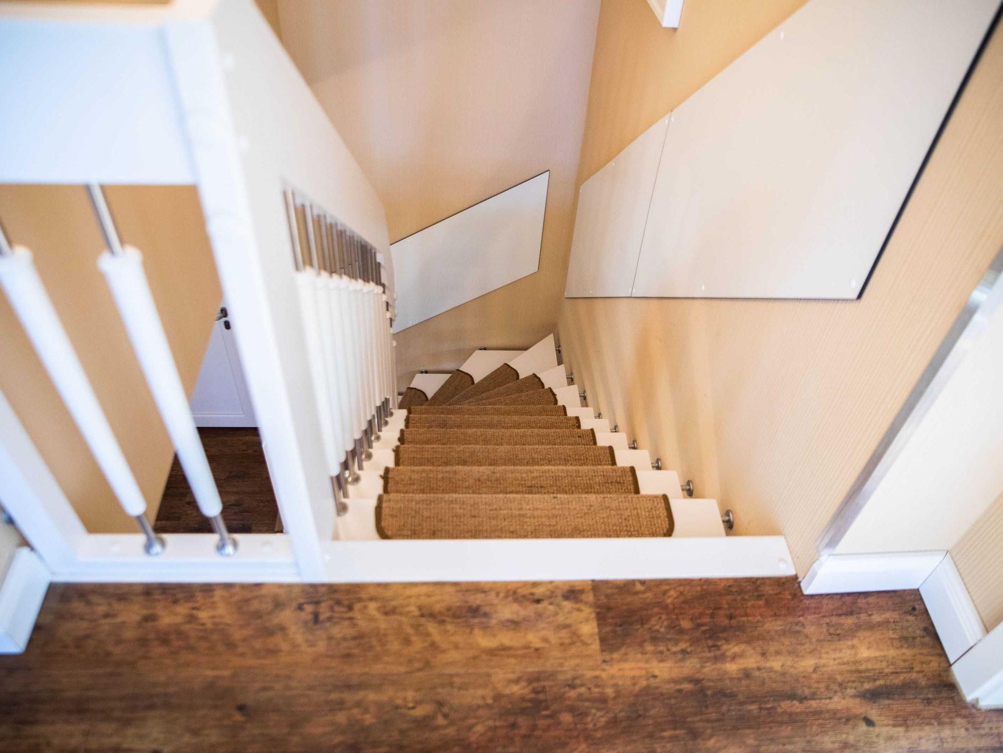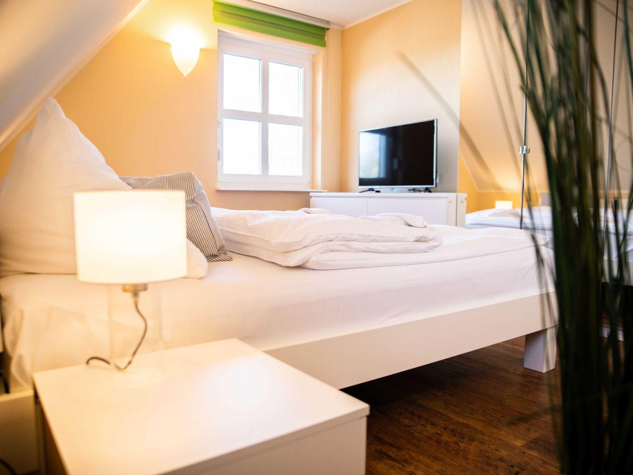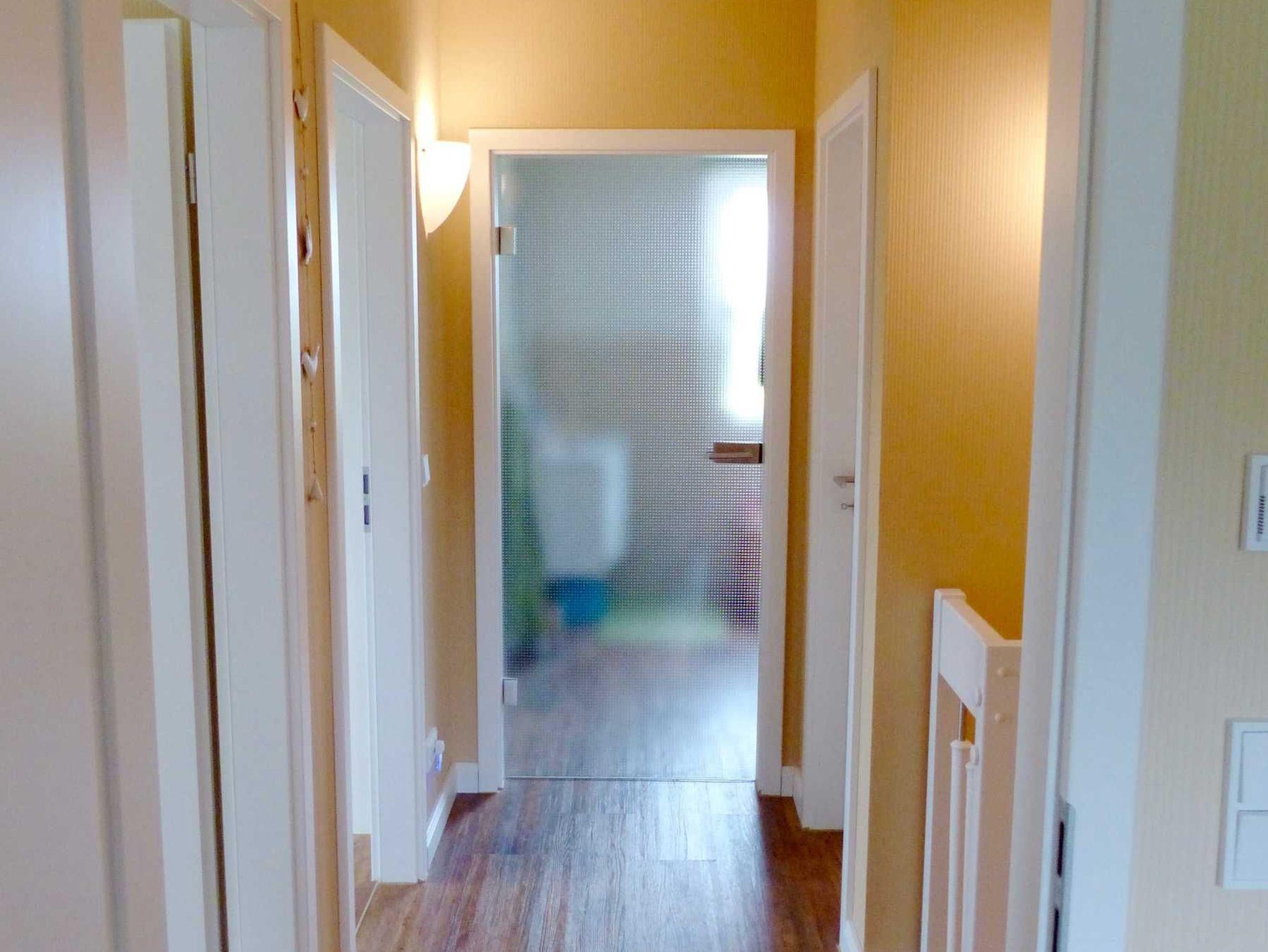 Die drei Schlafzimmer befinden in der oberen Etage. Zwei haben jeweils ein Doppelbett (2m x 2m) mit Nachttischen, einen Kleiderschrank und eine Kommode. Das dritte Schlafzimmer hat zwei Einzelbetten (100 x 200 cm) mit Nachttischen, Kleiderschrank und Kommode. In allen Schlafräumen sind Fernseher mit SAT-TV vorhanden. Für unsere kleinen Gäste stehen zudem ein Kinderreisebett und ein Kinderstuhl bereit. Im Haus befinden sich zwei Badezimmer jeweils ausgestattet mit Dusche und WC. Zusätzlich befindet sich eine Sauna im EG-Bad und eine Badewanne im OG-Bad.