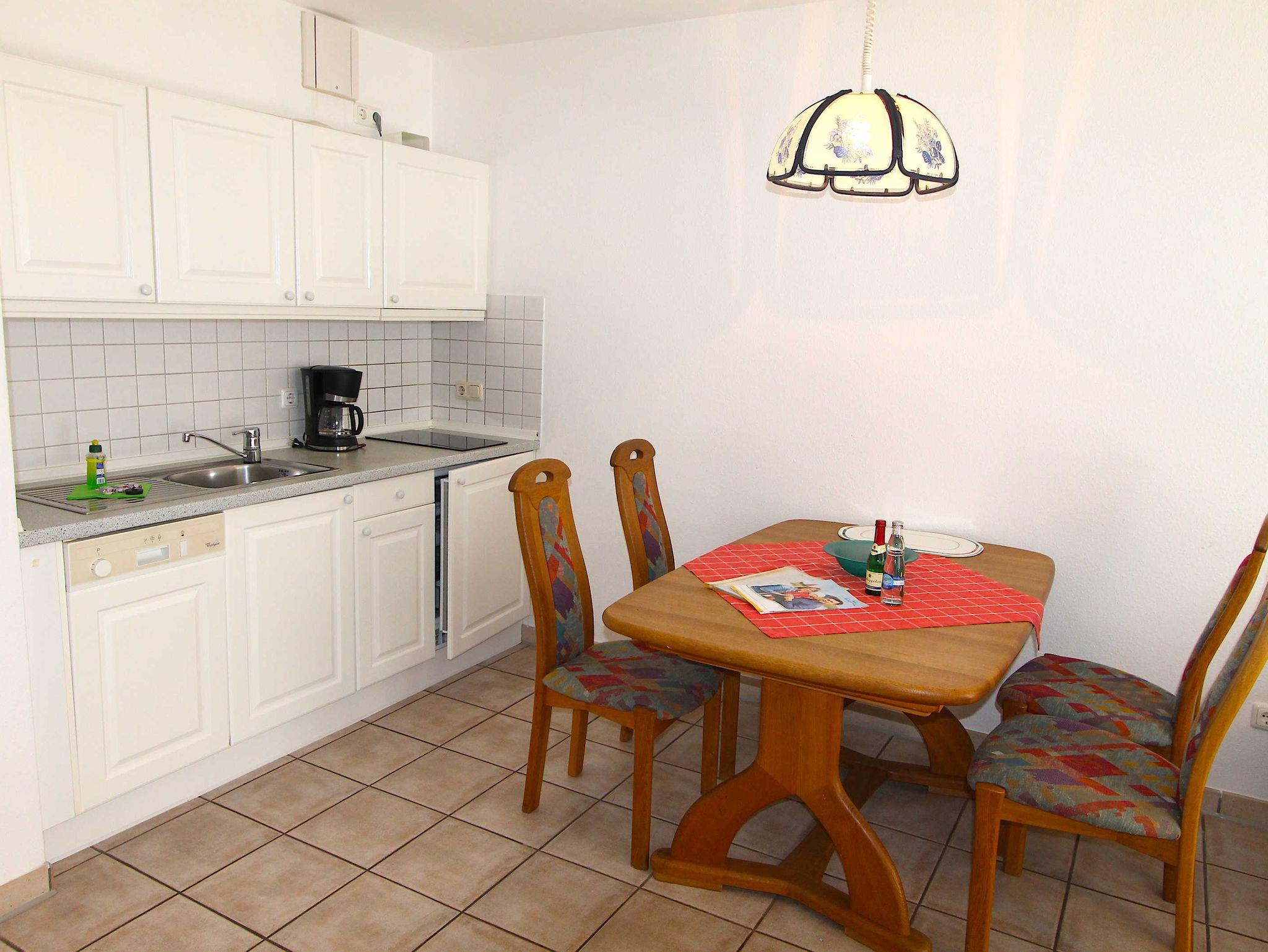 Darin integriert ist der Essbereich mit Tisch und Stühlen sowie Küchezeile mit Geschirrspüler, Kühlschrank, 2- Plattenkochfeld und weiteren elektrischen Geräten, Geschirr, Besteck und Töpfen.