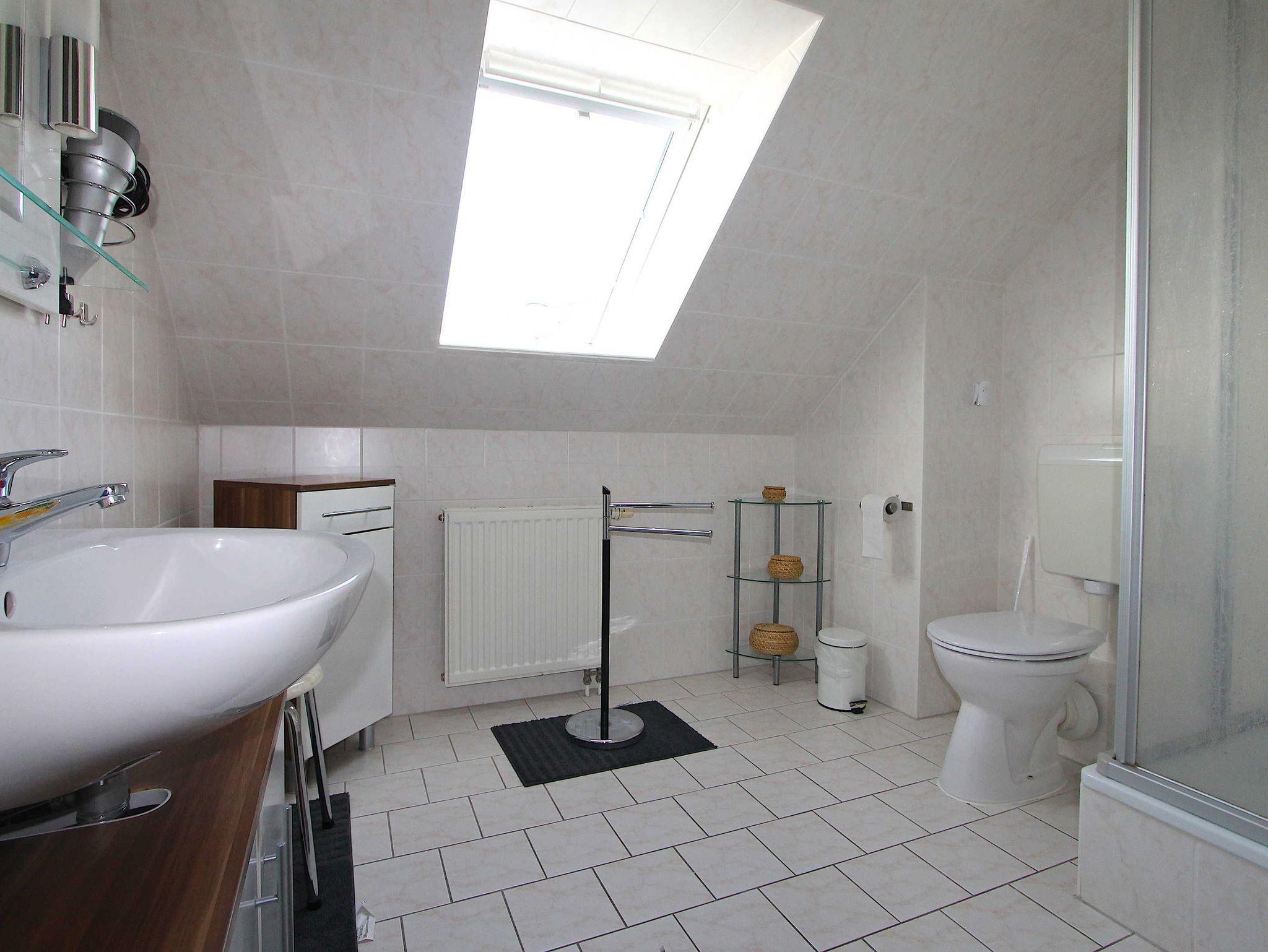 Ebenfalls im Obergeschoss befindet sich das Badezimmer mit Dusche, WC.