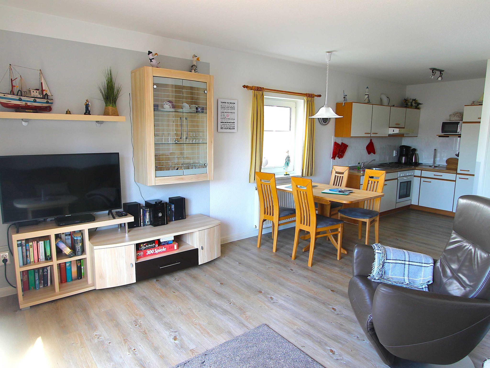 Darin integriert ist der Essbereich mit Esstisch und Stühen sowie die komplett ausgestattete Küchenzeile mit Herd- Backofen, Kühlschrank mit Gefrierfach sowie Geschirrspüler und vielem mehr.