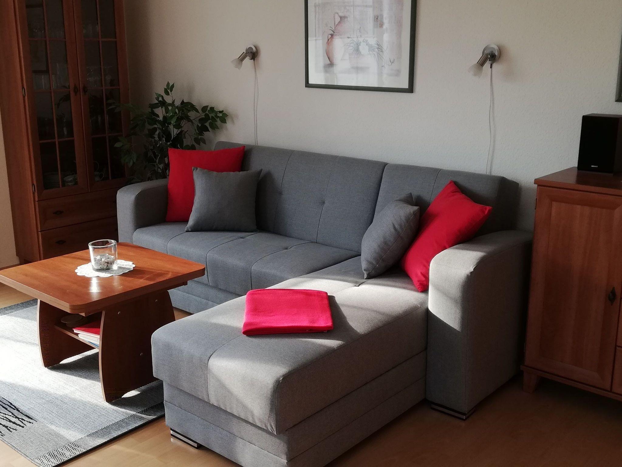 Die Wohnung ist für max. 4 Personen gut geeignet. Sie umfasst ein helles, sonniges Wohnzimmer mit integrierter Pantryküche, ein Schlafzimmer mit Doppelbett, ein Kinderzimmer mit Doppelstockbett, in dem auch Erwachsene reichlich Platz finden, sowie ein Bad mit Dusche und Fenster. An der Westseite mit Zugang vom Wohnzimmer befindet sich der Balkon. Alle Zimmer sind über einen geräumigen Korridor erreichbar.