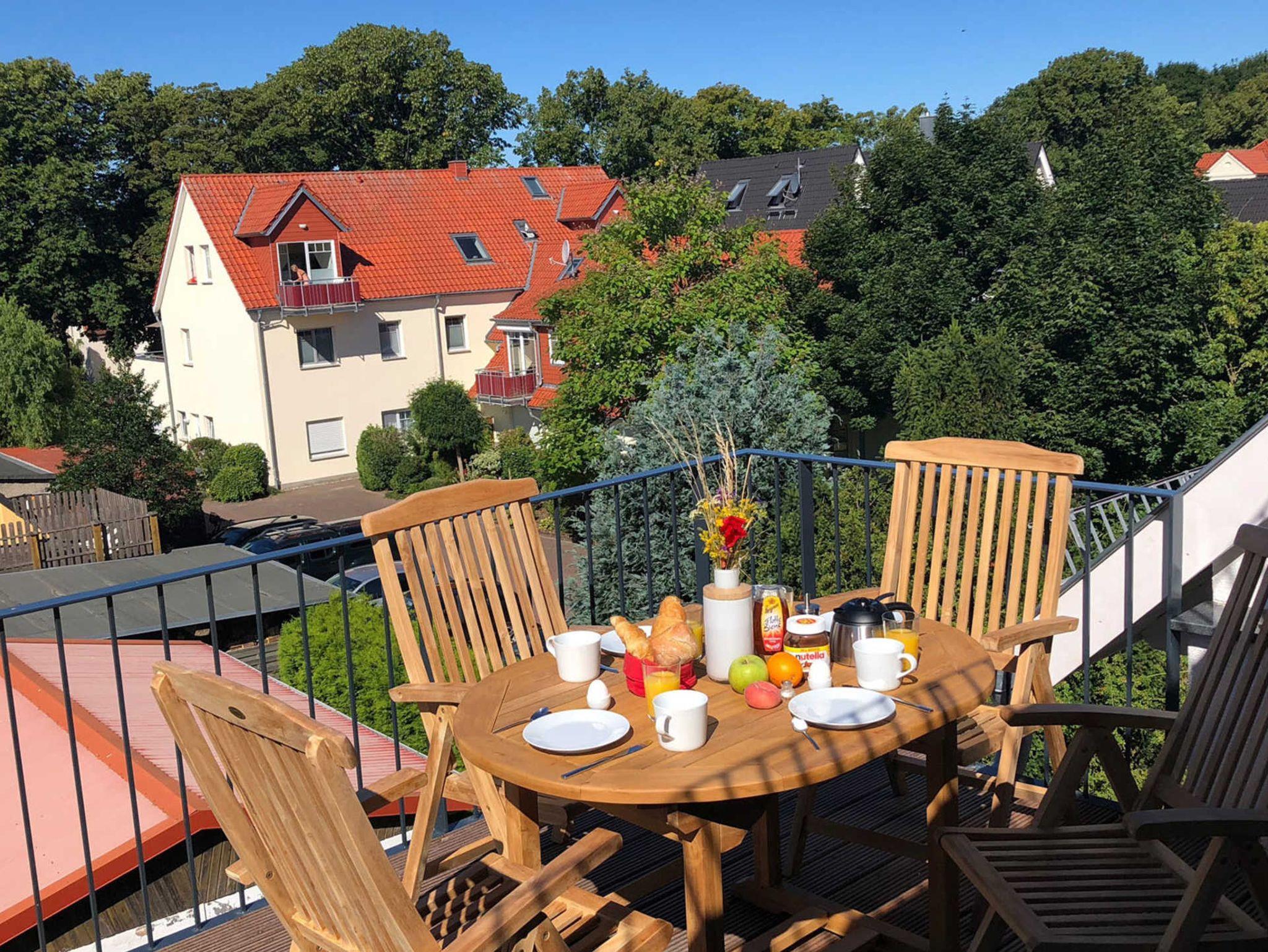 Von dort kommt man auf den großen Sonnenbalkon, auf dem man frühstücken, den Tag verbringen oder abends bei einem Glas Wein den Sonnenuntergang genießen kann. Wo man sogar das Meer rauschen hört.