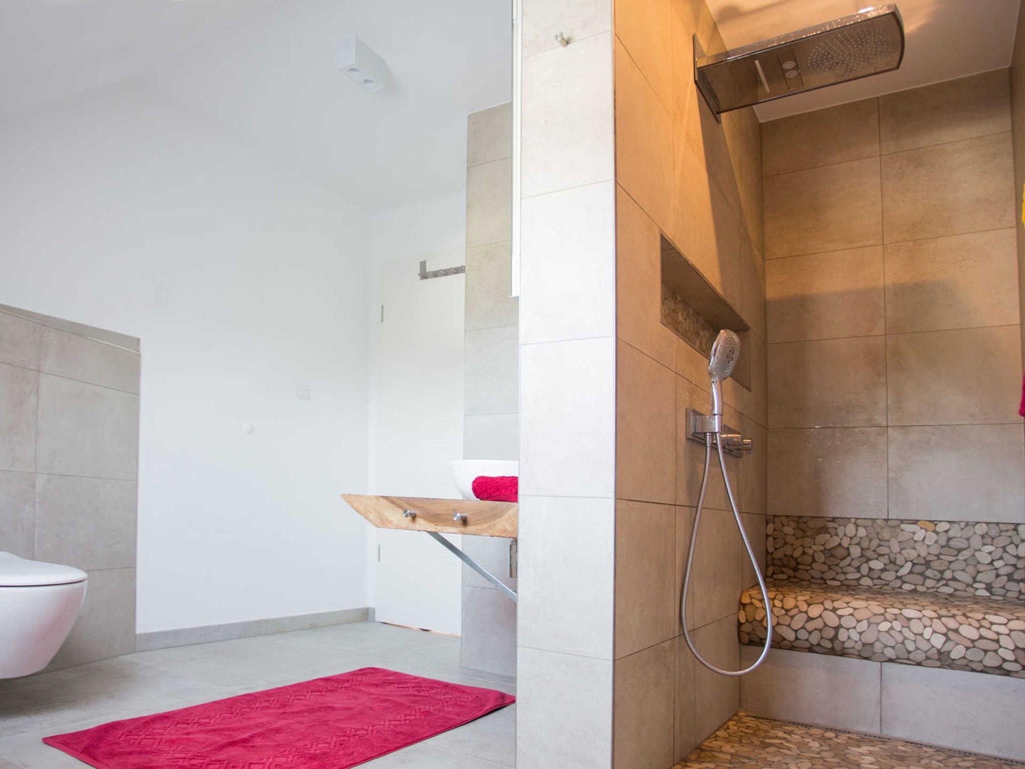 Das Badezimmer ist individuell mit einem Waschtisch auf einer großen massiven Baumscheibe eingerichtet. Die offene Dusche hat eine Sitzbank.
