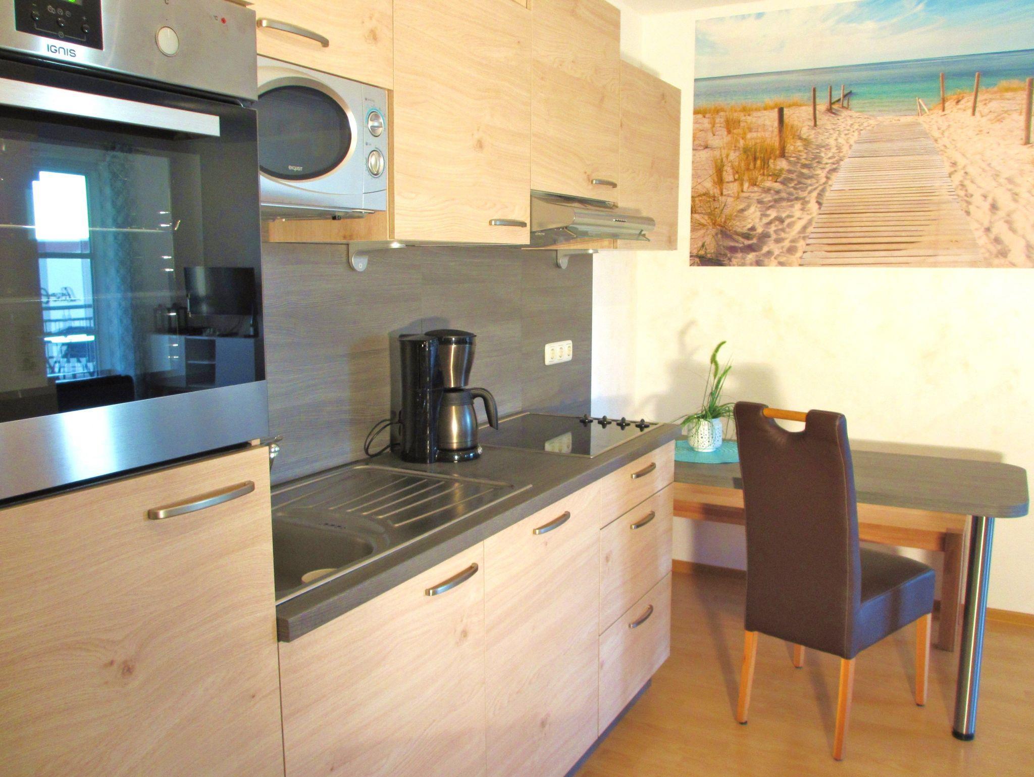 Neue moderne Küche und Esstisch mit 3 Stühlen und Sitzbank. Badezimmer mit Dusche und Föhn.