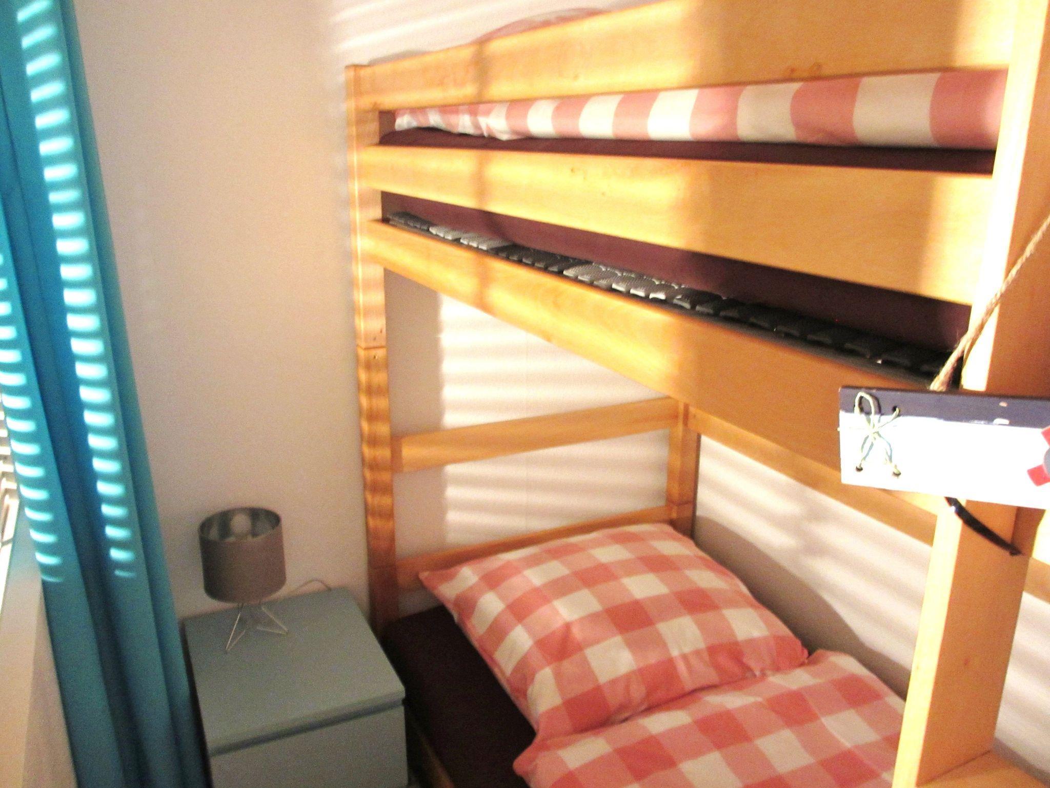 Ausgestattet mit großem möblierten West-Balkon, Schlafzimmer mit Doppelbett (1,80*2,00m), Kinderzimmer (Raum-im-Raum, siehe Fotos) mit Etagenbetten (0,90*2,00m, auch für Erwachsene geeignet).