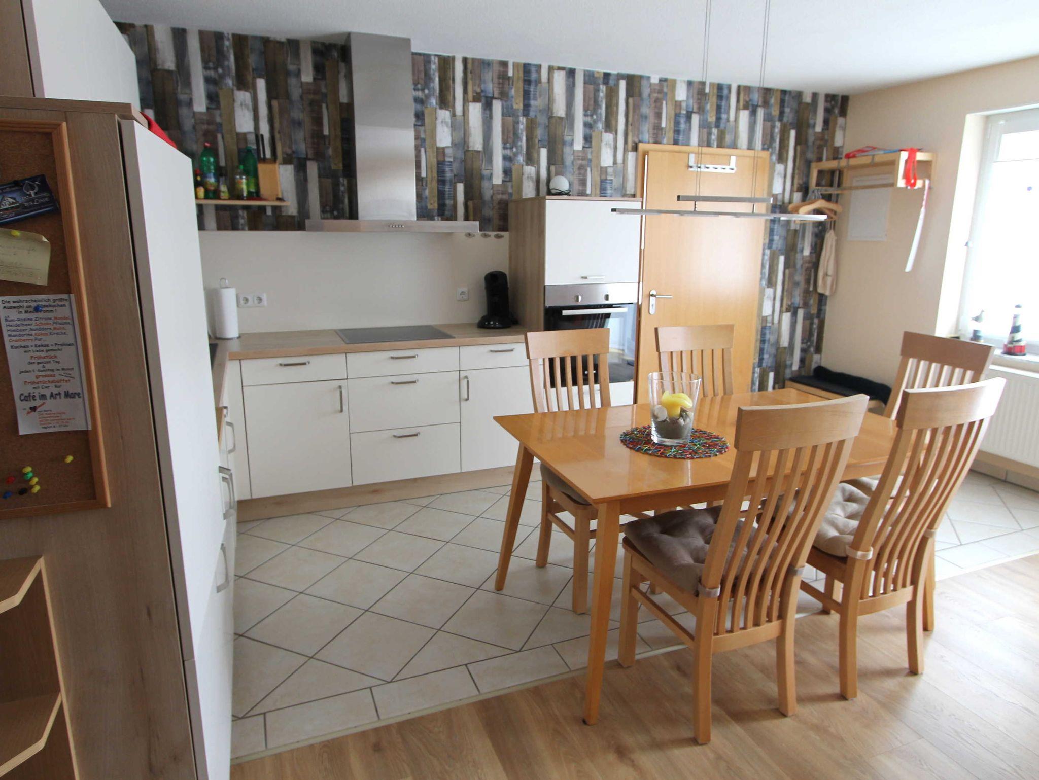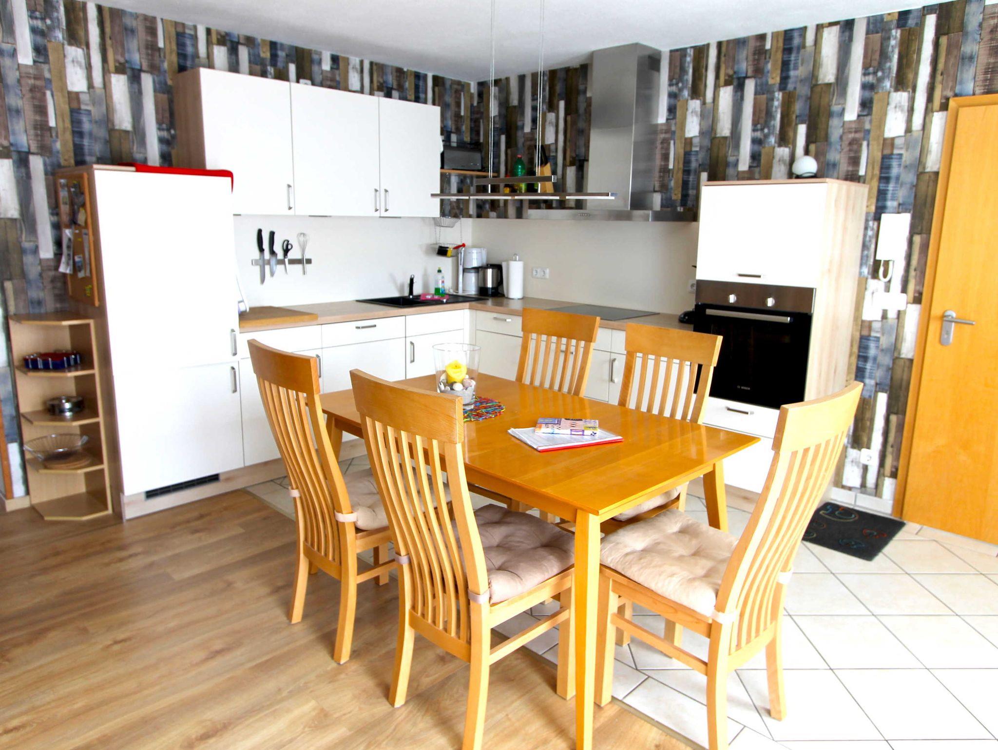 Die zum Wohnraum offene Küche ist komplett ausgestattet mit Herd- Backofen, Geschirrspüler, Kühlschrank, Gefrierschrank, Kaffeemaschine, Wasserkocher und Toaster. Der Essbereich ist in die Küche integriert.