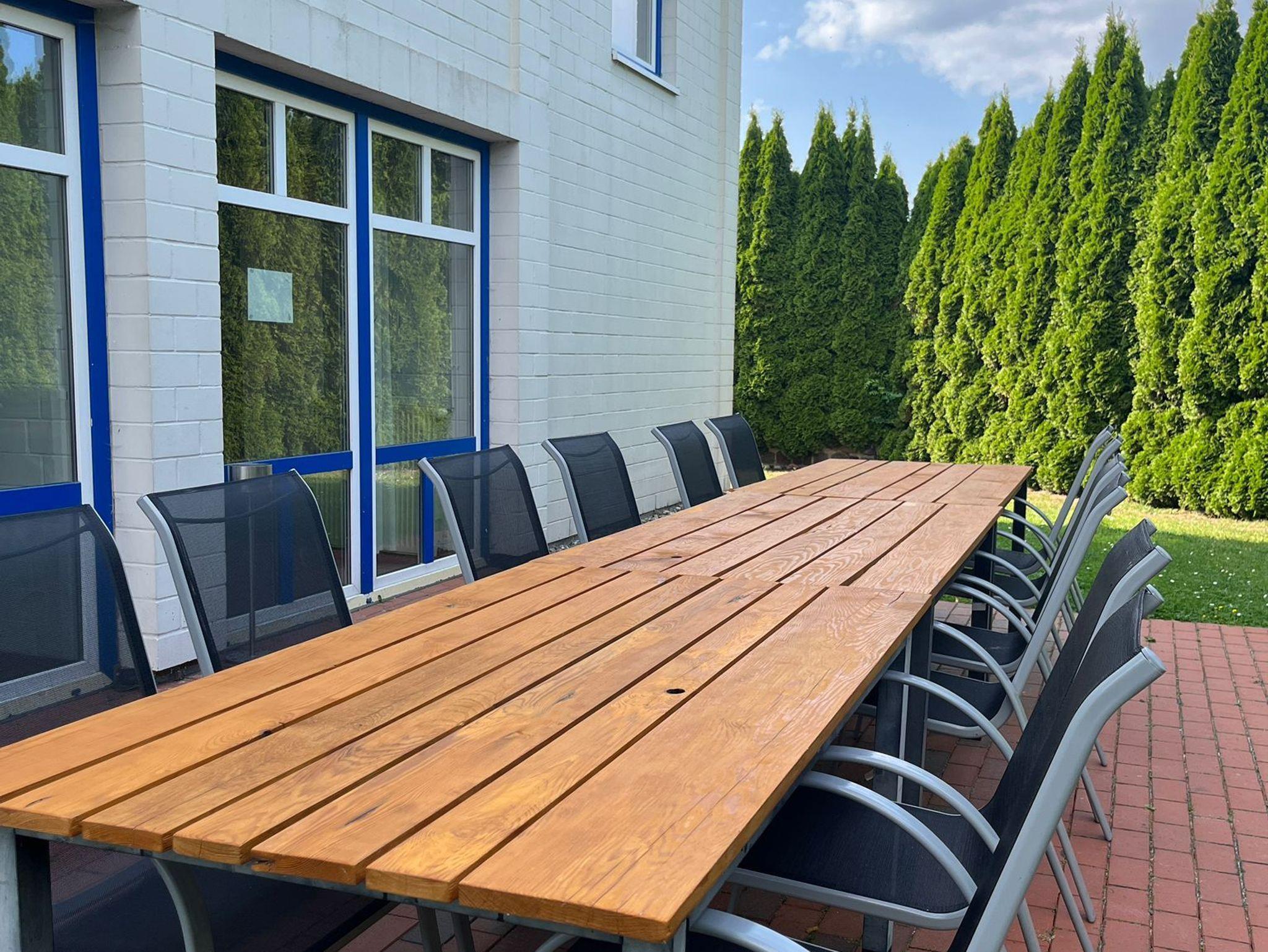 Indoor-Spielhalle mit Billard, Tischkicker und Tischtennis. Sichere Unterbringung von Motorrädern, Fahrrädern und Autogepäckträgern in benachbarter Bikegarage. Eigene Parkplätze kostenlos am Haus. Grünfläche mit eigener Terrasse mit Gartenmöbeln. Hecke zur Straße für Sichtschutz.
