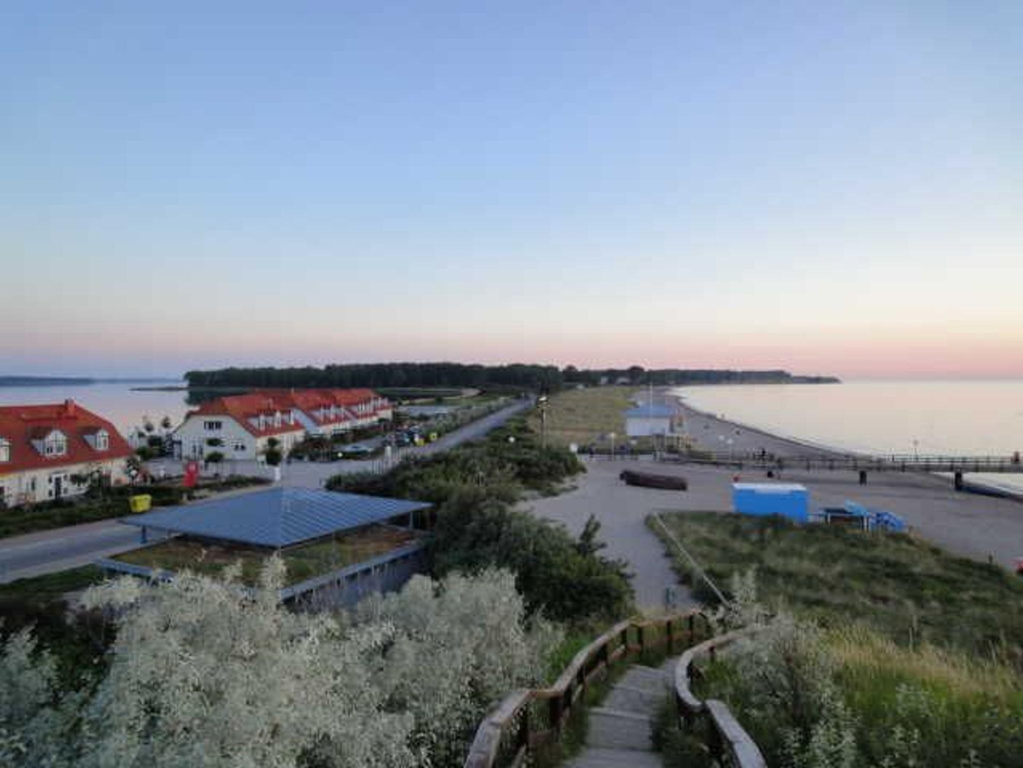 Der Strand ist 500m am Fuße der Steilküste zu entdecken. Ein belebter, breiter Sandstrand an der Seebrücke mit Strandkorb-, Fahrrad- und Bootsverleih sowie vielfältiger Gastronomie und kleinen Geschäften ist 1000m entfernt. Das Salzhaff, eine flache, idyllische Ostseebucht mit Bootsverleih und Wassersportcenter ist ideal für Surf-, Segel- und Kitesurf-Anfänger. Busbahnhof, Fahrradverleih, Frisör, Post, Bank, Supermarkt und Geschäfte sowie der beliebte Haffplatz mit Café, Restaurants, Yachthafen und Seebrücke entlang der Strandpromenade ist 20 Fußminuten entlang der Küste erreichbar.