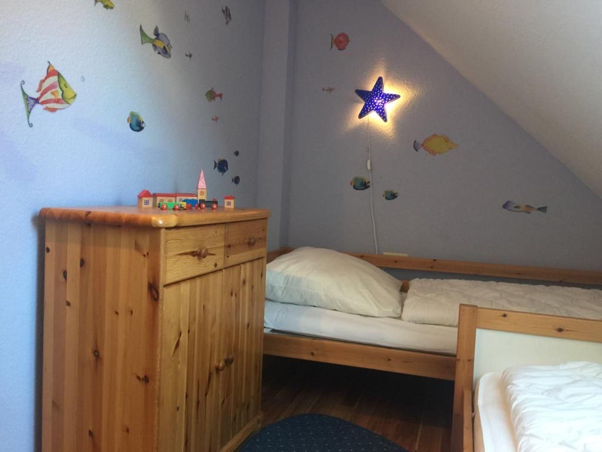 Kinderfreundlich ausgestattete Nichtraucher-Ferienwohnung auf 2 Etagen. Im durchgängig gefliesten Parterre liegt das Duschbad mit Fenster. Die Küchenzeile verfügt über eine moderne und umfangreiche Ausstattung, der Essbereich fügt sich harmonisch in den Küchenbereich ein. An das gemütlich gestaltete Wohnzimmer schließt sich ein möblierter Südbalkon mit Haffblick an. Im Flurbereich befindet sich ein separater Abstellraum. Der obere Wohnbereich ist komplett mit Laminat ausgelegt, dort befinden sich 2 separate Schlafzimmer (1x1 Doppelbett, 1x2 Einzelbetten) und eine Relaxecke. Ein Wäschepaket ist mietbar für 20.00 Euro/Pers.