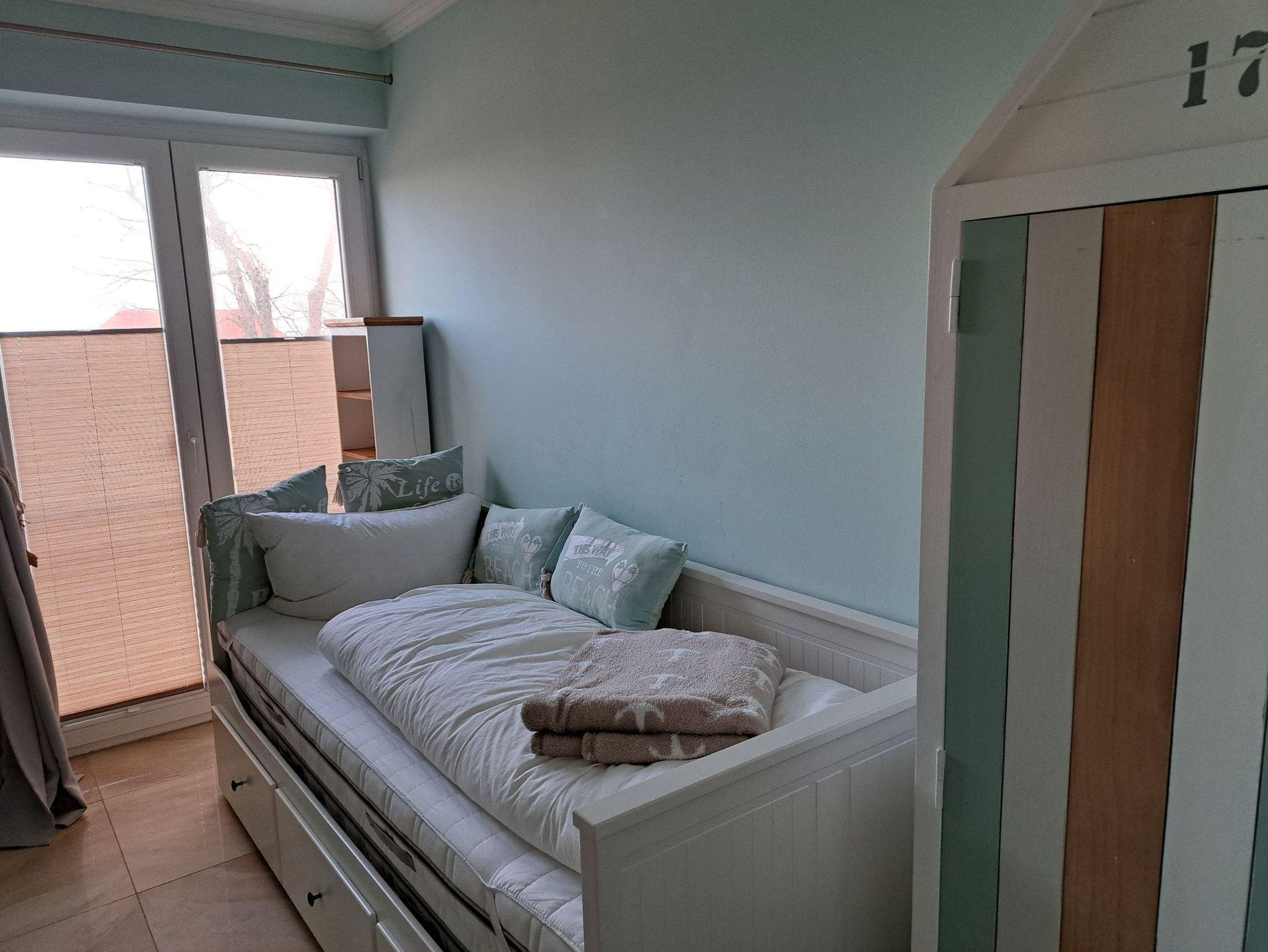 2 Schlafzimmer, ein französisches Doppelbett der Breite 1.50m und Länge 2.00 m, das Kinderzimmer verfügt über ein Einzelbett 0,80 m x 2,00 m, Tiefgaragen- Stellplatz. Kostenlose Benutzung von