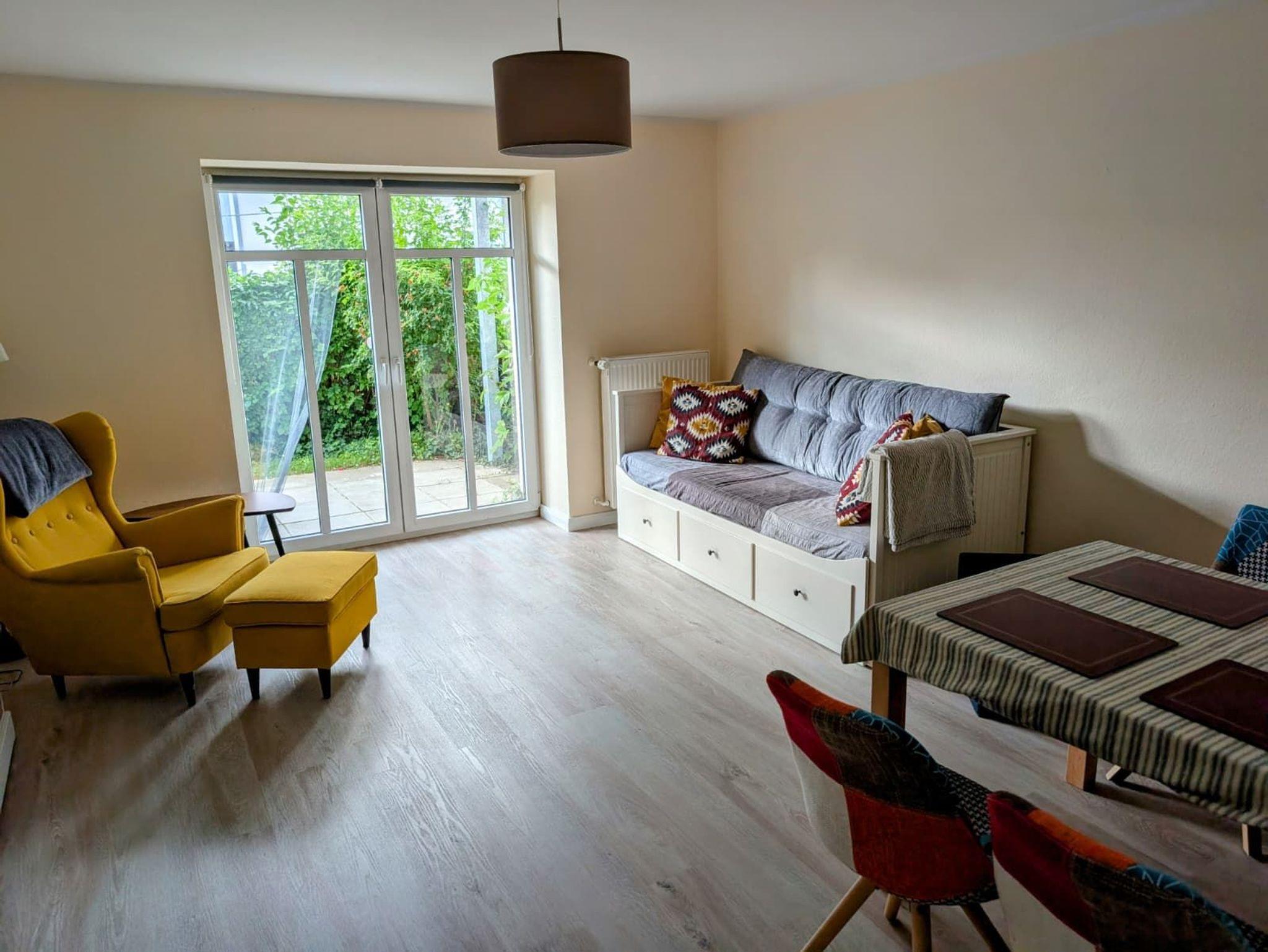 Die Adlon Ferienwohnung befindet sich in einer ruhigen Wohnanlage im Erdgeschoss und bietet neben der Terrasse auch einen kleinen Garten. Ideal für Paare oder Familien mit kleinen Kindern. Der Wohnzimmer verfügt über einen Essbereich, eine Schlafcouch (zum Doppelbett ausziehbar) und eine gemütliche Leseecke. Internet TV, Blue Ray Player und W-LAN stehen Ihnen als unser Gast selbstverständlich zur Verfügung. Das Schlafzimmer mit Boxspring Doppelbett kann als Twin Zimmer oder klassisches Doppelzimmer konfiguriert werden. Zwei Stapelbetten zur Aufbettung bieten Komfort, speziell für Kinder. Die vollwertig ausgestattete Küche bietet neben Herd und Ofen auch einen Geschirrspüler und eine Waschmaschine. Das Bad mit WC und Dusche bietet einen Haartrockner. Zur Wohnung gehört ein Schuppen, in dem neben einem Beach Bike auch ein praktischer Strand-Trolley, Sonnenschirm und Strandwindschutz zu finden sind. Für die Terrasse stehen Gartenmöbel zur Verfügung.