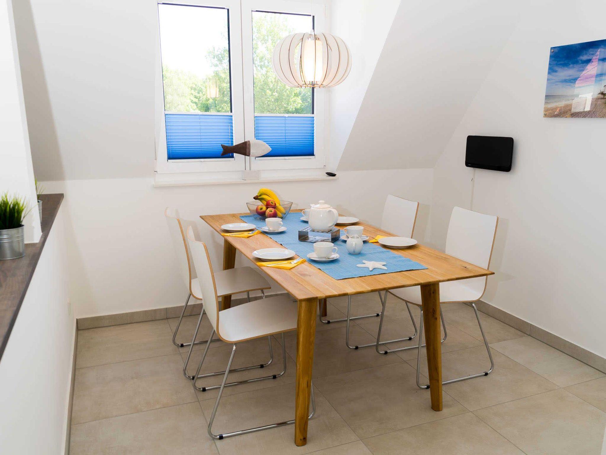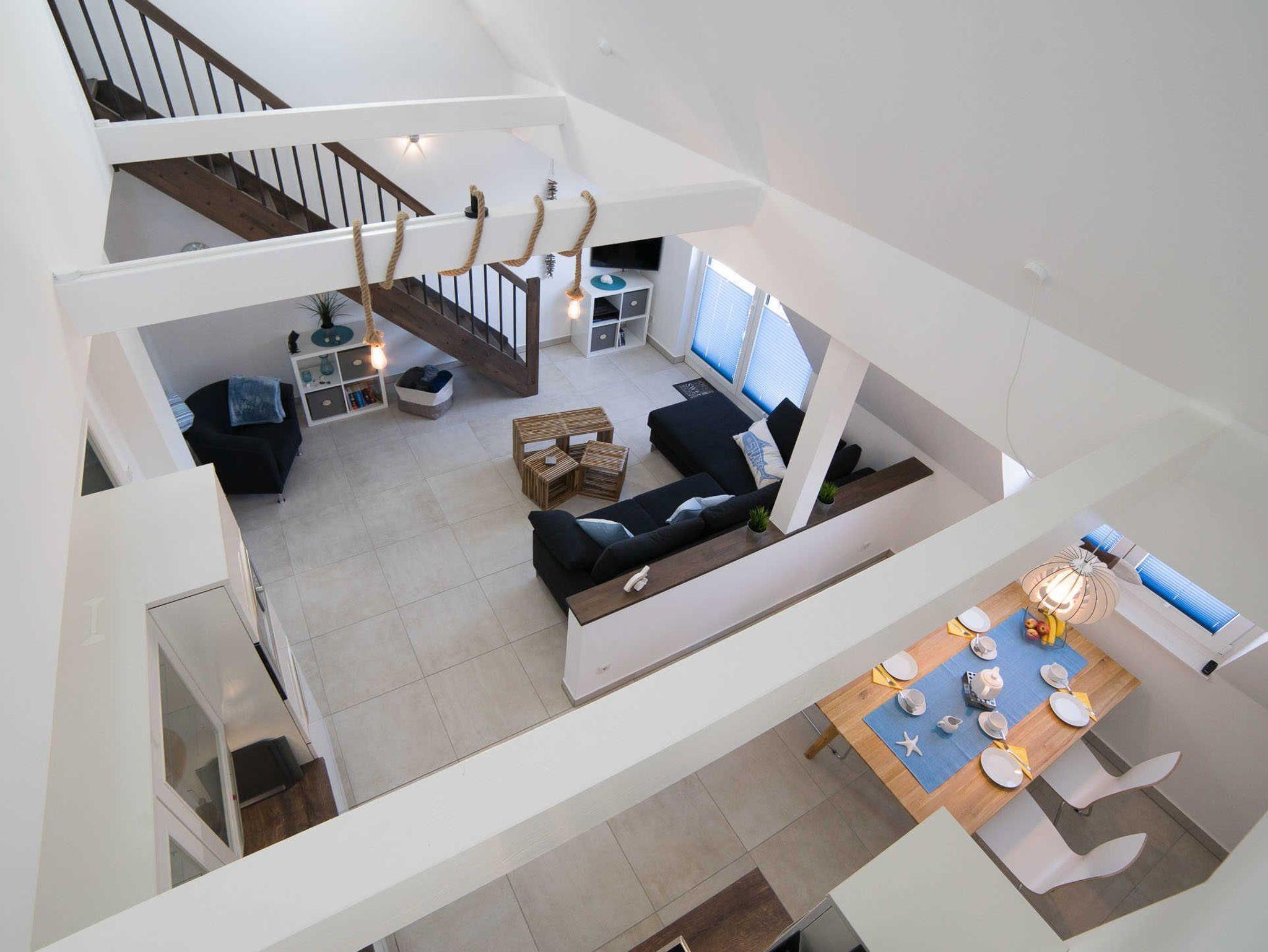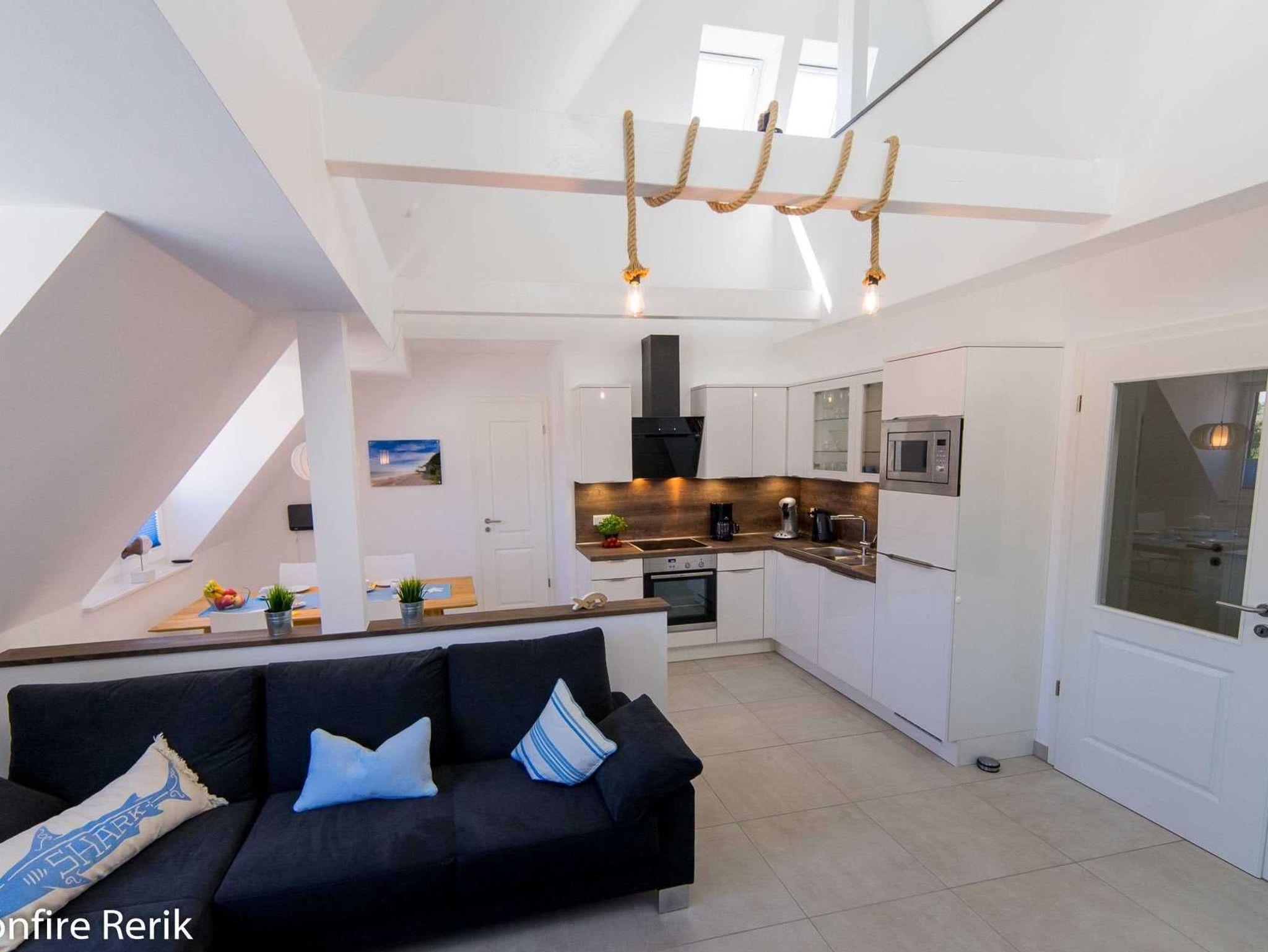 Über den Dächern von Rerik, im Obergeschoss des Hauses Blinkfüer, liegt Ihr Urlaubsdomizil. Die Galerie-Ferienwohnung „Bonfire“ ist großzügig und offen geschnitten, maritim und modern eingerichtet. Der offene Wohnraum bietet viel natürliches Licht und über 5 Meter Raumhöhe. Hier finden Sie eine voll ausgestattete Küche, einen großzügigen Essplatz und eine gemütliche Couchecke.