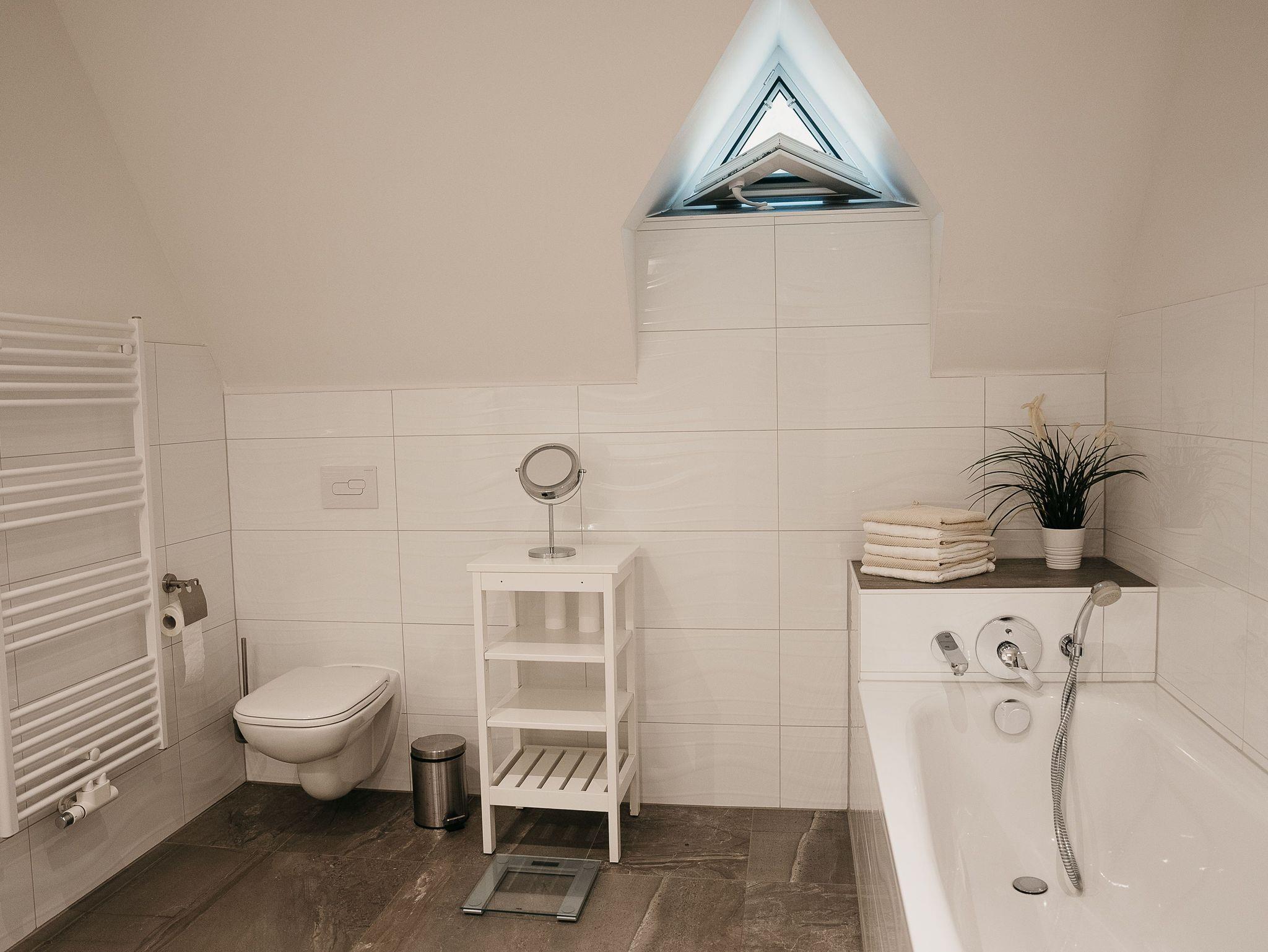 Das hat 2 Bäder, im Erdgeschoss befindet sich ein Saunabad mit einer bodengleicher freibegehbarer Dusche. Das exklusive Bad im ersten 1.EG mit Badewanne, bodengleicher Dusche lädt zum relaxen ein.