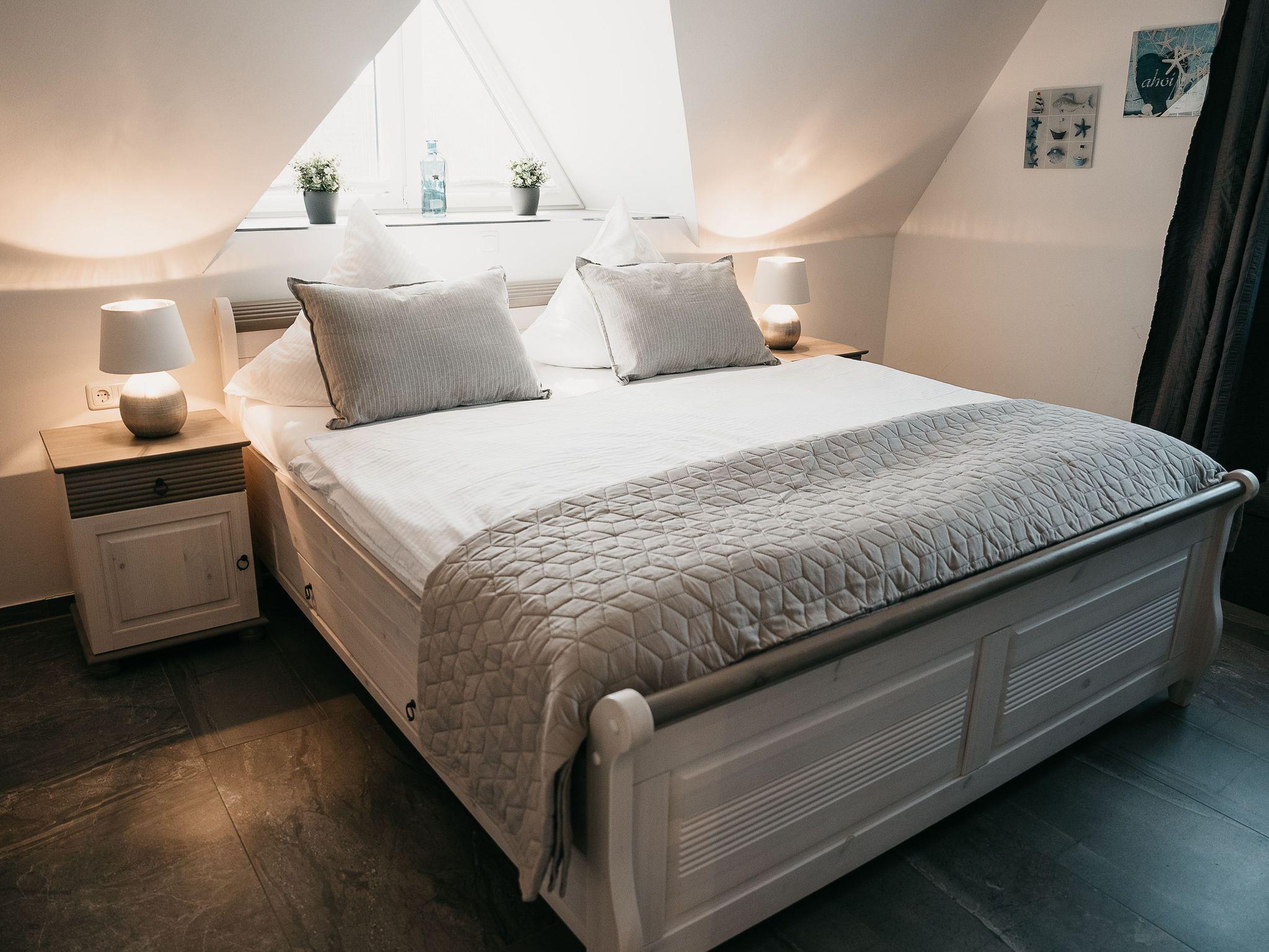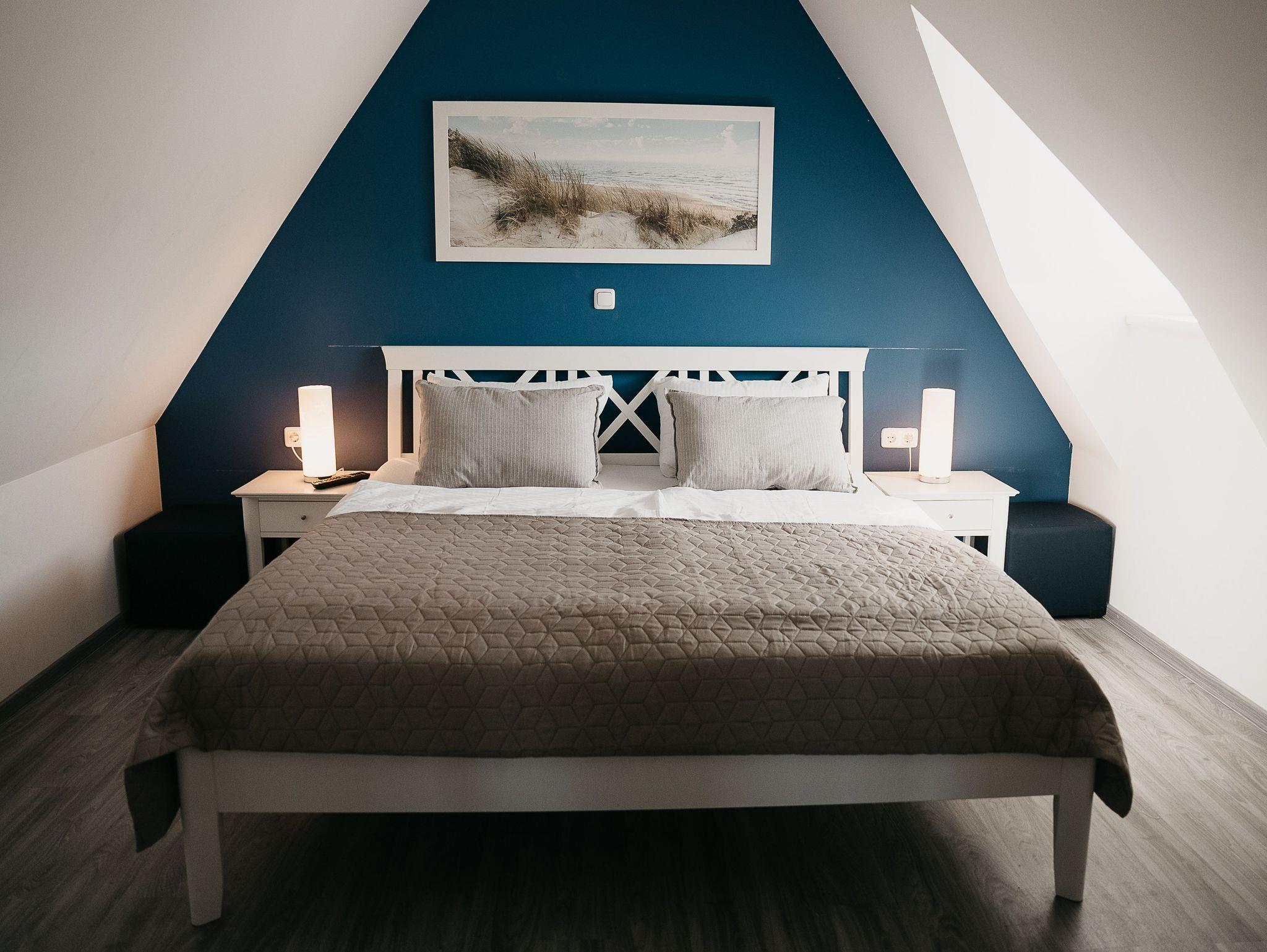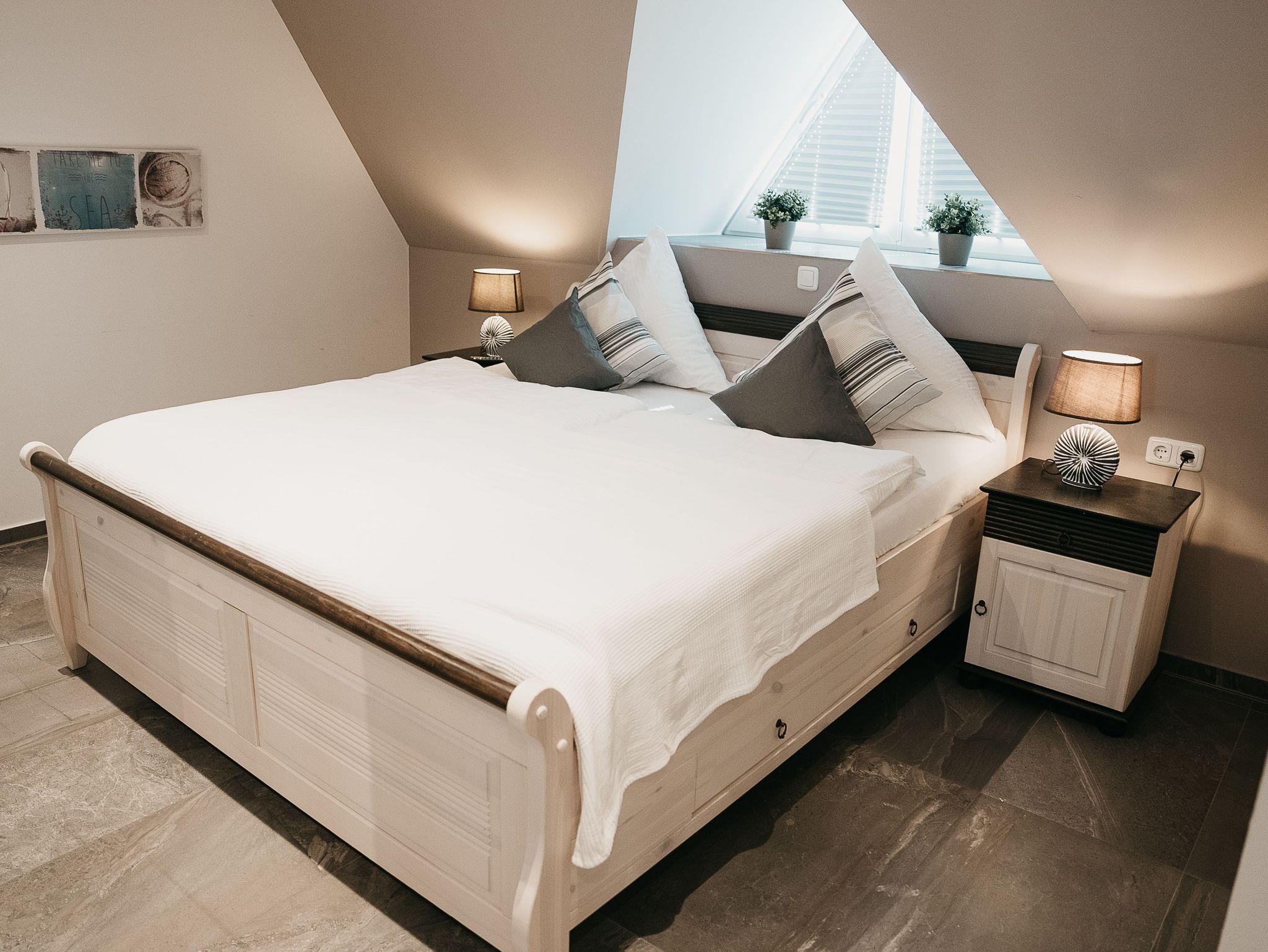 Der Hauseingang befindet sich auf der Nordseite, Sie parken direkt neben dem Haus. Zwei Stellplätze (hintereinander) stehen Ihnen zur Verfügung. Weitere öffentliche Parkplätze können im Osteeferienpark kostenlos genutzt werden. Das Haus hat 5 Schlafzimmer, 4 Schlafzimmer davon haben ein Doppelbett(180x200 cm), Nachtkonsolen, Kleiderschrank und eine Sat-TV Anlage. 1 Schlafzimmer hat zwei Einzelbetten (90x200 cm) sowie ein Schreibtisch und eine Sat- Anlage. Alle Betten sind mit verstellbaren Lattenrost an Fuß- und Kopfteil ausgestattet.