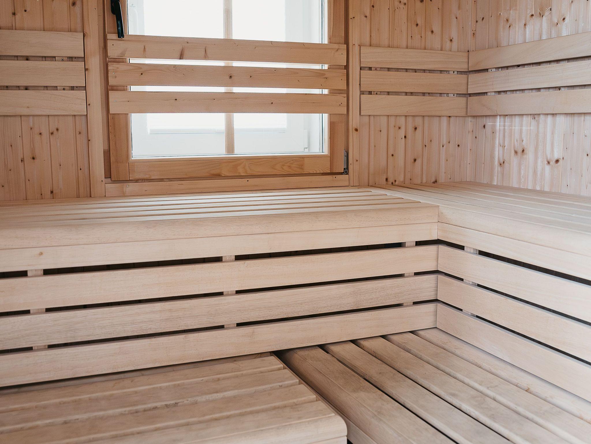 Saunabad im Erdgeschoss, mit bodengleicher Dusche, Wc und Waschbecken.