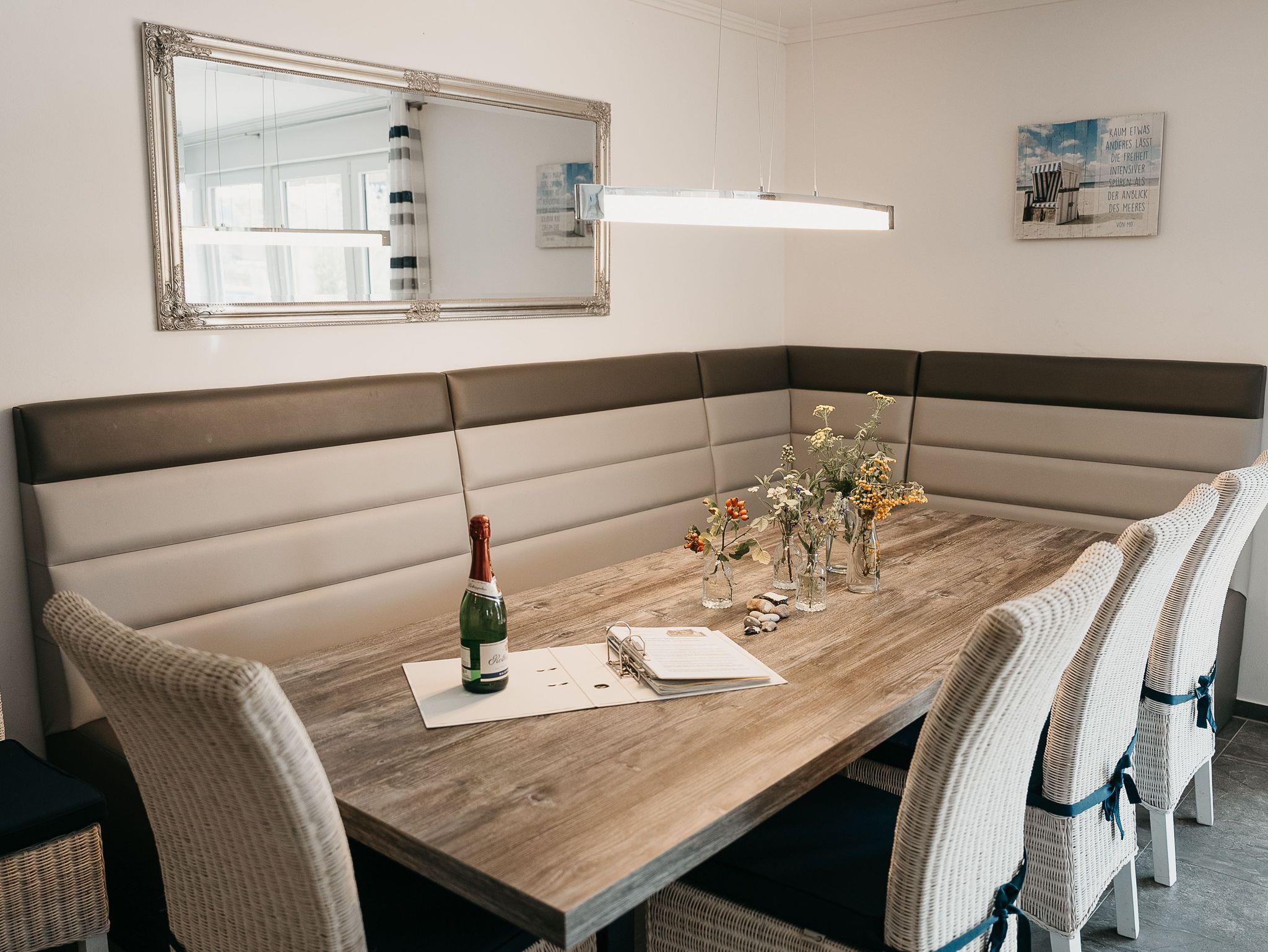 Für gesellige Abende eignet sich bestens unsere großzügige Essecke. Für unsere kleinen Gäste steht ein Kinderhochstuhl und ein Reisebett bereit.