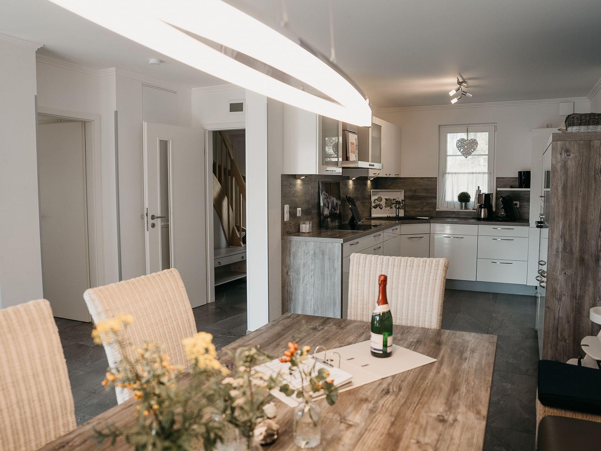 Die vollausgestattete Einbauküche läßt keine Wünsche offen, hier werden Sie sich auf das gemeinsame Kochen freuen. Induktionsherd, Dunstabzug, Backofen, Spülmaschine, Waschmaschine, großer Kühlschrank, Filterkaffeemaschine, Senso Padmaschine sowie diverse weitere Elektrokleingeräte, alles vorhanden.