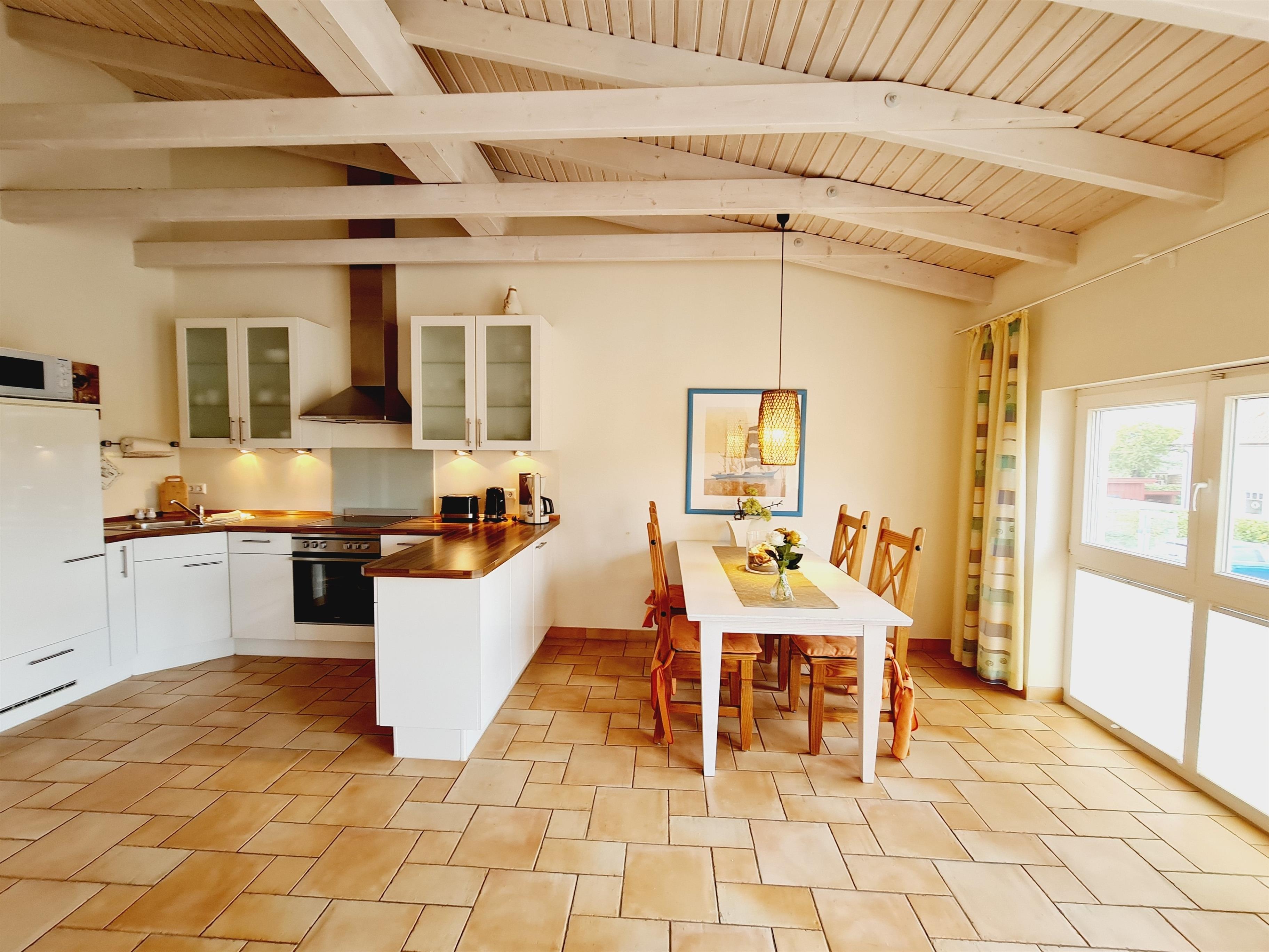 Offene, helle Wohnküche mit Esstisch, gemütlicher Sofaecke, TV und Zugang zum Balkon