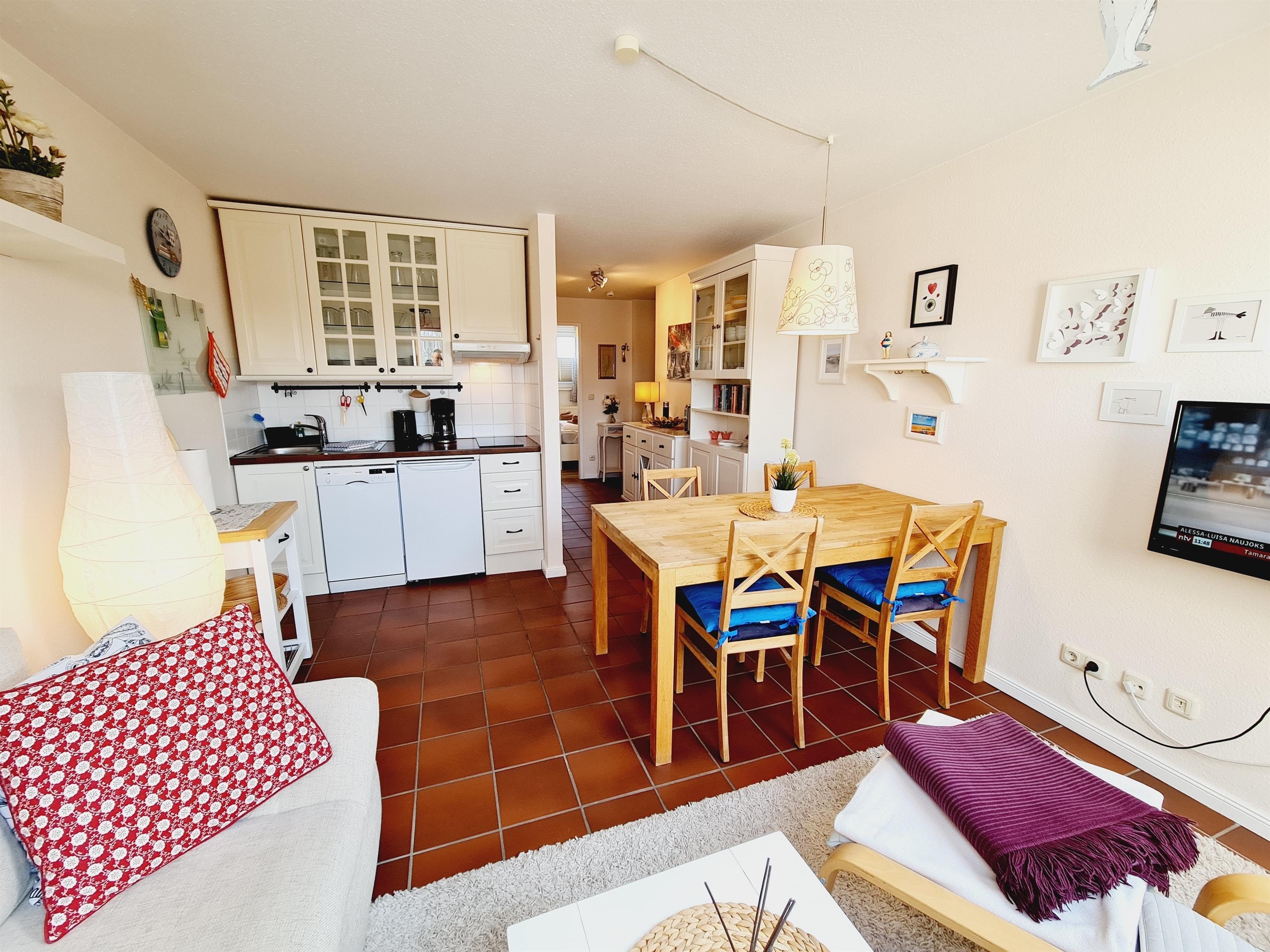 1 Offene, helle Wohnküche mit Esstisch, gemütlicher Sofaecke und TV