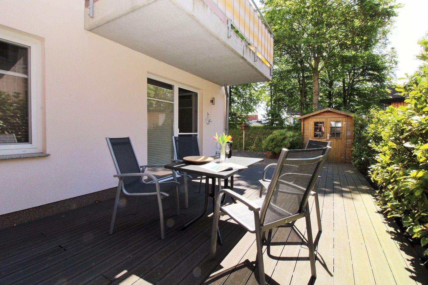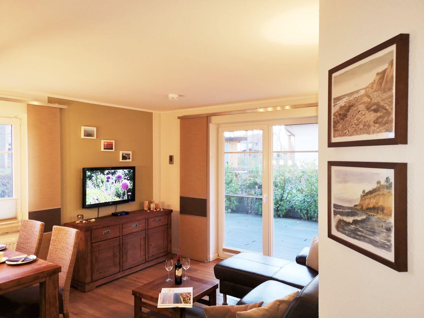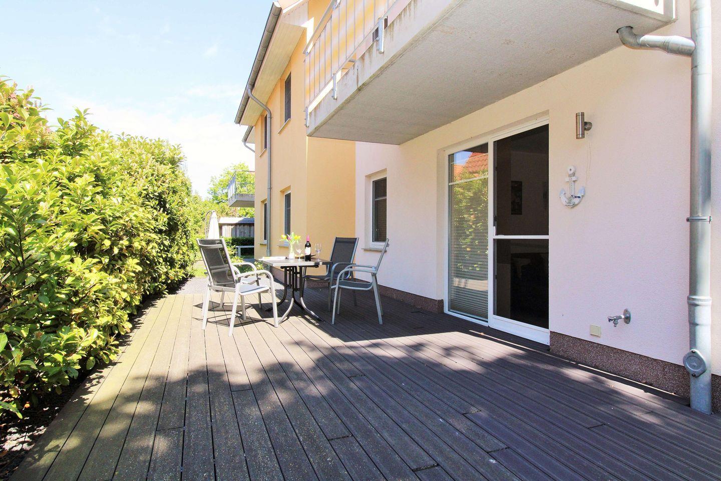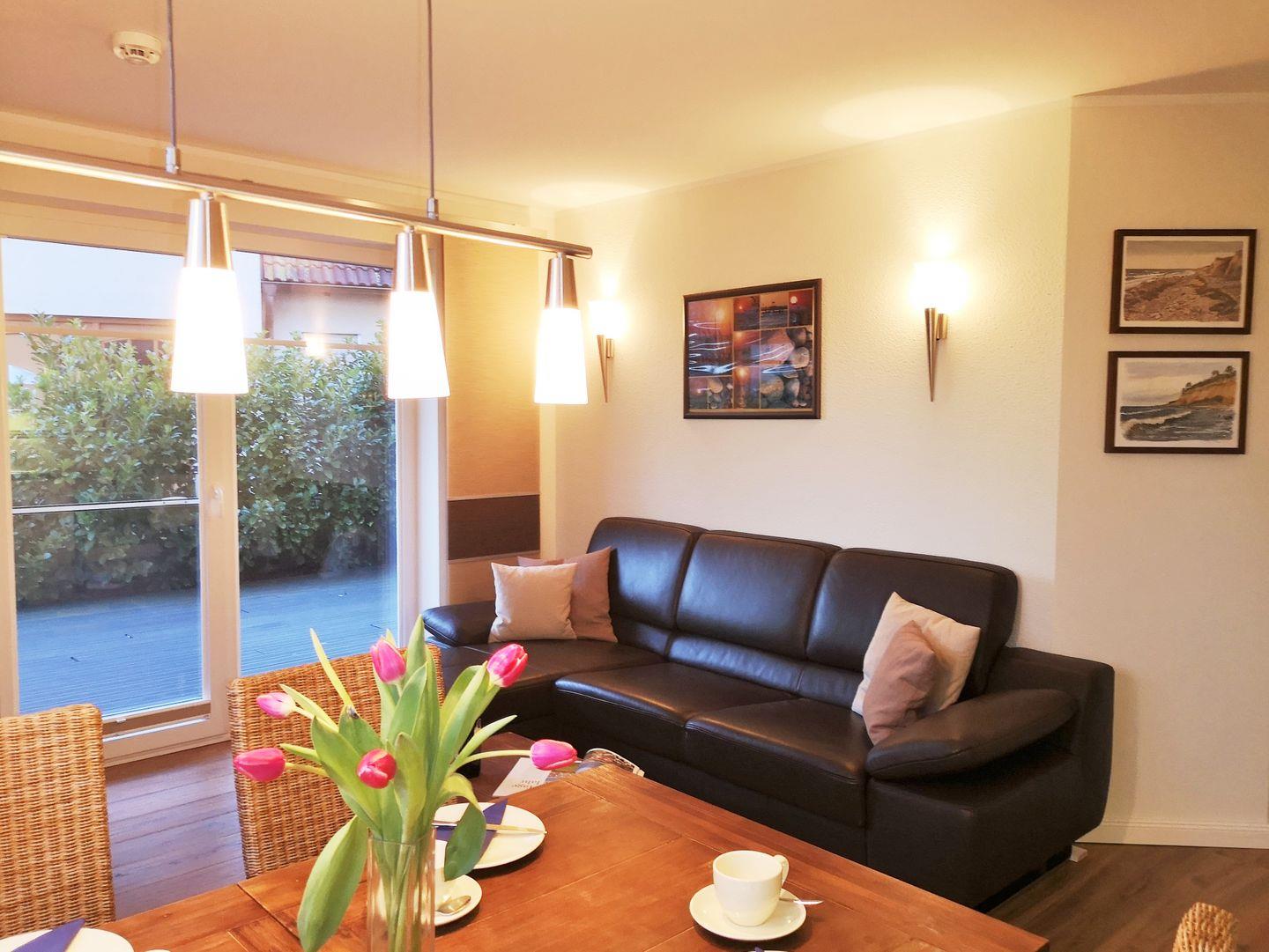 Das geräumige und modern eingerichtete Wohn-/Esszimmer verfügt über eine separate Sitzgruppe mit bequemer Eckcouch und Couchtisch, einen separaten Esstisch mit 4 Stühlen sowie ein Sideboard. Vom Wohnzimmer aus haben Sie direkten Zugang zu der ca. 20 m² großen, sonnigen sowie teilweise überdachten Terrasse (nach Süden und Westen ausgerichtet) mit bequemen Terrassenmöbeln und kleinem Gartenanteil. Hier sitzen Sie entspannt und gemütlich im Grünen und können abends bei einem guten Glas Wein in Ruhe die lauen Sommernächte genießen!