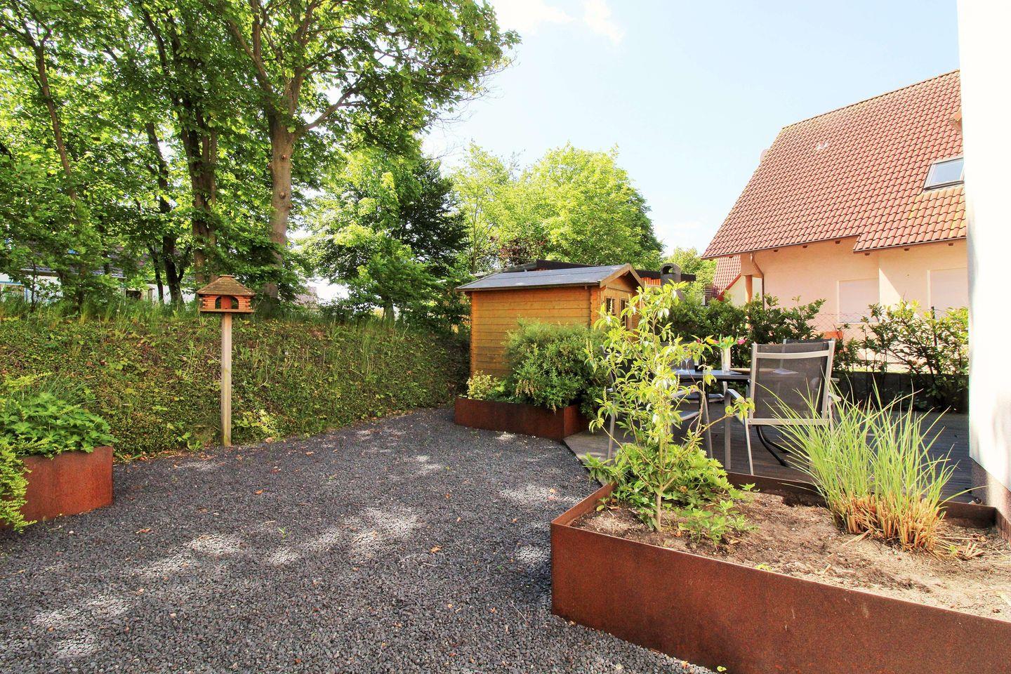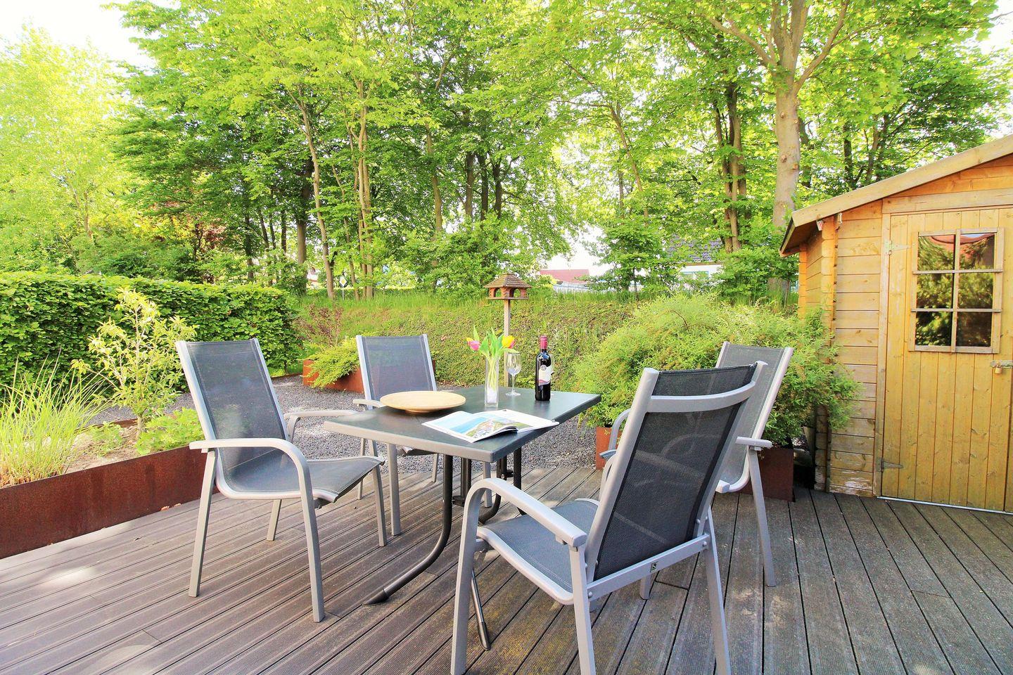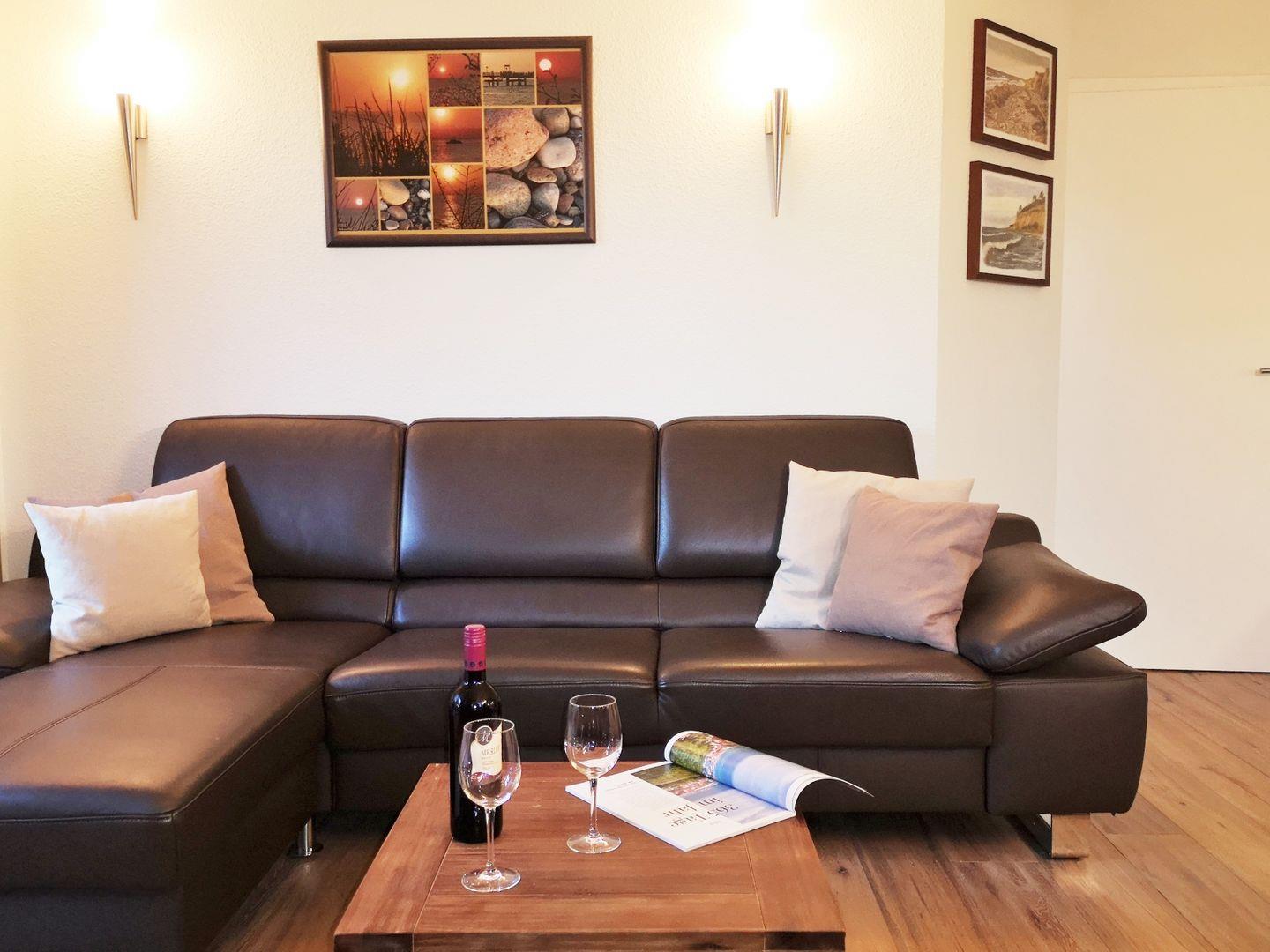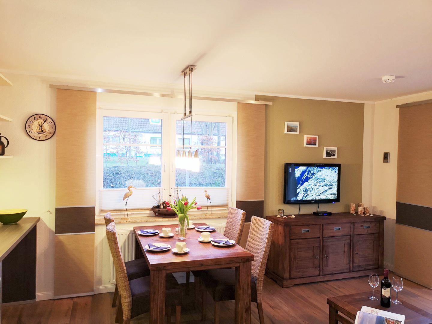 Das geräumige und modern eingerichtete Wohn-/Esszimmer verfügt über eine separate Sitzgruppe mit bequemer Eckcouch und Couchtisch, einen separaten Esstisch mit 4 Stühlen sowie ein Sideboard. Vom Wohnzimmer aus haben Sie direkten Zugang zu der ca. 20 m² großen, sonnigen sowie teilweise überdachten Terrasse (nach Süden und Westen ausgerichtet) mit bequemen Terrassenmöbeln und kleinem Gartenanteil. Hier sitzen Sie entspannt und gemütlich im Grünen und können abends bei einem guten Glas Wein in Ruhe die lauen Sommernächte genießen!
