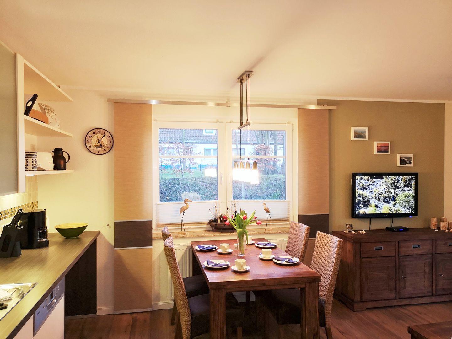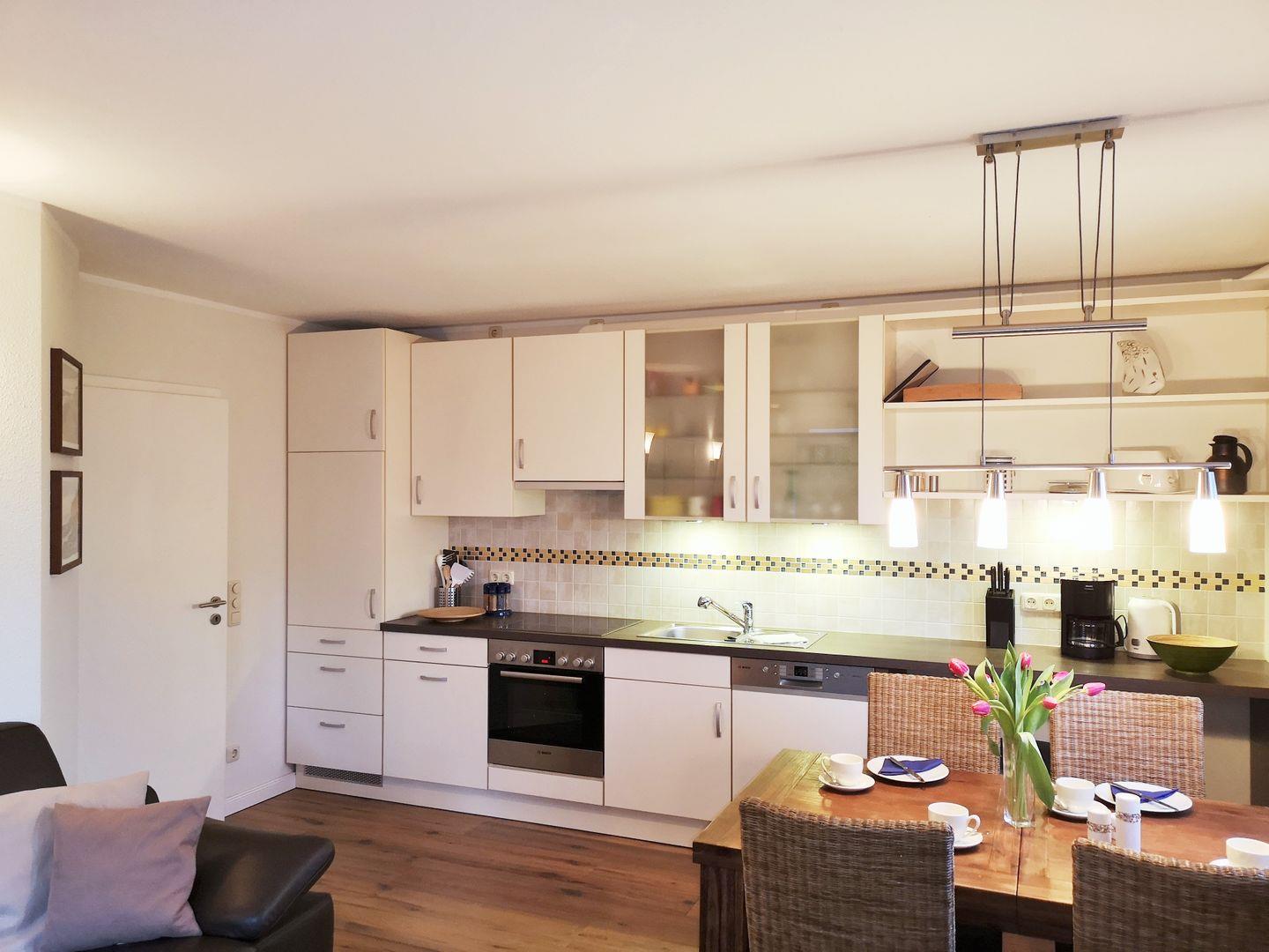 Die Küche beinhaltet eine voll ausgestattete Einbauküchenzeile mit 4-Platten-Ceran-Kochfeld, Backofen, Dunstabzug, Kühlschrank mit Gefrierfach, Geschirrspülmaschine, Kaffeemaschine, Wasserkocher und Toaster. Die Küche ist mit Geschirr, Gläsern, Besteck und Töpfen bestens und ausreichend ausgestattet.