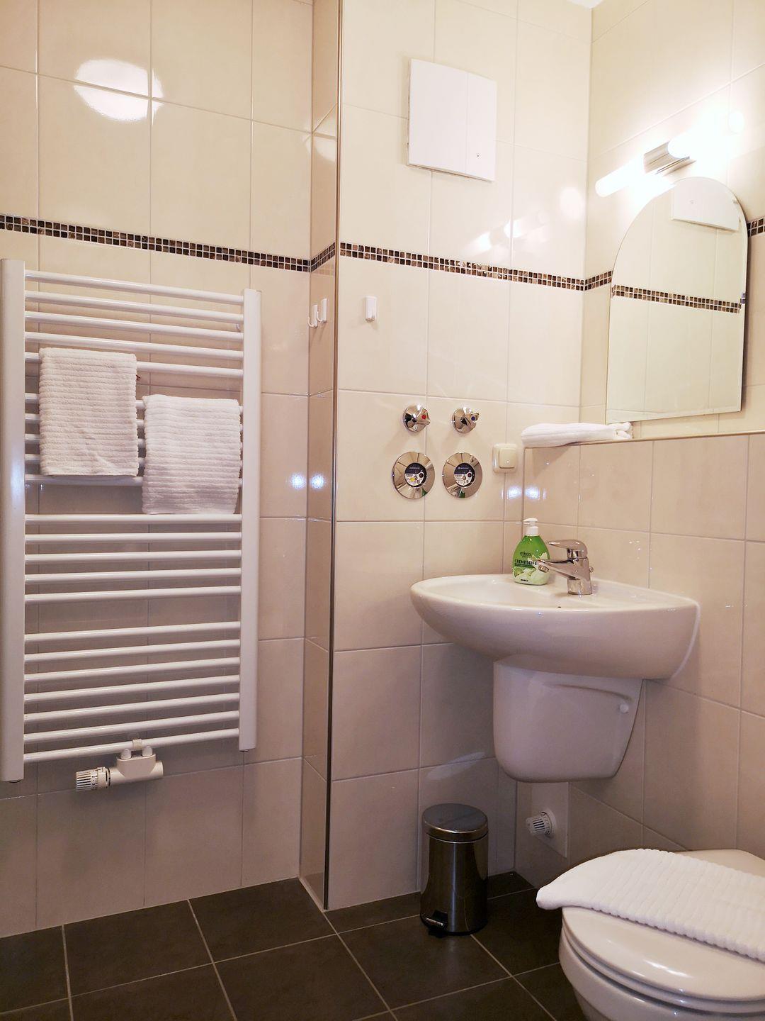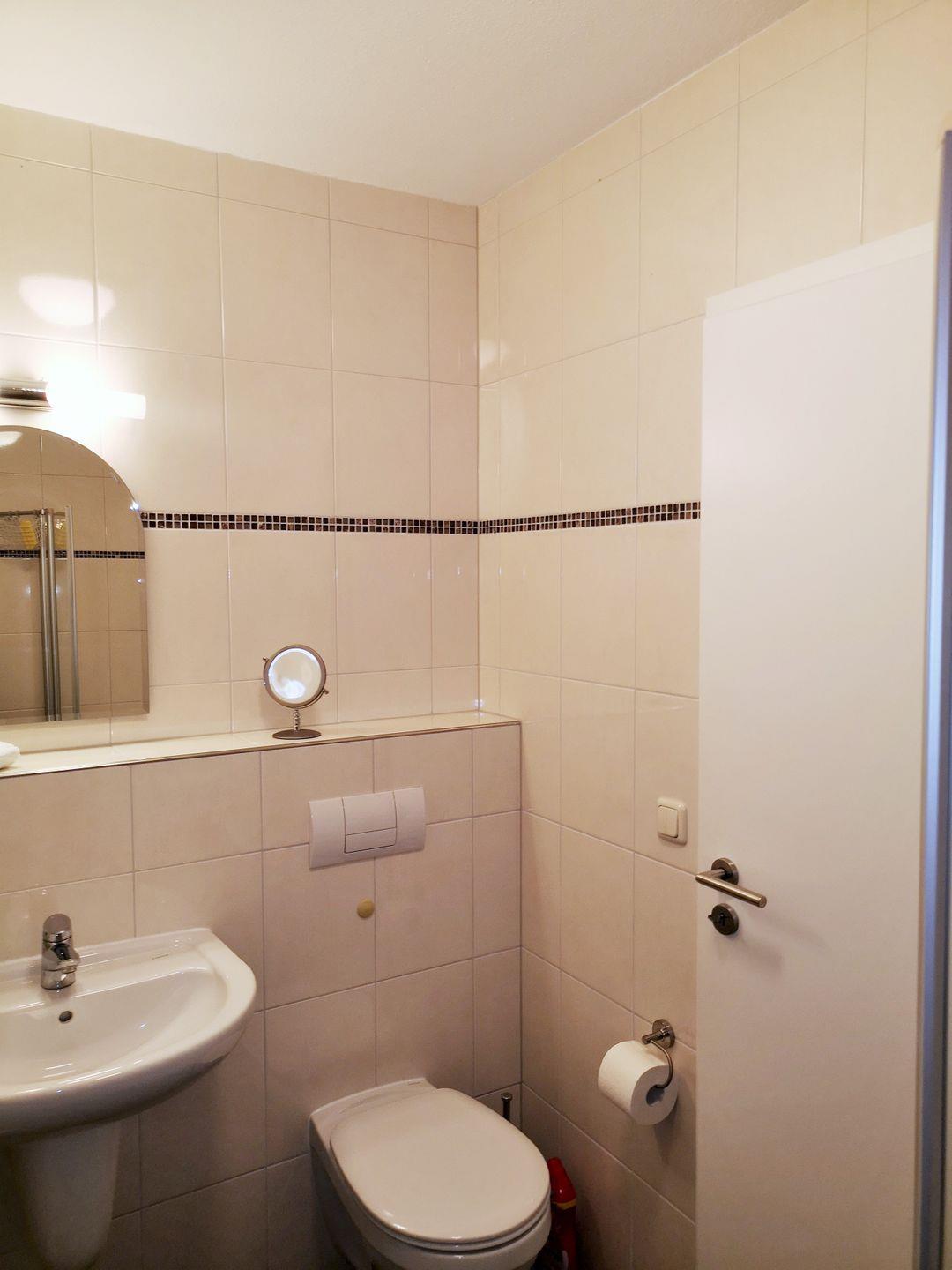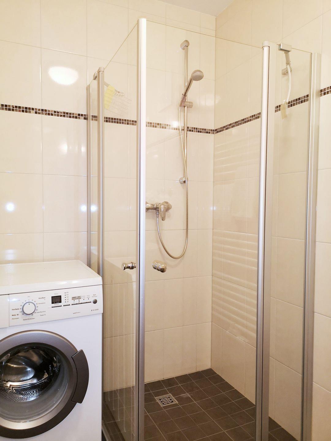 Das große und moderne Badezimmer verfügt über eine Dusche mit Echtglas-Abtrennung und ebenerdigem Einstieg (seniorenfreundlich!), Handtuch-Heizkörper, Waschbecken und WC. Weiterhin steht Ihnen hier eine wohnungseigene Waschmaschine zur Verfügung.