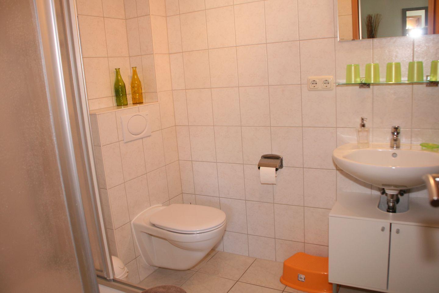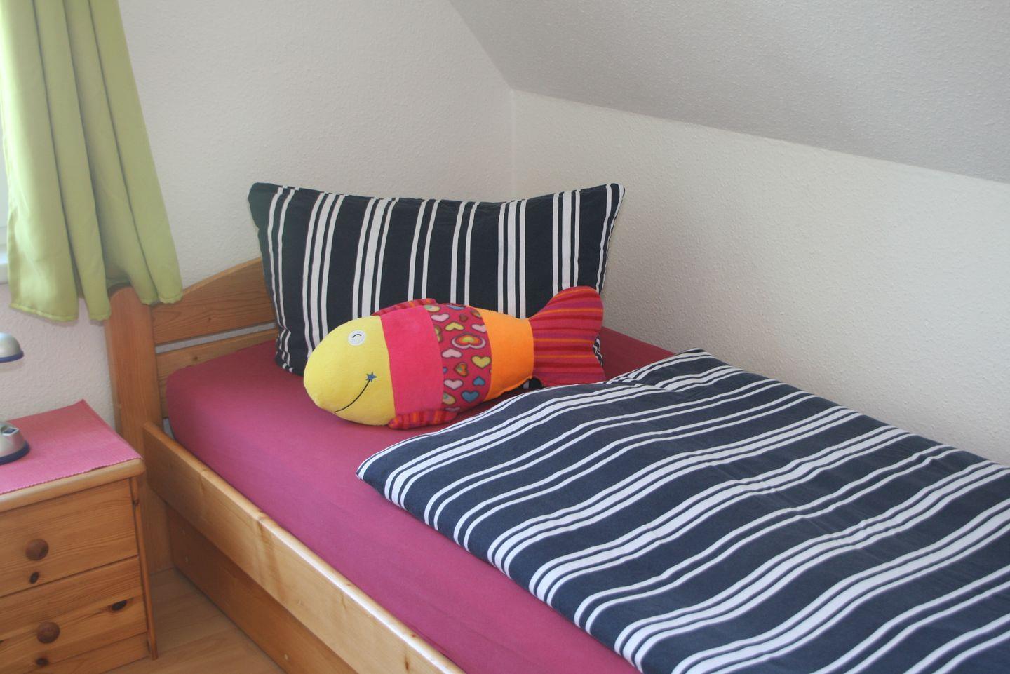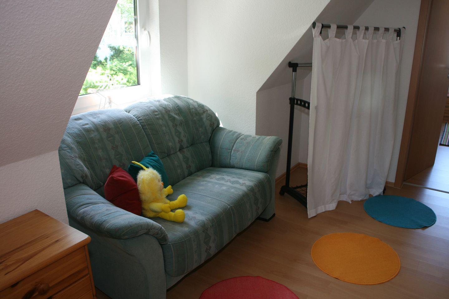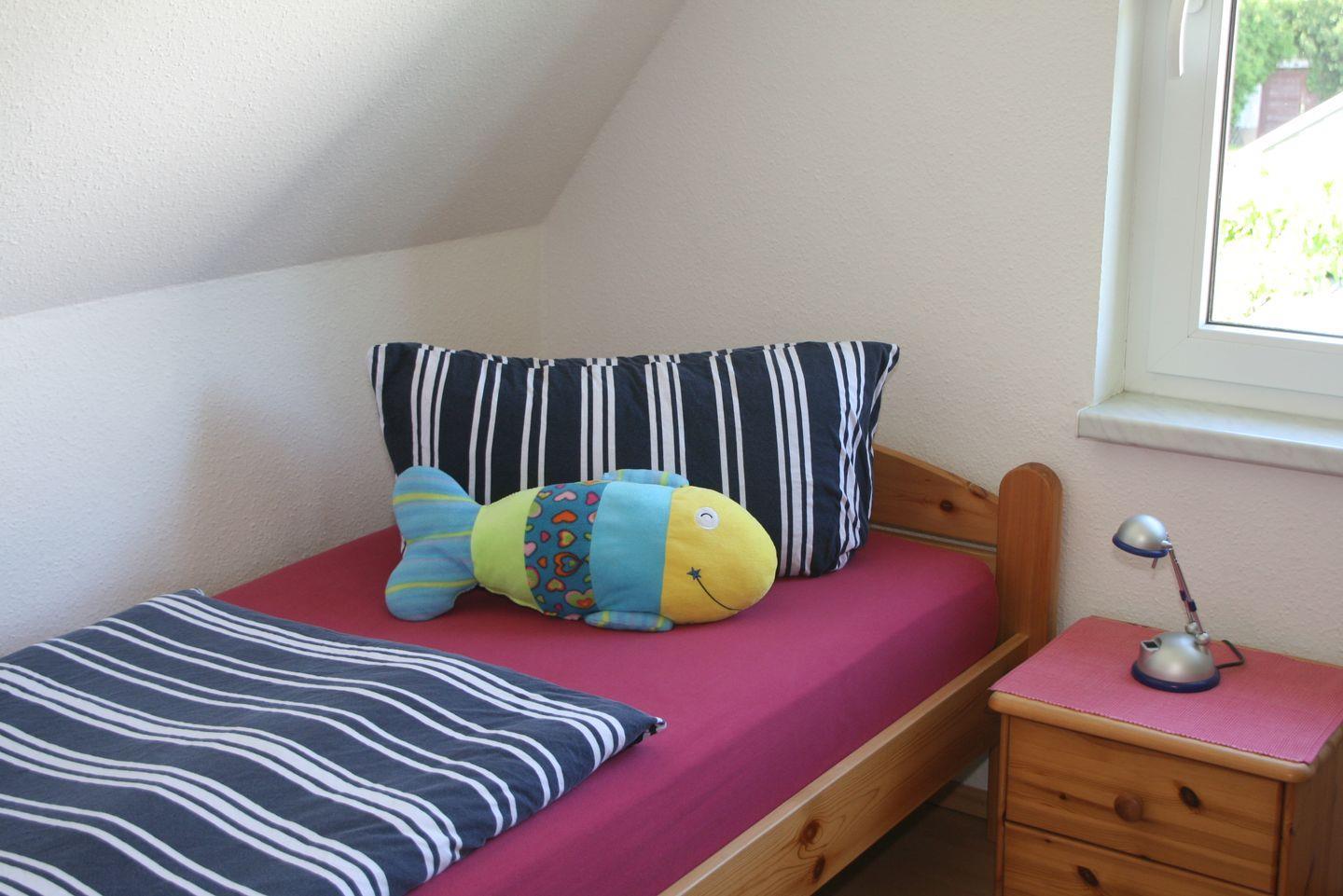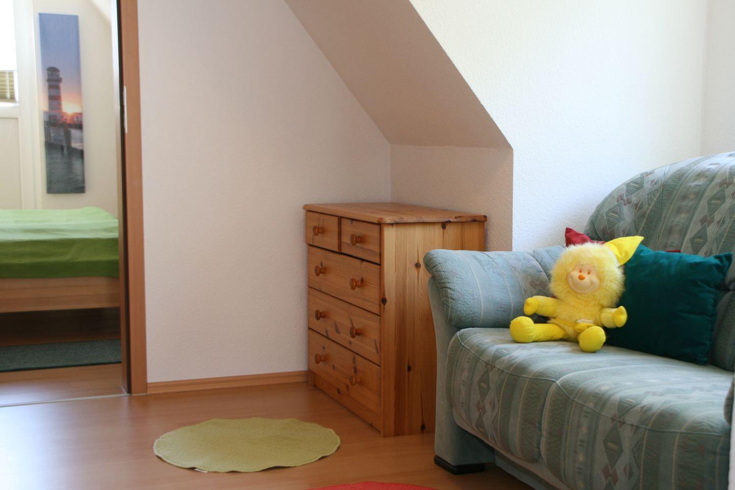 Unsere Ferienwohnung ist eigentlich eine Doppelhaushälfte, welche aber das gesamte Obergeschoss des Hauses für sich nutzt. Im Obergeschoss gibt es Platz für 3 Schlafzimmer. Eines ist ein Doppelbett-Zimmer mit direktem Balkonzugang. Weiterhin gibt es zwei Zwei-Bett-Zimmer, wobei eines davon mit einer Aufbettung als Unterschubbett ausgestattet ist. Im Flurbereich des Obergeschosses gibt zusätzliche Ablage-Möglichkeiten für Garderobe und einen Ruhebereich zum Lesen und Relaxen.