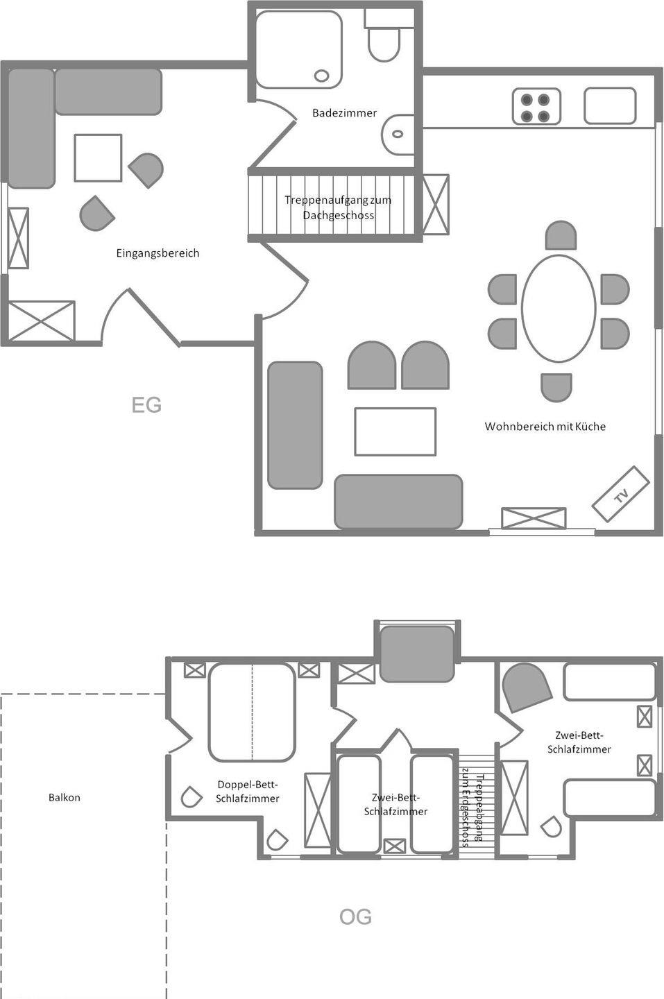Unsere Ferienwohnung ist eigentlich eine Doppelhaushälfte, welche aber das gesamte Obergeschoss des Hauses für sich nutzt. Im Obergeschoss gibt es Platz für 3 Schlafzimmer. Eines ist ein Doppelbett-Zimmer mit direktem Balkonzugang. Weiterhin gibt es ein Zwei-Bett-Zimmer, dass mit einer Aufbettung als Unterschubbett ausgestattet ist und ein Schlafzimmer mit einem Einzelbett (90x190 cm). Im Flurbereich des Obergeschosses gibt es zusätzlich einen Ruhebereich zum Lesen und Relaxen.