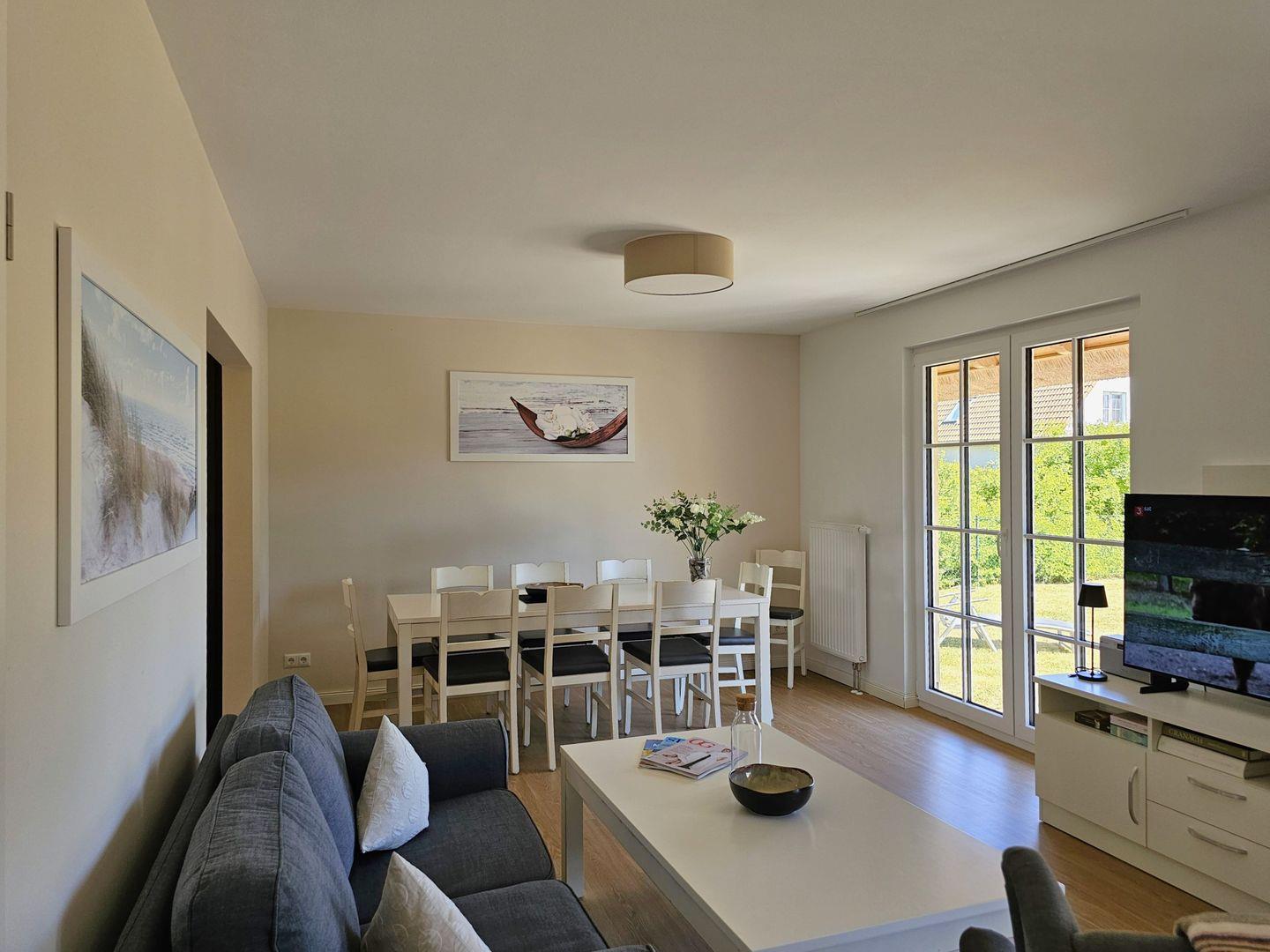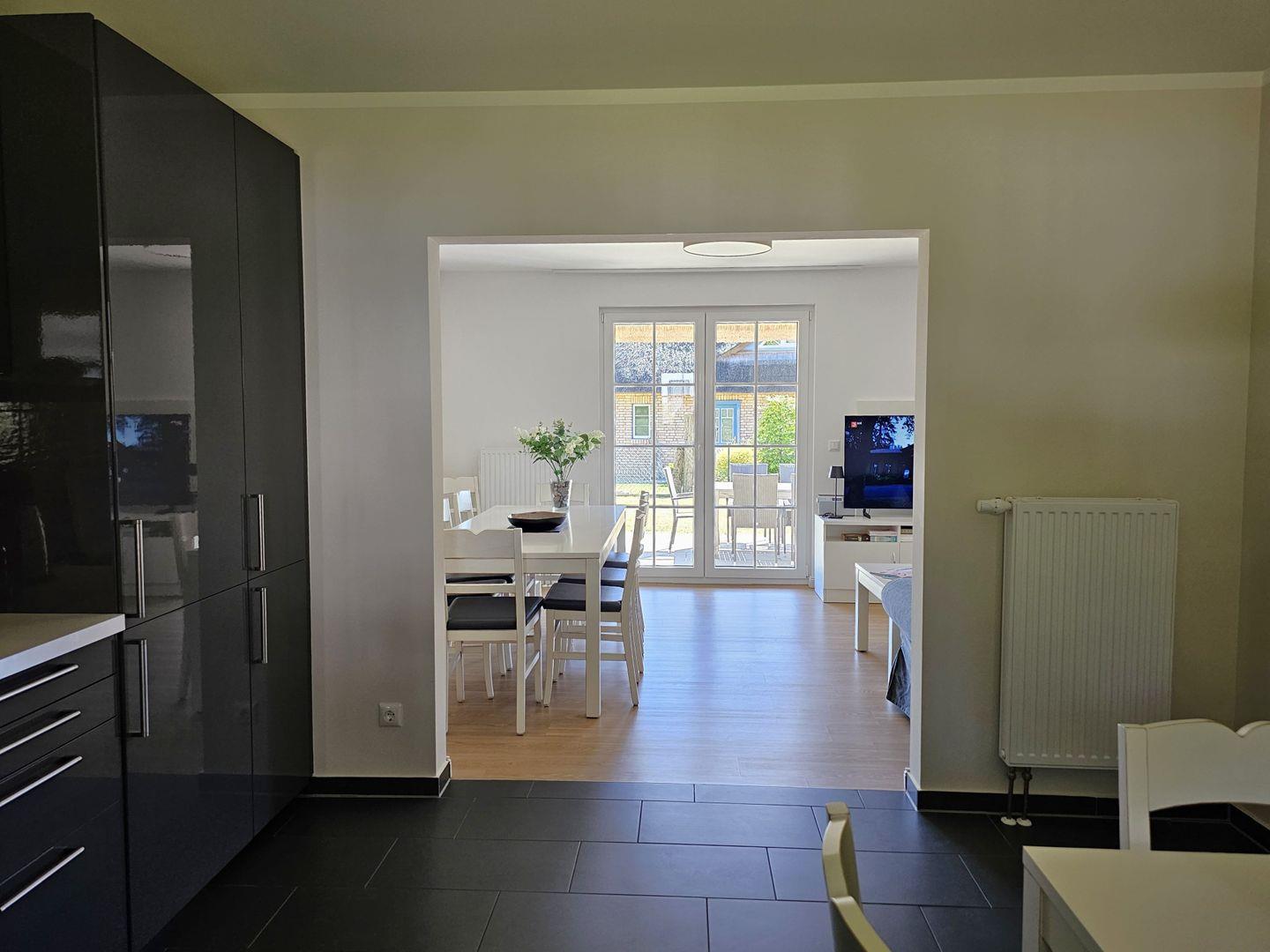 Das Ferienhaus verfügt über insgesamt vier Zimmer, darunter drei komfortabel ausgestattete Schlafzimmer, die Platz für erholsame Nächte bieten. Für zusätzliche Bequemlichkeit gibt es ein Badezimmer mit Dusche, Badewanne und Waschbecken sowie ein separates Gäste-WC. Die hellen und freundlichen Räume sind mit modernen Möbeln ausgestattet und sorgen für eine einladende Atmosphäre. Das Wohnzimmer, das offen zur voll ausgestatteten Küche gestaltet ist, lädt zu geselligen Abenden ein. Hier finden Sie eine gemütliche Sofaecke, einen Esstisch und die technische Ausstattung wie Fernseher und WLAN. Die Küche lässt mit modernen Elektrogeräten wie Spülmaschine, Backofen, Mikrowelle, Herd und Kühlschrank keine Wünsche offen. Auch Küchenutensilien sind in ausreichender Menge vorhanden, sodass Sie der Zubereitung Ihrer Lieblingsgerichte nichts im Wege steht.