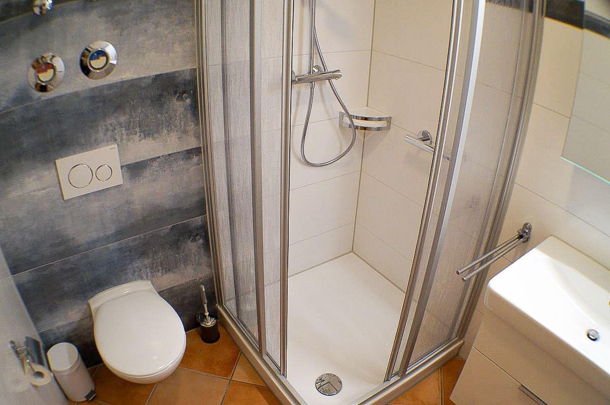 In dem innenliegenden Badezimmer gibt es eine Dusche, ein Waschbecken sowie ein WC. Auch ein Fön ist vorhanden.