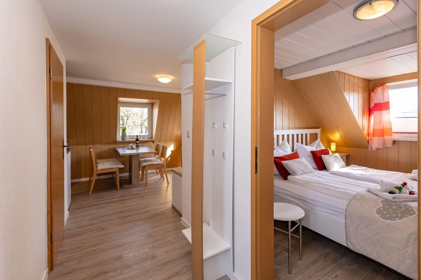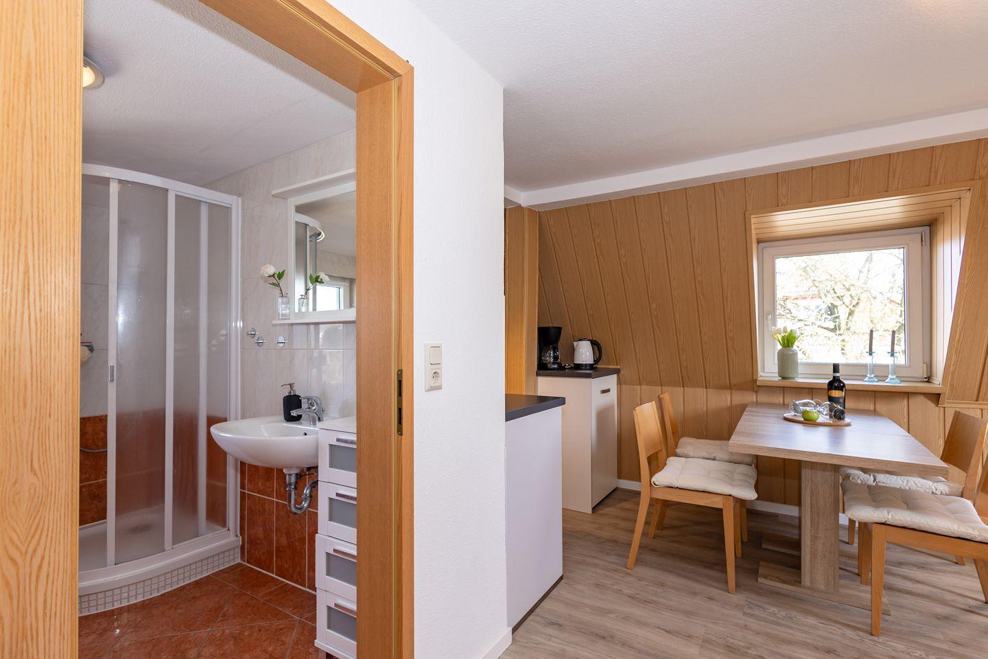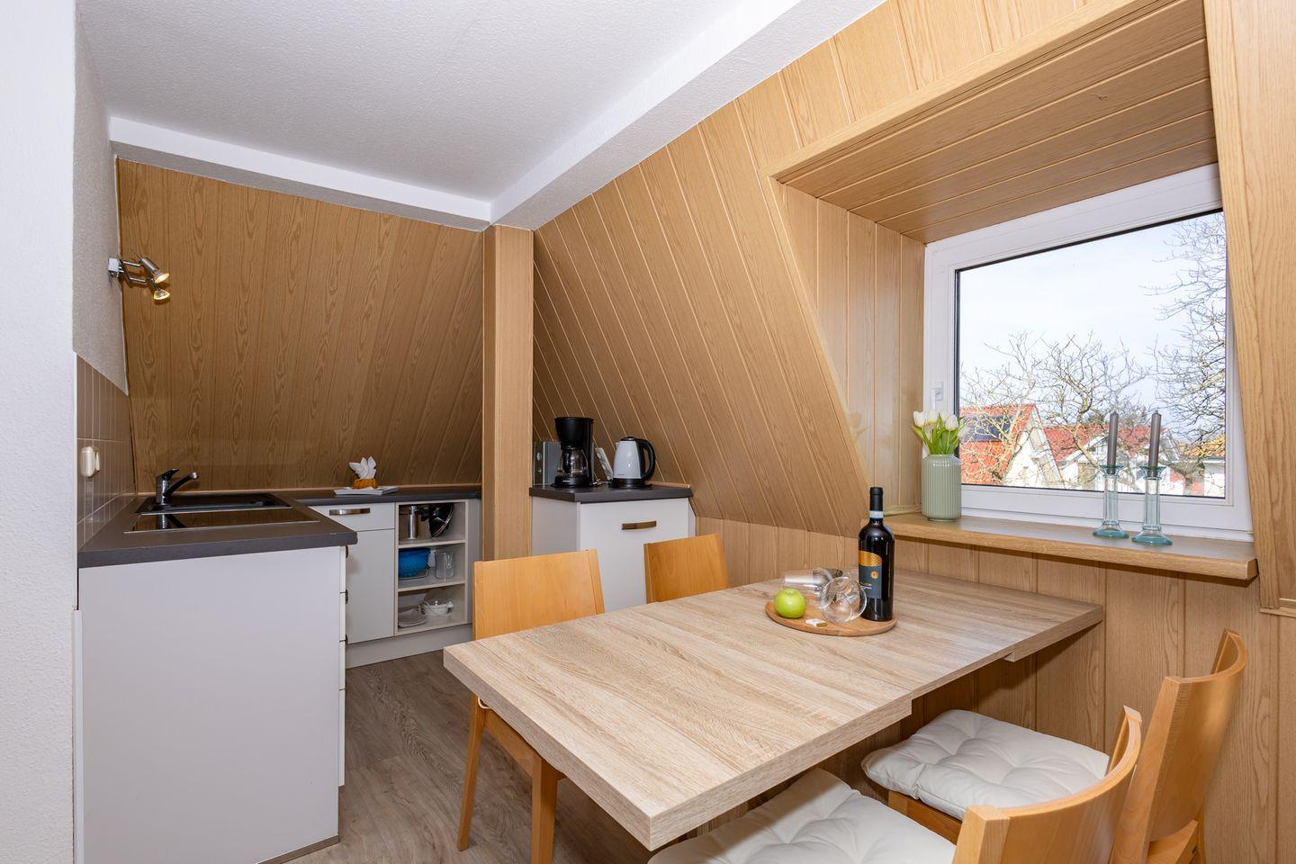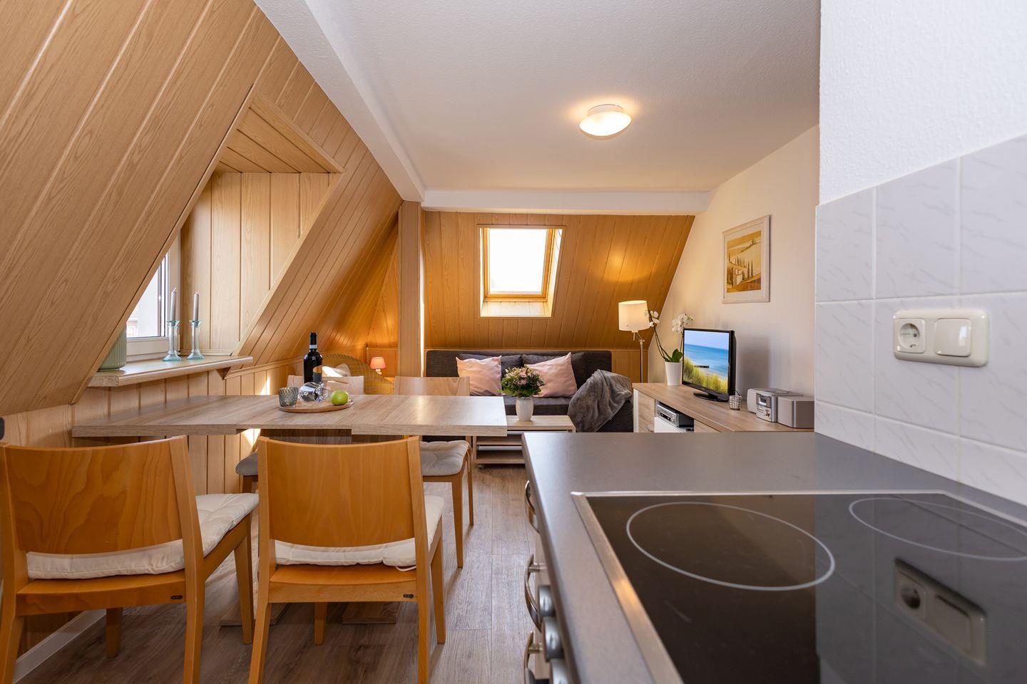 Die offene Küche ist zum Wohnzimmer hin gestaltet und ermöglicht geselliges Zusammensein beim Kochen und Essen. Sie ist mit allen notwendigen Küchenutensilien und modernen Geräten ausgestattet: Ceranherd, Backofen, Mikrowelle, Kühlschrank mit integriertem Gefrierfach, Spülmaschine, Kaffeemaschine, Toaster, Wasserkocher und Eierkocher sowie ausreichend Geschirr, Besteck und Geschirrhandtücher. Ein separater Essbereich mit Esstisch schafft Platz für gemeinsame Mahlzeiten.