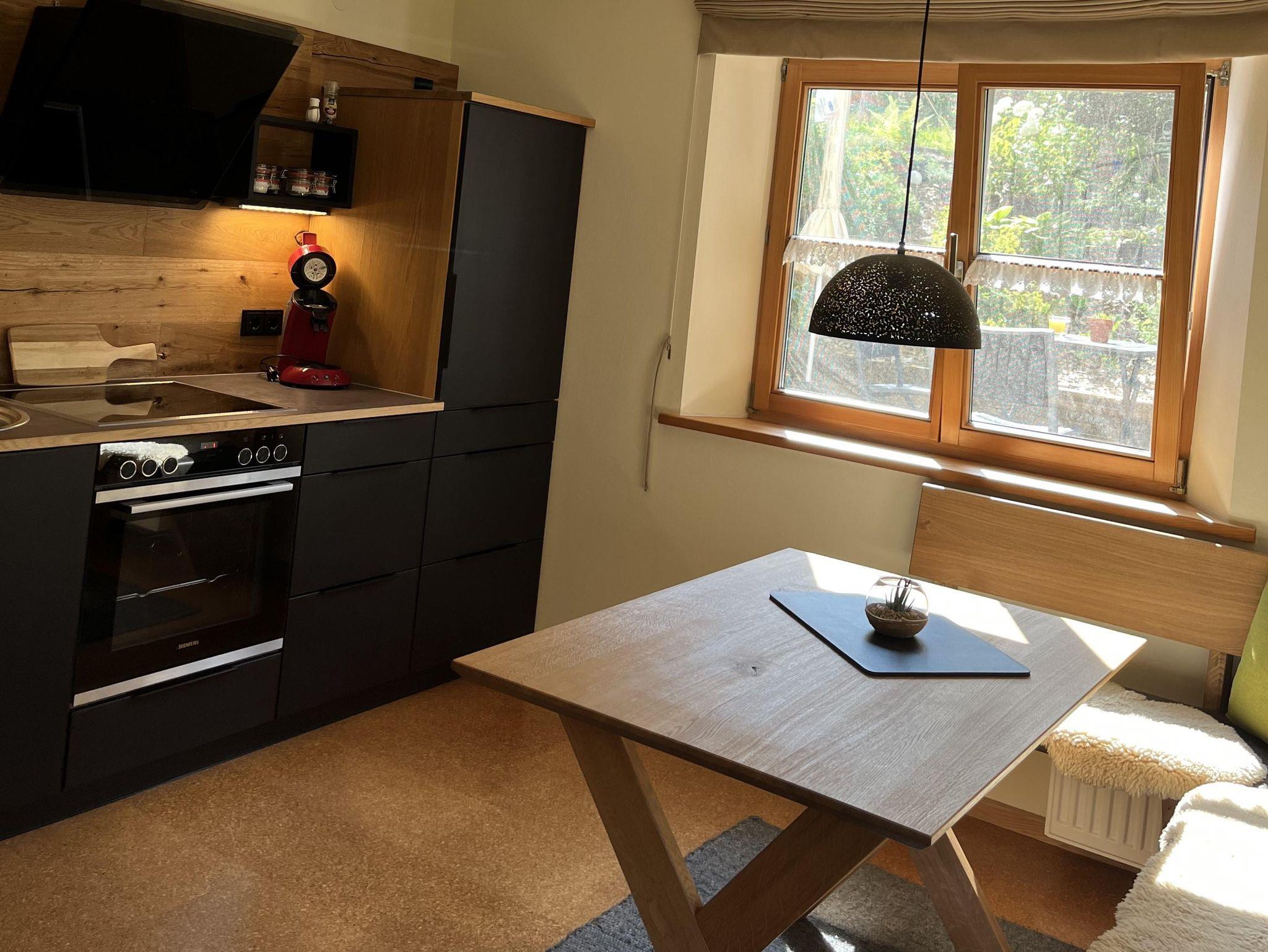 Die Ferienwohnung bietet Platz für bis zu 2 Personen und ist ausgestattet mit einer nach Westen ausgerichteten Wohnküche mit Eckbank und einer Terrassentür. Im Wohnzimmer befindet sich eine Lesebank und ein Schlafsofa ( 150 x 200) Das Fichten-Schlafzimmer mit Morgensonne (im Sommer), welches nach Osten ausgerichtet ist, ist voll verdunkelbar. Das Badezimmer ist mit einer Regendusche, WC und einem Aussenfenster ausgestattet.