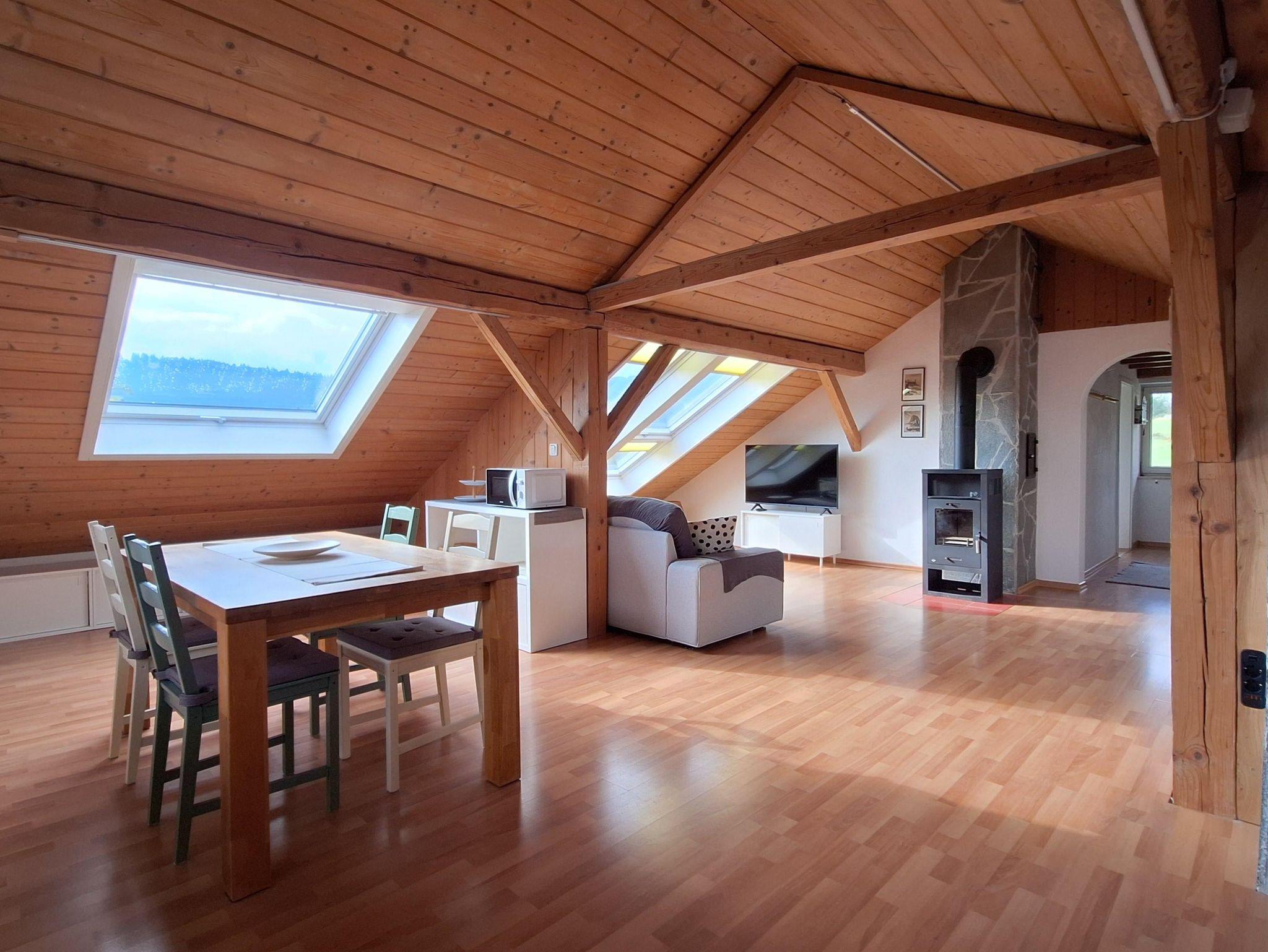 Im großen, hellen Wohnzimmer genießen Sie dank der großen Dachfenster einen traumhaften Ausblick. Eine bequeme Couch, ein großer Fernseher und ein gemütlicher Schwedenofen laden zum Entspannen und Verweilen ein.
