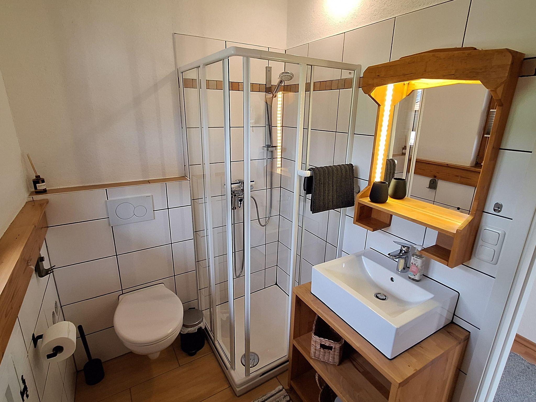 Das helle Tageslichtbad verfügt über Dusche, WC, Handtücher und Föhn.