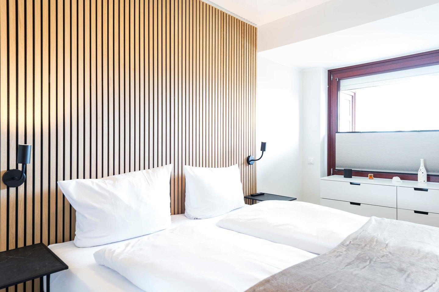 Im lichtdurchflutetem Wohnzimmer und der offenen Küche lädt ein großes Sofa zum Entspannen ein. Die Wohnung verfügt über allerhand Annehmlichkeiten. Der 55 Zoll-TV ist mit Amazon-Stick ausgestattet, es gibt ein Soundsystem mit JBL Soundbar und ein 100 MB-WLAN. An heißen Tagen kann im Wohnzimmer eine Klimaanlage für nötige Abkühlung sorgen und im Winter für ein nachhaltiges Heizen.