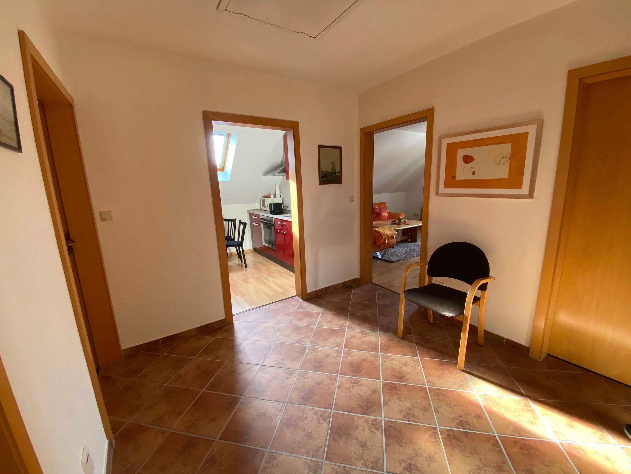 In der Oberwohnung befindet sich ein großer Schlafraum mit Doppelbett. Hier kann zusätzlich ein Babybett dazu gestellt werden. Der Küchenbereich ist separat. Im großzügigen Badbereich befindet sich eine Dusche und eine Badewanne. Waschmaschine vorhanden. Der Wohnbereich ist hell und groß und bietet genug Platz zum Entspannen.