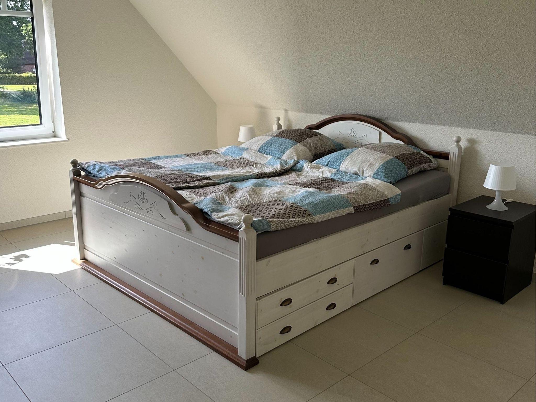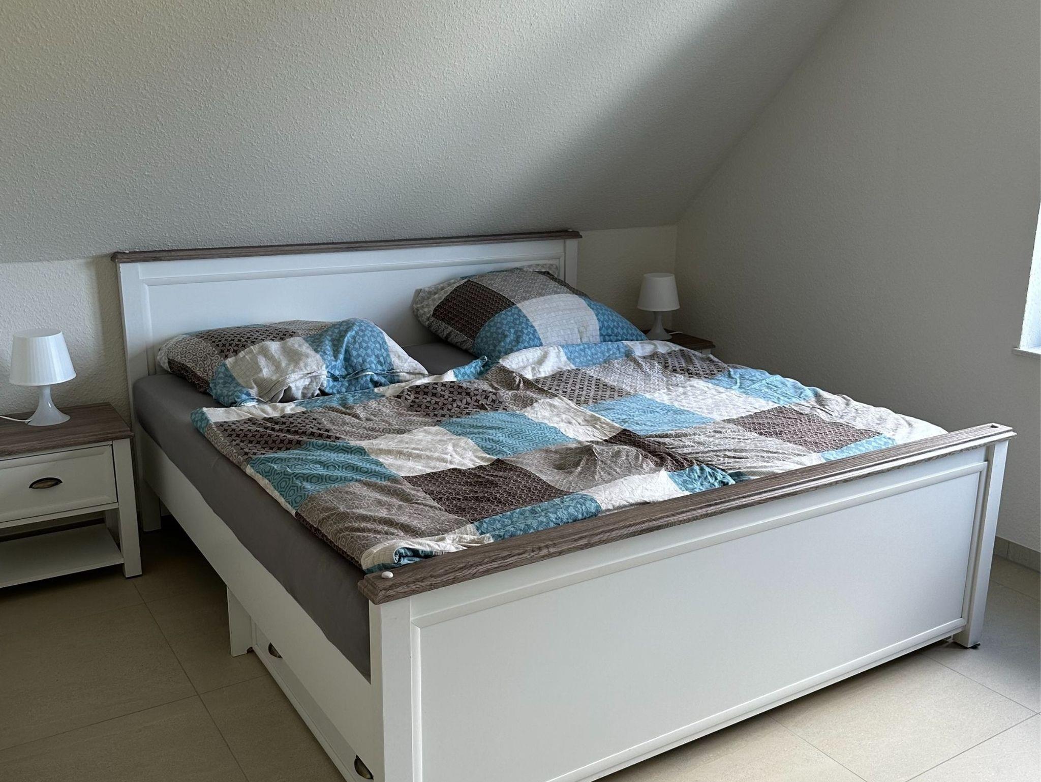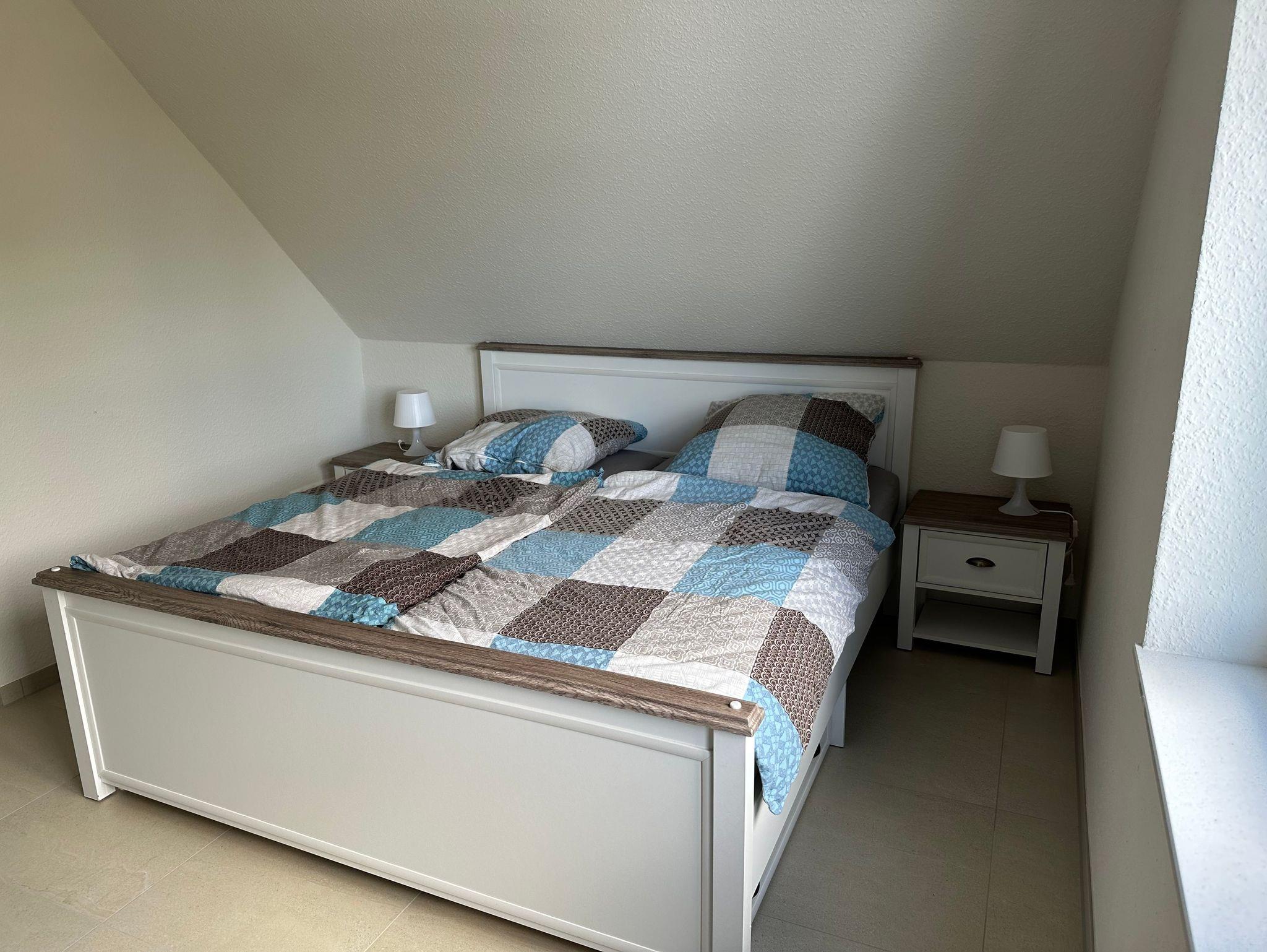 In der Oberwohnung stehen Ihnen zwei Doppelzimmer (Doppelbetten je 1,80 m × 2,00 m/2 Matratzen), eine Wohnküche mit einer Schlafcouch (1,00 m × 1,85 m) und ein Bad mit Badewanne und einer ebenerdigen Dusche zur Verfügung.