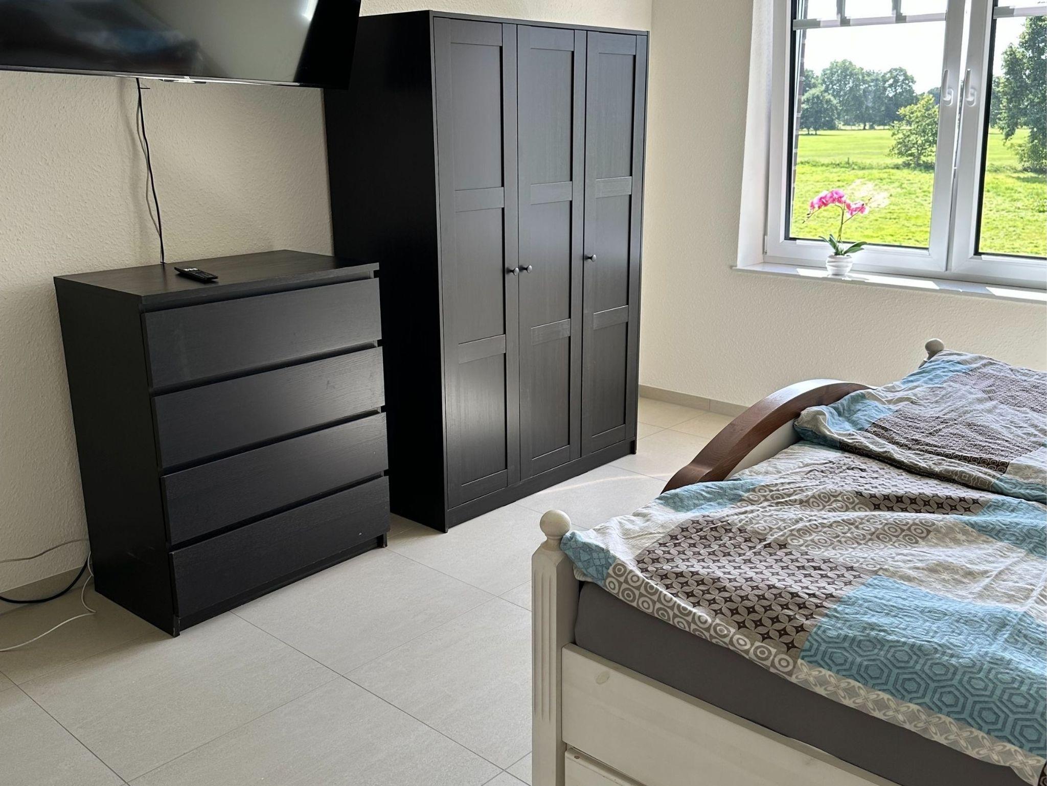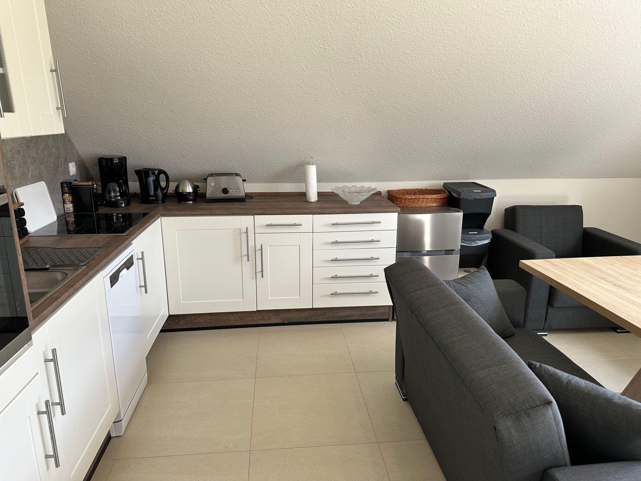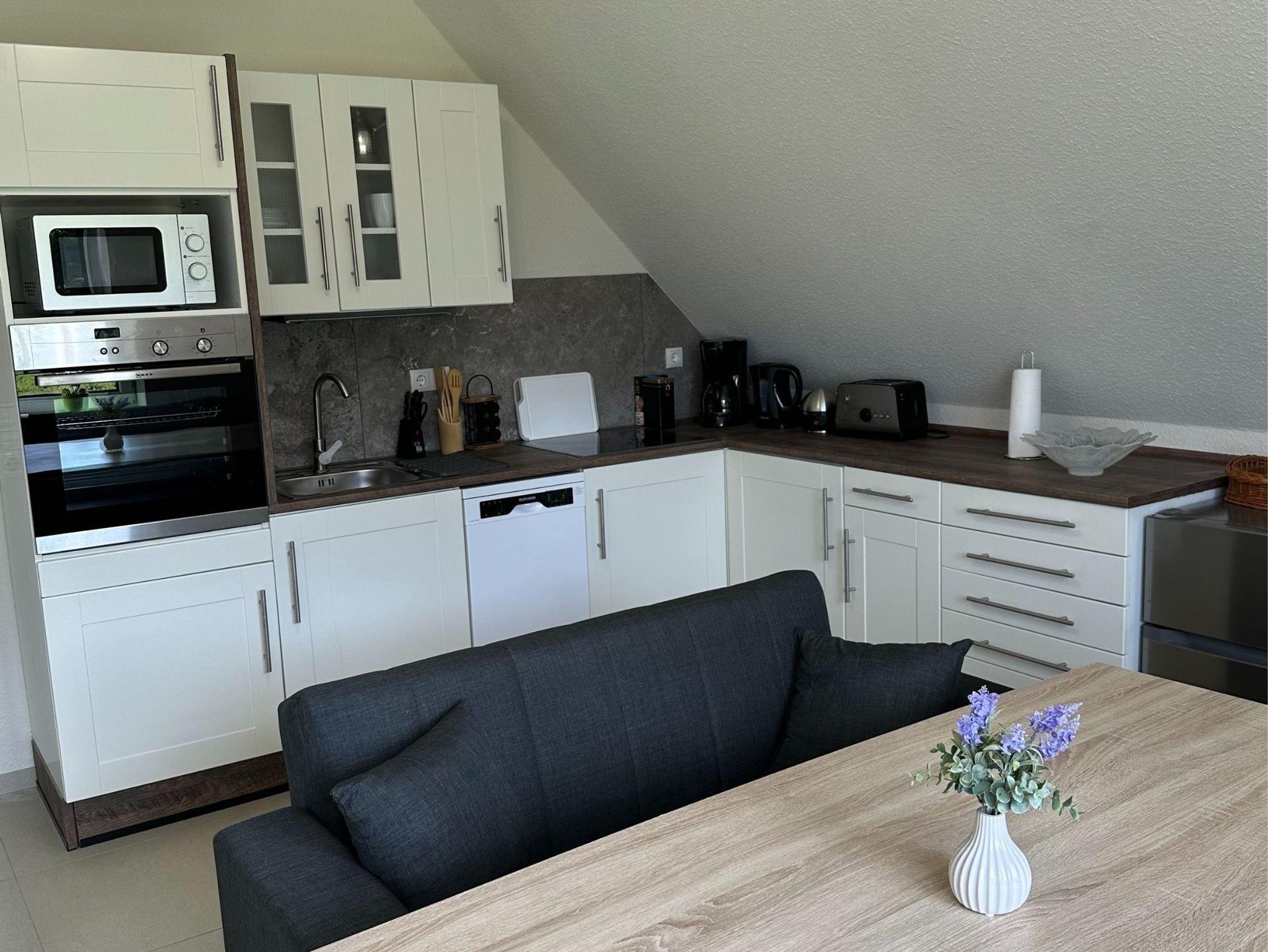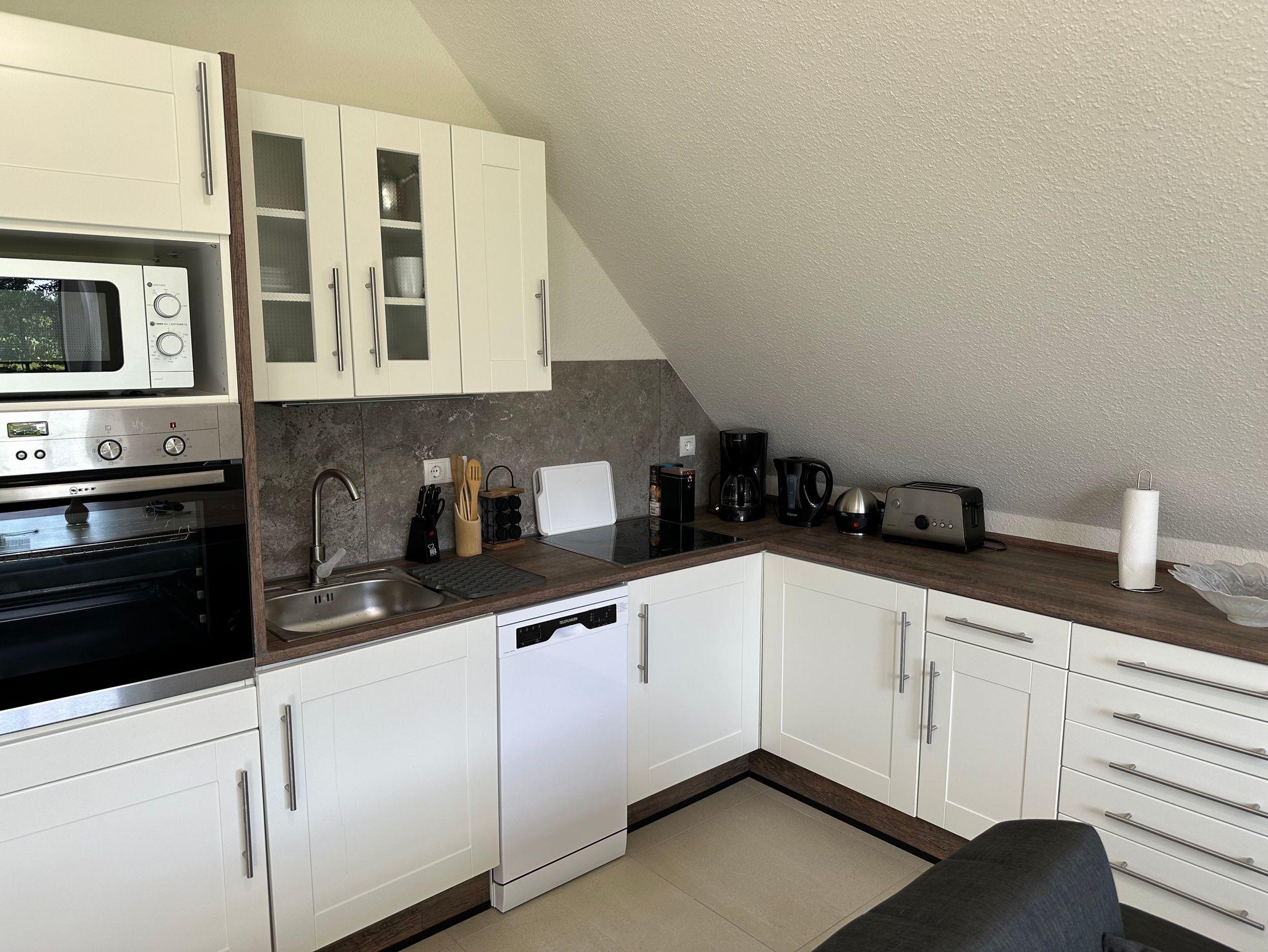 In der Oberwohnung stehen Ihnen zwei Doppelzimmer (Doppelbetten je 1,80 m × 2,00 m/2 Matratzen), eine Wohnküche mit einer Schlafcouch (1,00 m × 1,85 m) und ein Bad mit Badewanne und einer ebenerdigen Dusche zur Verfügung.