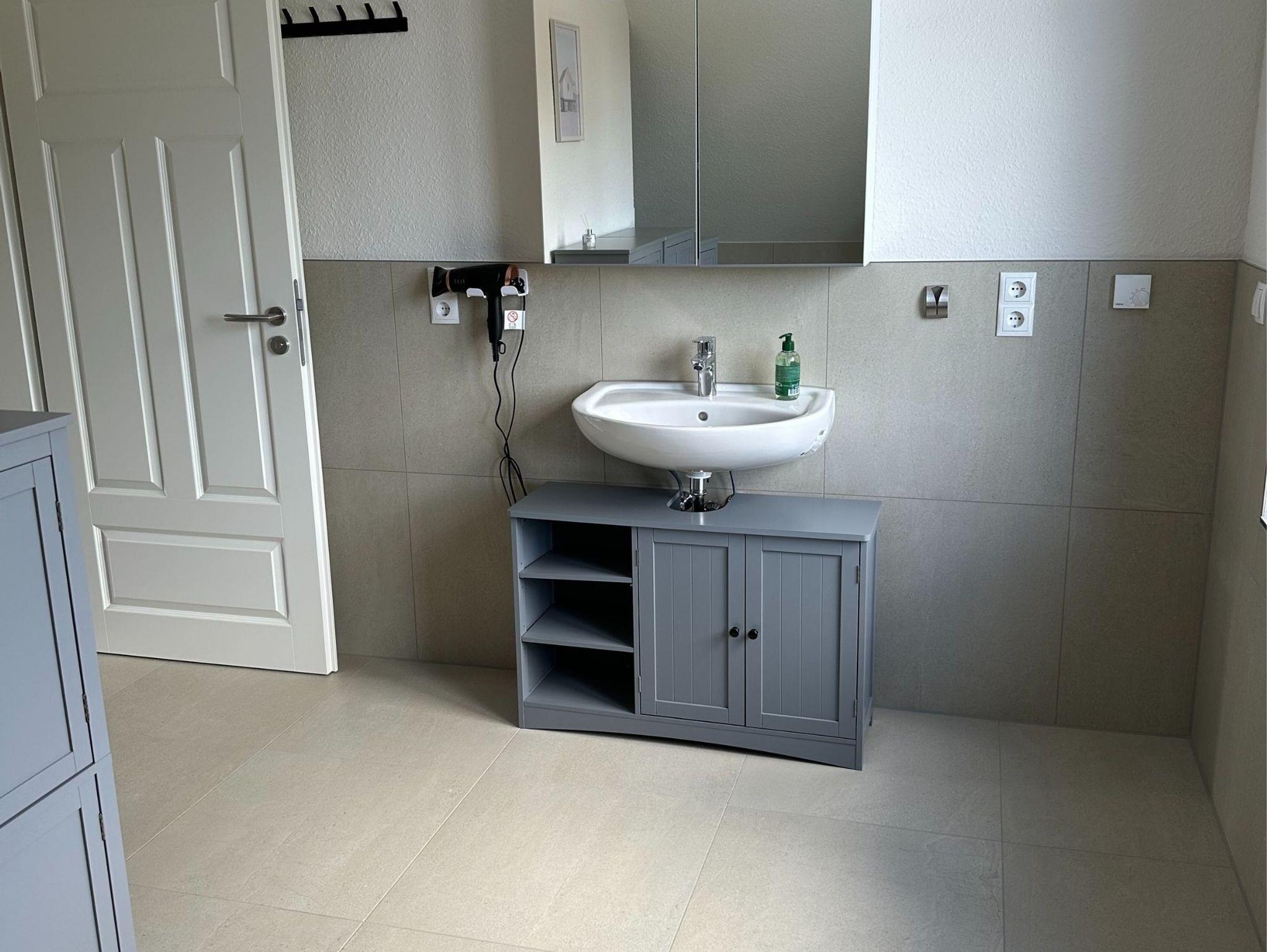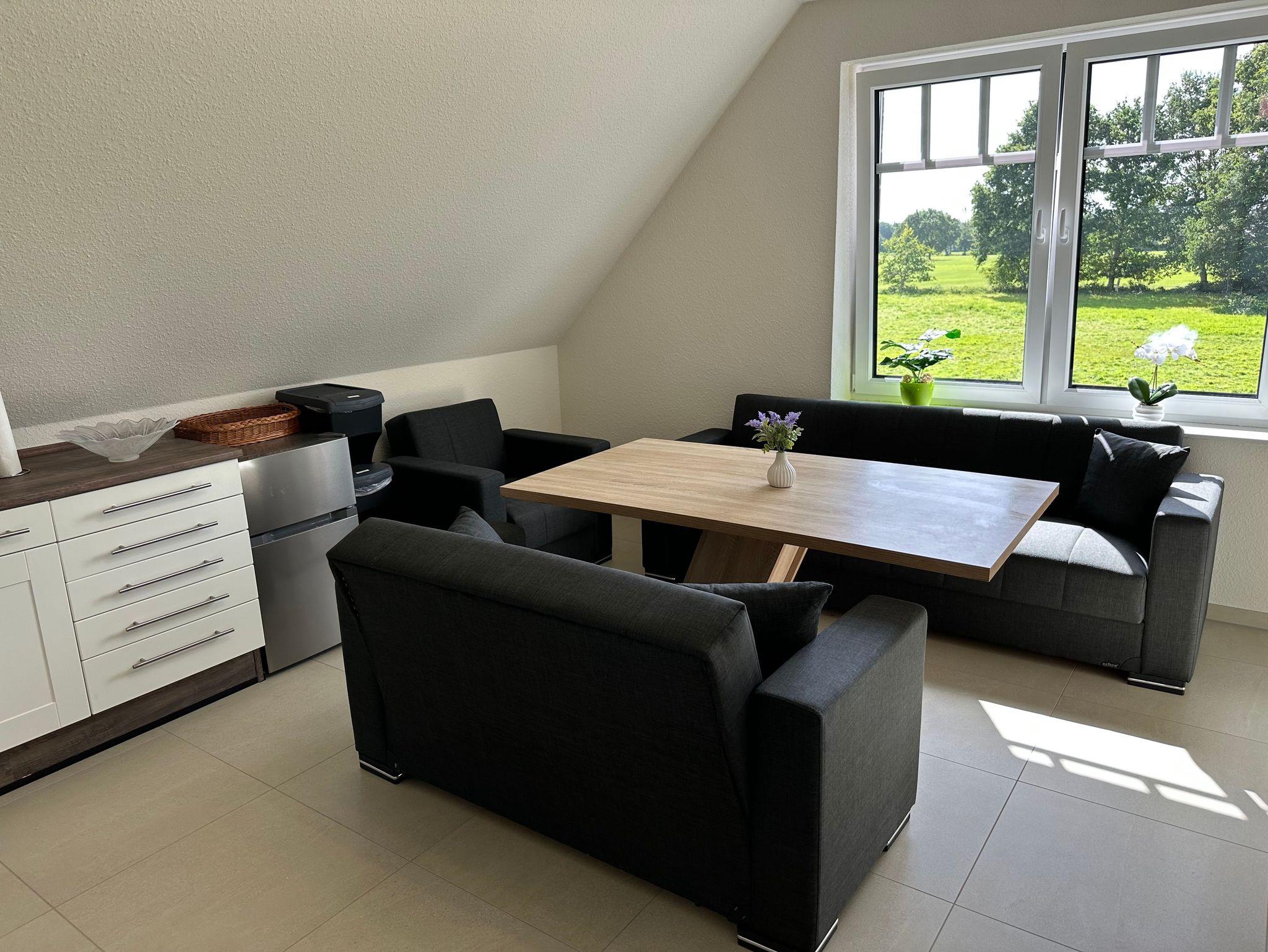 In der Wohnung im Erdgeschoss können bis zu 3 Personen (+ 1 Kleinkind-Reisebett vorhanden) übernachten. Sie ist ausgestattet mit einer großen Küche mit Sitzgelegenheiten für bis zu 10 Personen. Einem Wohnschlafraum mit einer Schlafcouch (1,00 m × 2,30 m), einem Doppelzimmer (Doppelbett 1,80 m × 2,00 m/1 Matratze) und einem Bad mit einer Badewanne und einer ebenerdigen Dusche.