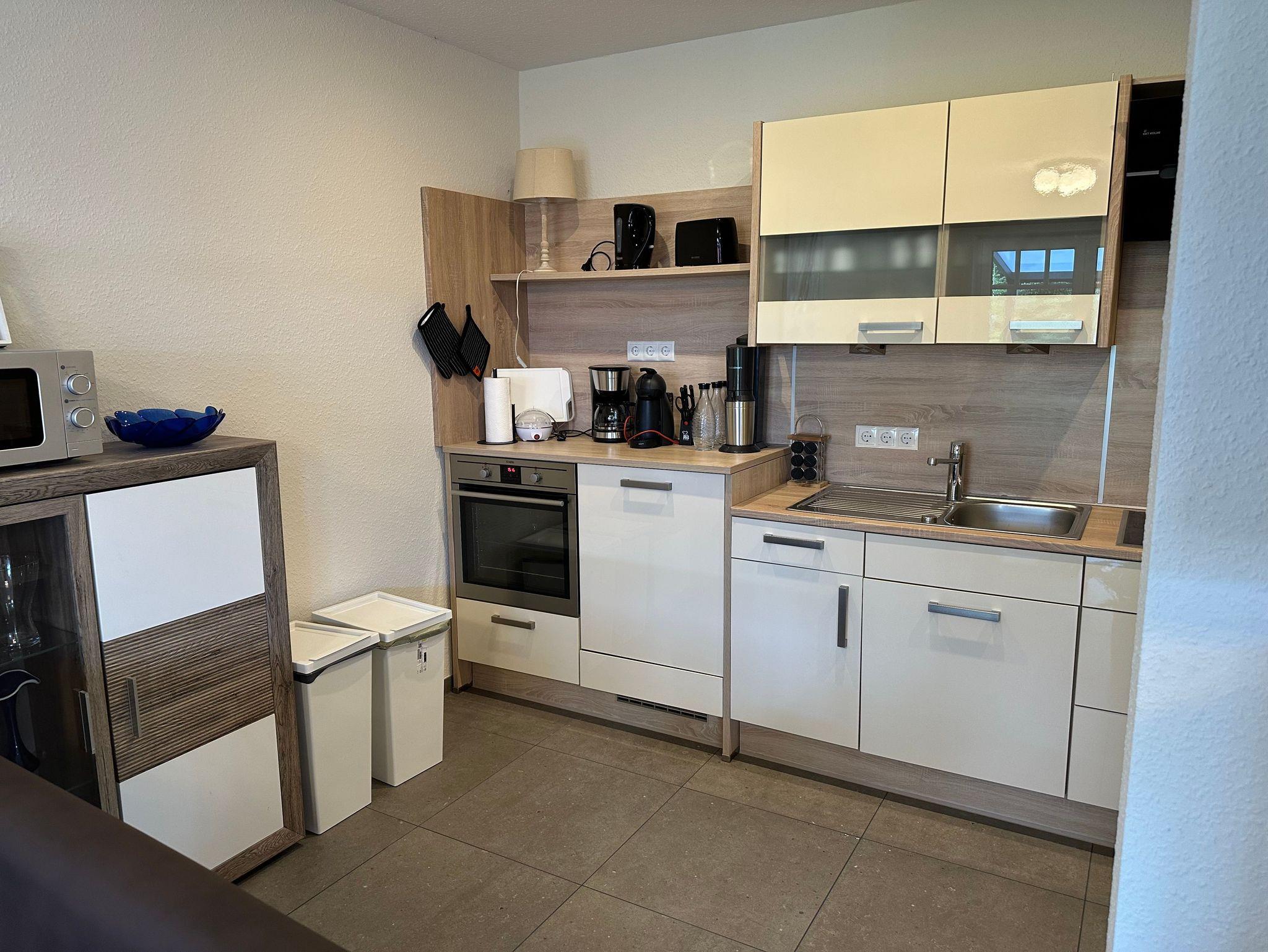 In der Wohnung im Erdgeschoss können bis zu 3 Personen (+ 1 Kleinkind-Reisebett vorhanden) übernachten. Sie ist ausgestattet mit einer großen Küche mit Sitzgelegenheiten für bis zu 10 Personen. Einem Wohnschlafraum mit einer Schlafcouch (1,00 m × 2,30 m), einem Doppelzimmer (Doppelbett 1,80 m × 2,00 m/1 Matratze) und einem Bad mit einer Badewanne und einer ebenerdigen Dusche.