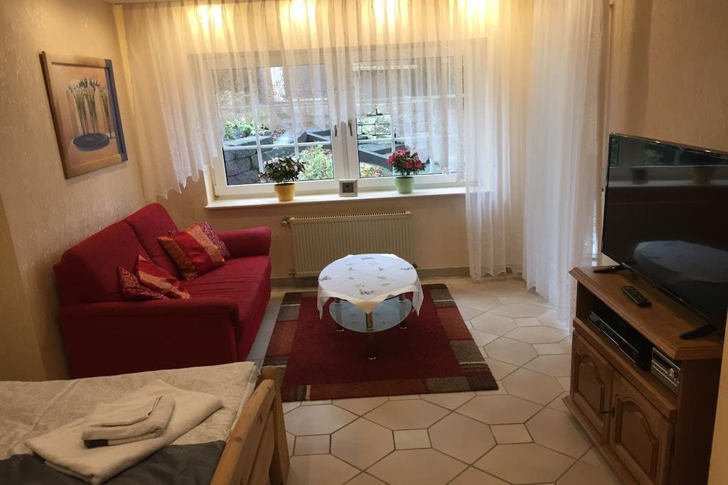 Willkommen in unserer 45 qm großen Ferienwohnung, die sich im Untergeschoss befindet und von 2 Personen nutzbar ist. Die Ferienwohnung ist ausgestattet mit einem Wohn-Schlafzimmer mit Stereo Radio, Kabel TV, DVD-Player, Filmen, Safe und einer gemütlichen Sitzecke. In der Ferienwohnung, die über Zentral- und Fußbodenheizung verfügt, ist DSL Internet mit 10.000 M/Bit vorhanden. Die Küche ist voll ausgestattet mit Geschirr, Mikrowelle, Spülmaschine, Kochofen mit Ceranfeld und einer Essecke. Waschmaschine und Trockner ist vorhanden. Auch eine große Außenterrasse mit Liegewiese lädt zum Entspannen ein und eine Grillmöglichkeit ist vorhanden. Parken Sie gerne auf dem vorhandenen Autostellplatz. Wir freuen uns auf Ihren Urlaub im Hunsrück!