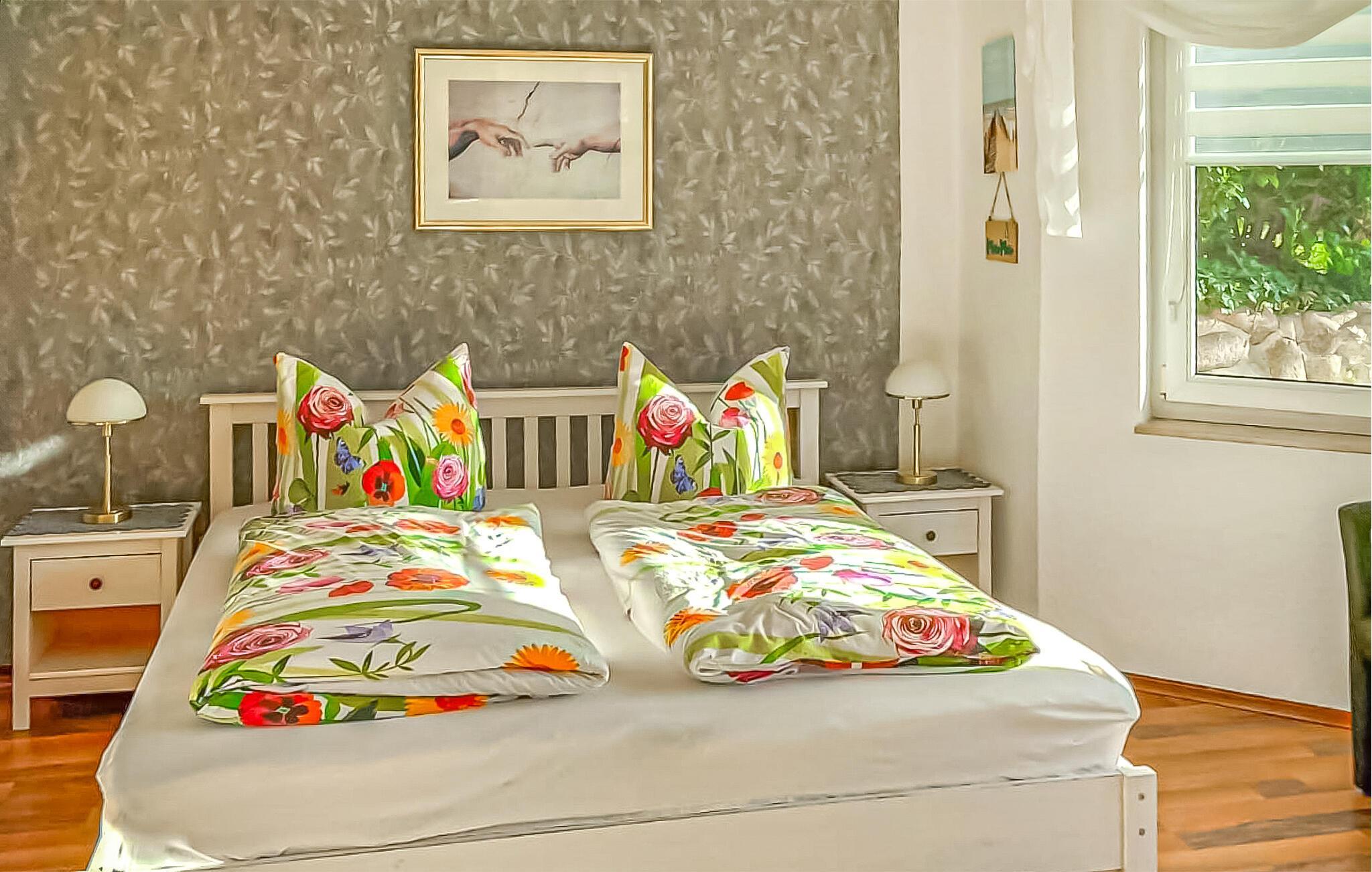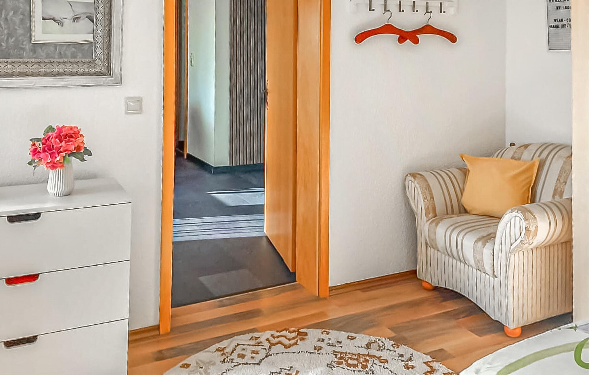 En ferieleilighet for 2 personer ligger i en rolig beliggenhet på den ca. 5000 m² store inngjerdede boligeiendommen i første etasje av eierens hus. Restauranten ligger ca. 500 meter unna, og det er ca. 2 km til et bakeri, butikker og en badesjø. Den ca. 50 m² store, røykfrie ferieleiligheten med egen inngang har sentralvarme og insektsnett på vinduene. Den er utstyrt med stue (sovesofa, flatskjerm-TV, radio/CD-spiller, spiseplass), åpen kjøkkenløsning (elektrisk komfyr med stekeovn, kjøleskap med fryser, mikrobølgeovn, diverse små kjøkkenapparater), et soverom (dobbeltseng). seng) og bad (dusj, toalett, hårføner, vaskemaskin (mot betaling).