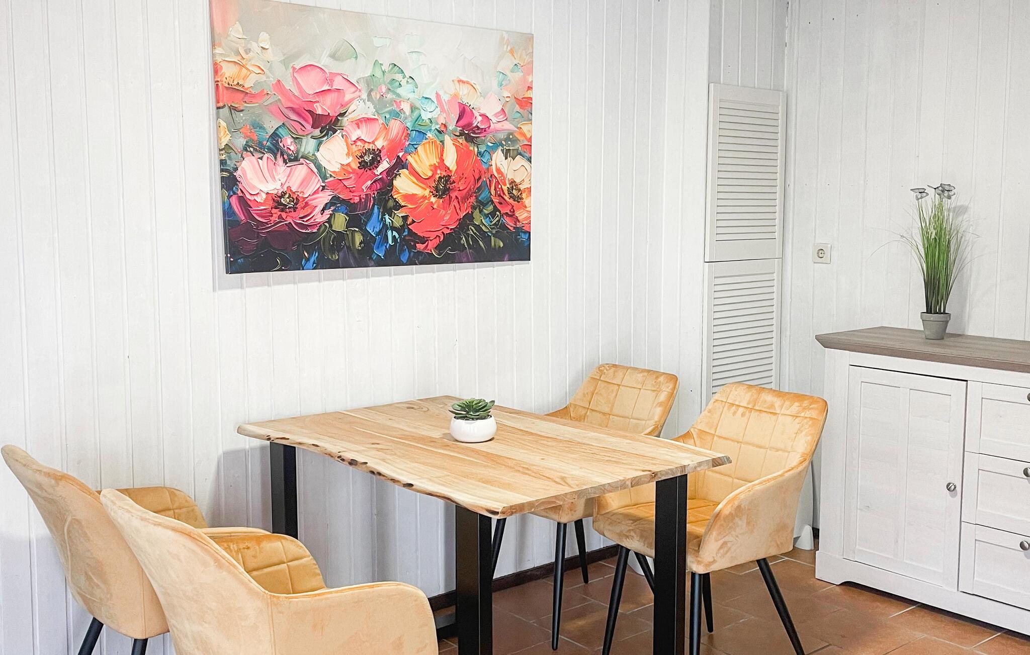 Det enkle, røykfrie feriehuset for 4 personer i første etasje har en stor stue (polstrede møbler, med sovesofa for 2 personer, flatskjerm-TV, spisebord) med en liten kjøkkenkrok (komfyr, kjøleskap med fryserom, noen med mikrobølgeovn, diverse små kjøkkenapparater). Det er et soverom (dobbeltseng) og et bad (dusj, toalett, hårføner), som ble totalrenovert i 2022, en møblert, overbygd terrasse, insektnett på vinduene og ekstra elektriske radiatorer, samt en parkeringsplass, grill, barneseng på forespørsel, gratis WiFi og en lekeplass på stedet.