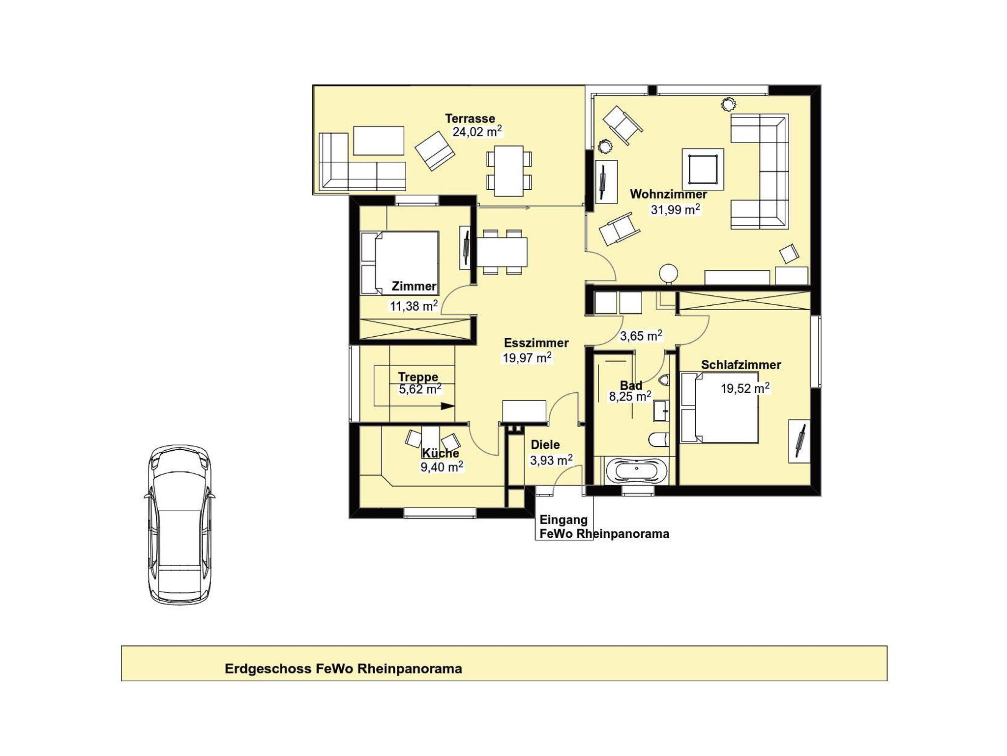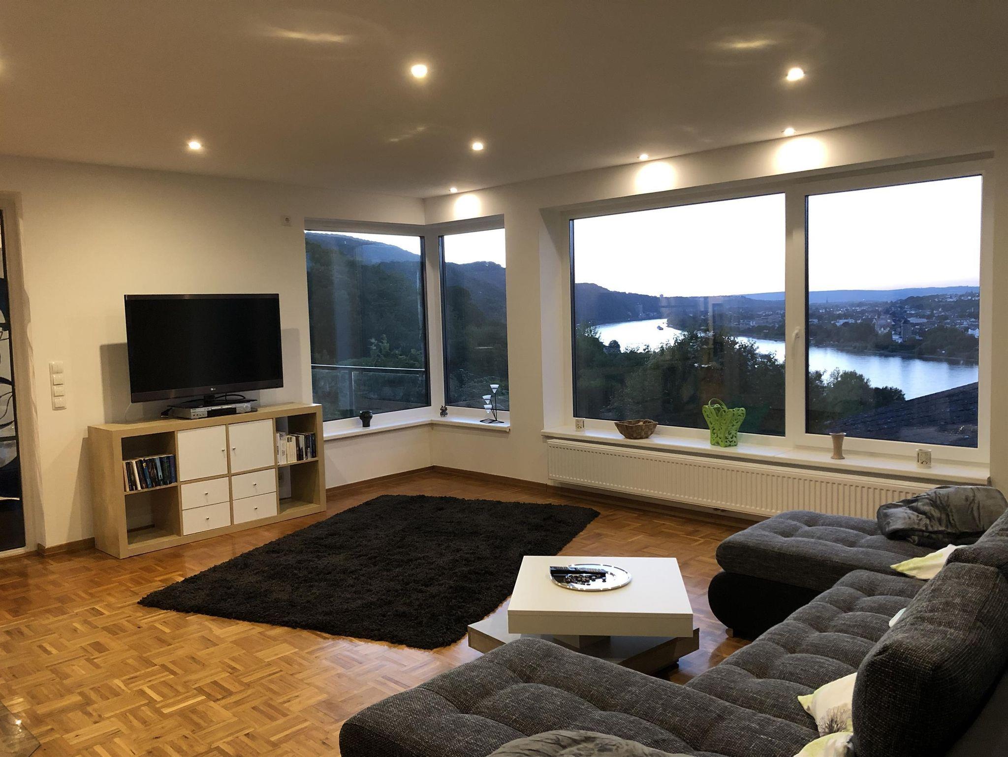 Die Wohnung Rheinpanorama bietet mit ihren 110 m² ausreichend Platz für erholsamen Urlaub. Sie verfügt über 2 separate Schlafzimmer. Schlafzimmer 1 bietet aufgrund der Größe zusätzlichen Platz für ein Beistellbett/ - liege oder aber ein Kinderbett. Aus dem großzügige Wohnzimmer mit Kamin bietet sich ein unverbauter Blick auf den Rhein Richtung Koblenz. Der Essbereich grenzt dirkt an die große überdachte Terrasse an. Auch von hier bietet sich ein unverbauter Rheinblick Richtung Koblenz. Die modern eingerichtete Küche bietet zusätzlich einen Sitzbereich. Sie ist mit Spülmaschine, Herd, Ofen und Mikrowelle voll ausgestattet. Das Badezimmer ist mit einer großzügigen ebenerdigen Dusche und einer Badewanne ausgestattet und bietet somit viel Raum für Wellness und Entspannung. Die Wohnung verfügt über eine Sauna im Untergeschoss. Der Gemeinschaftsgarten mit separater Grillecke ist über die Einfahrt neben dem Haus zu erreichen.