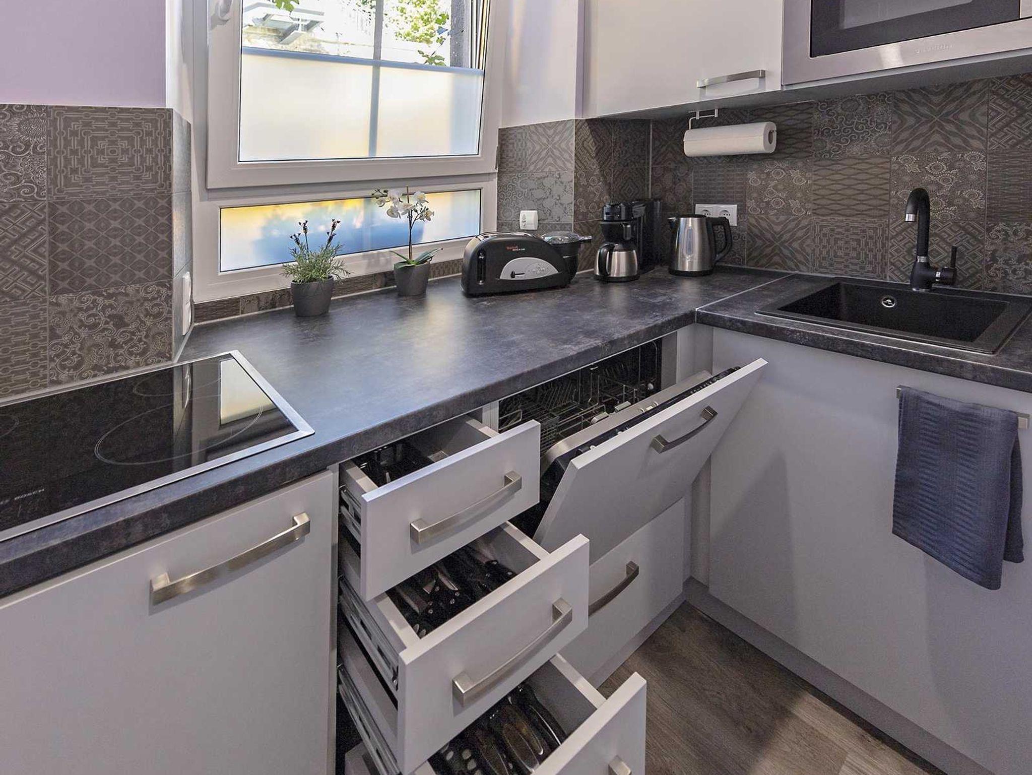 Helle Wohneinheit (20 - 30 m²) mit Sofa und 55 Smart-TV im Wohnbereich, Schlafzimmer mit Einzelbett 100 x 220 cm sowie 43 Smart-TV, W-LAN, vollausgestattete Küche und modernes Bad mit Regendusche/WC.