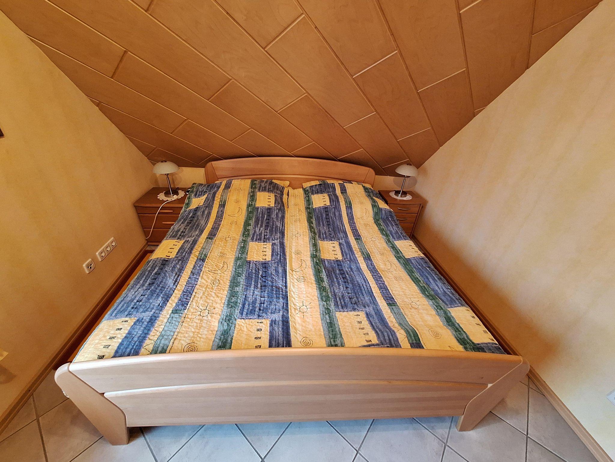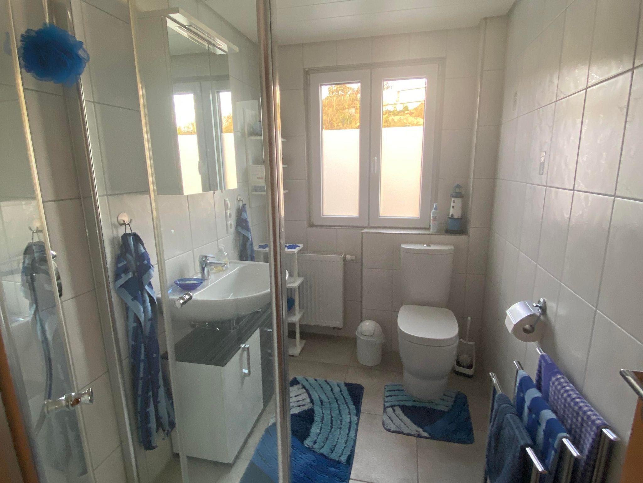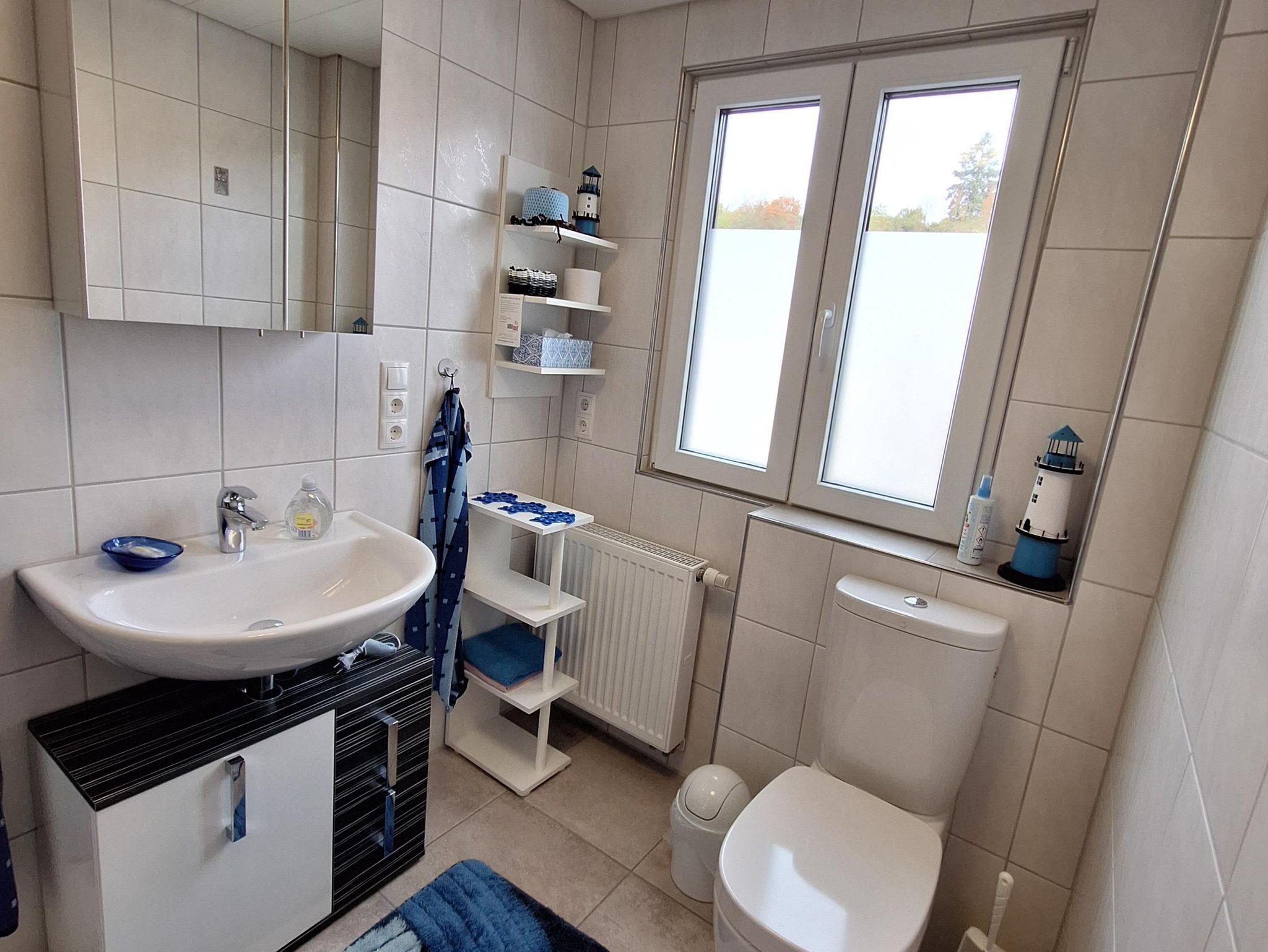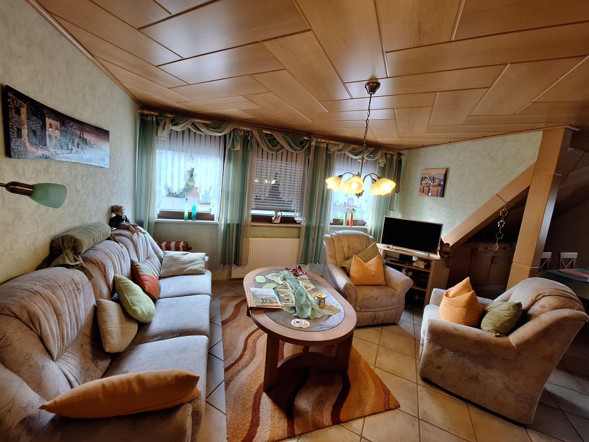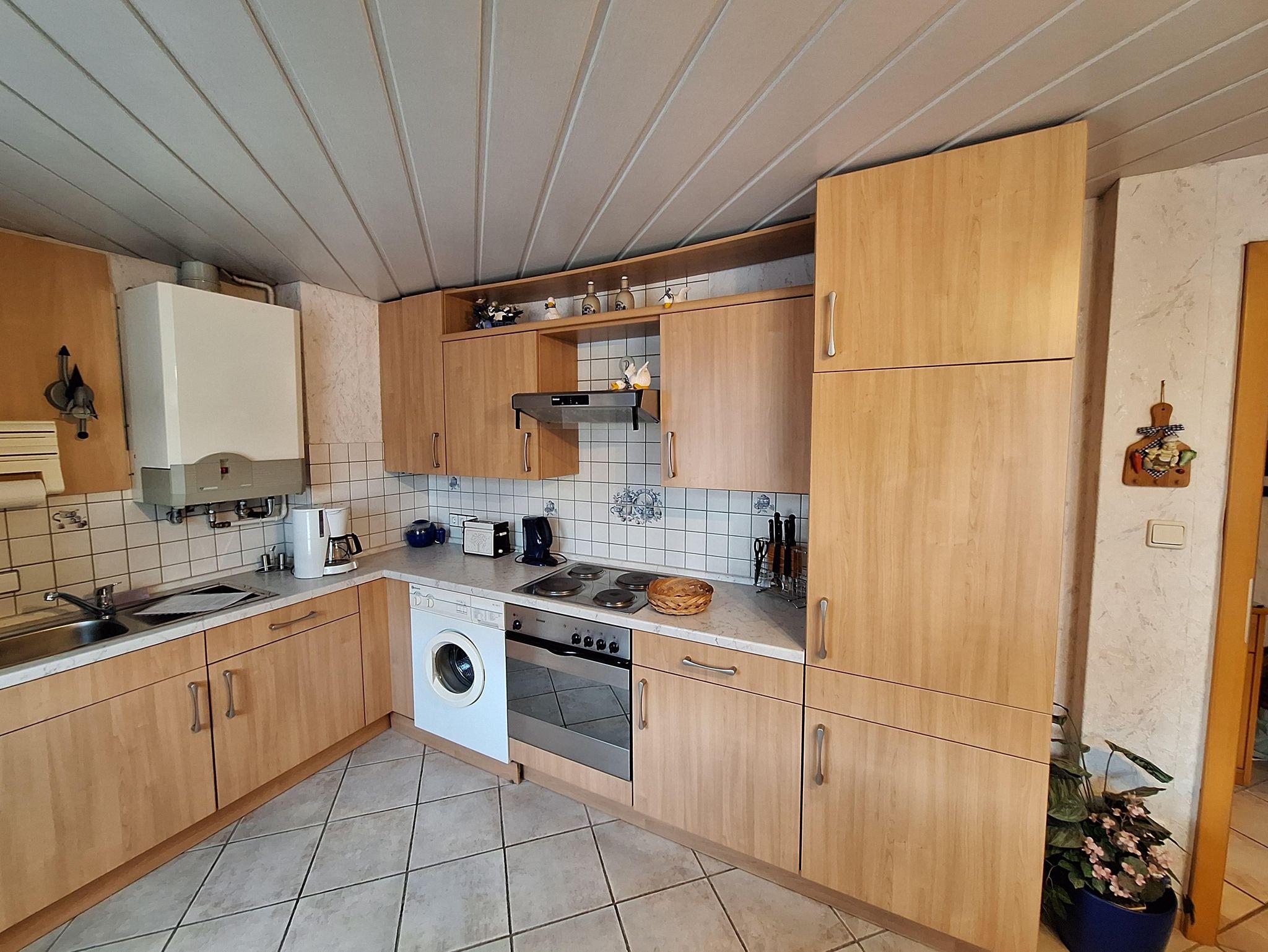 Die Ferienwohnung befindet sich im 2. Stockwerk unseres Hauses. Dafür sind ca. 18 Treppenstufen zu gehen. Die großzügige Wohnung ist mit einem Wohn-Esszimmer eingerichtet. Dort befindet sich auch ein Fernseher. Die Küche ist vollständig ausgestattet. Dort befindet sich im Haushaltsschrank auch ein Bügeleisen & Bügelbrett, Wäscheständer, Nähzeug und Co. Das separate Schlafzimmer mit Doppelbett (1,80 x 2,00 m) und einem geräumigen Kleiderschrank sorgt für erholsame Nächte. Die Betten sind bei Anreise bezogen. Das Badezimmer ist mit einer ebenerdigen Dusche, Waschbecken, WC sowie Kosmetikartikeln & einem Föhn ausgestattet. Im Garten steht Ihnen ein Freisitz mit Sonnenliegen und Sonnenschirm zur Verfügung.