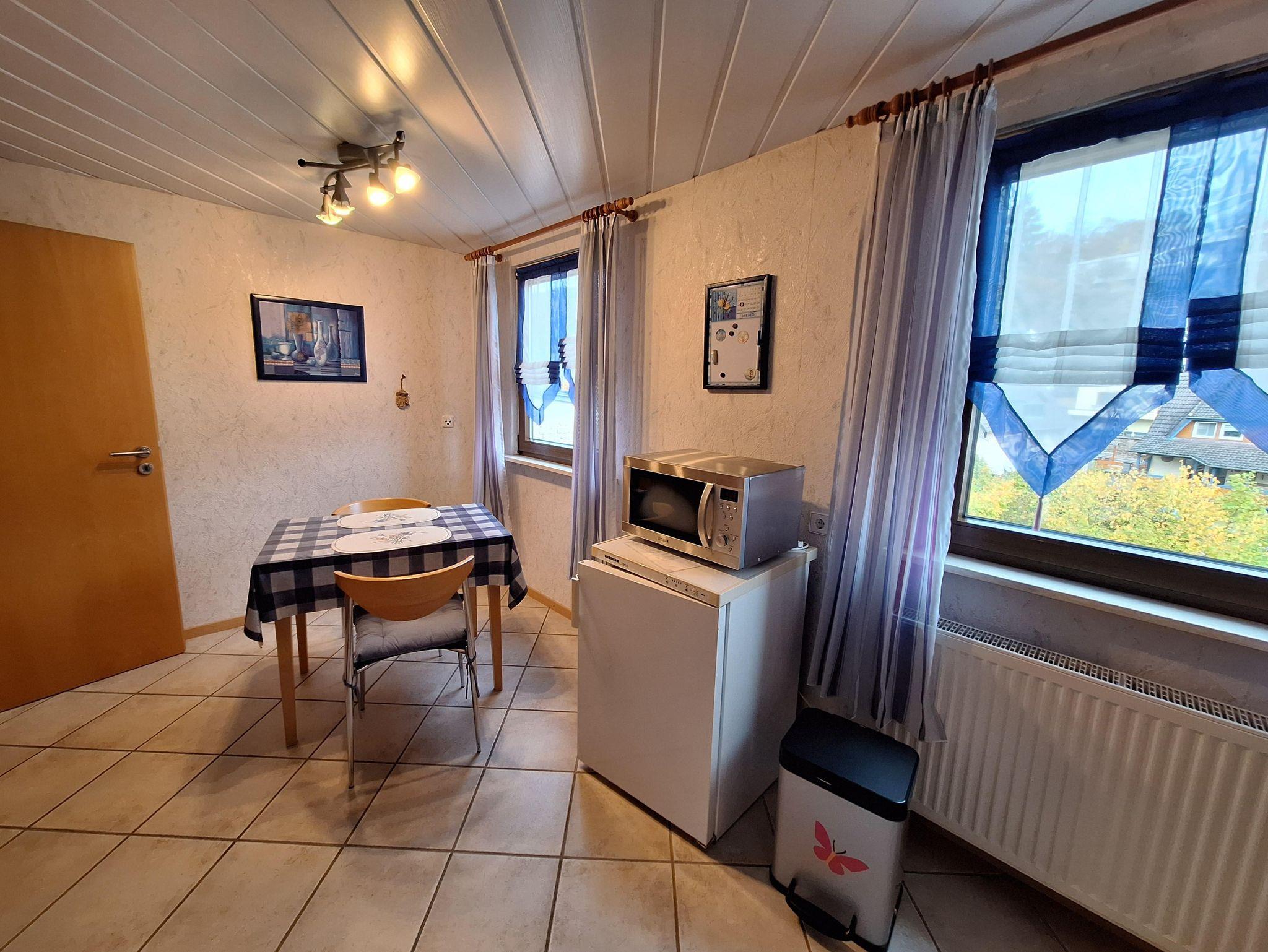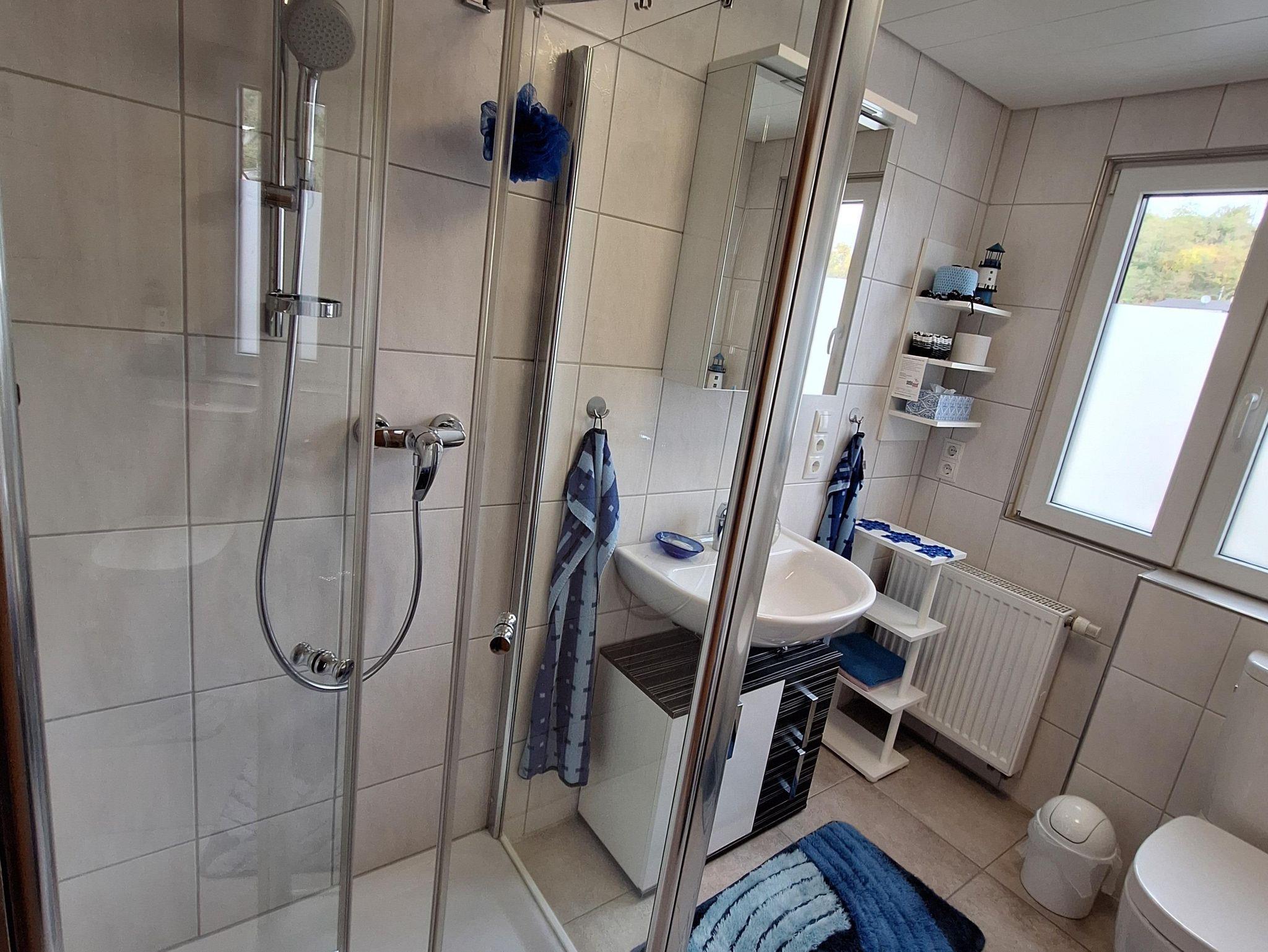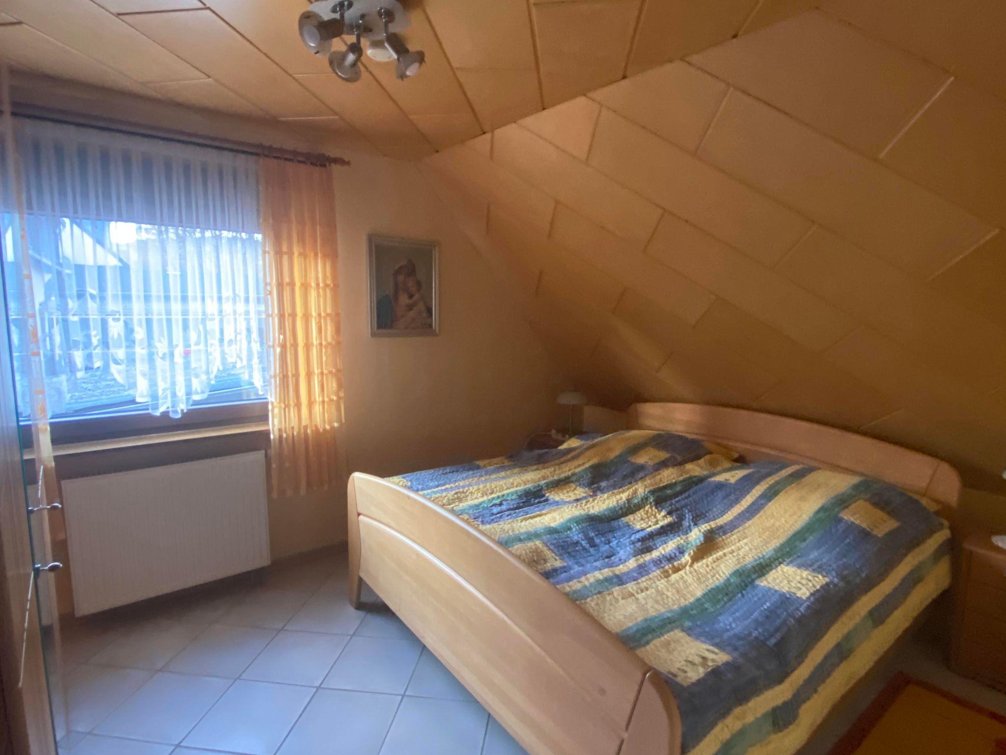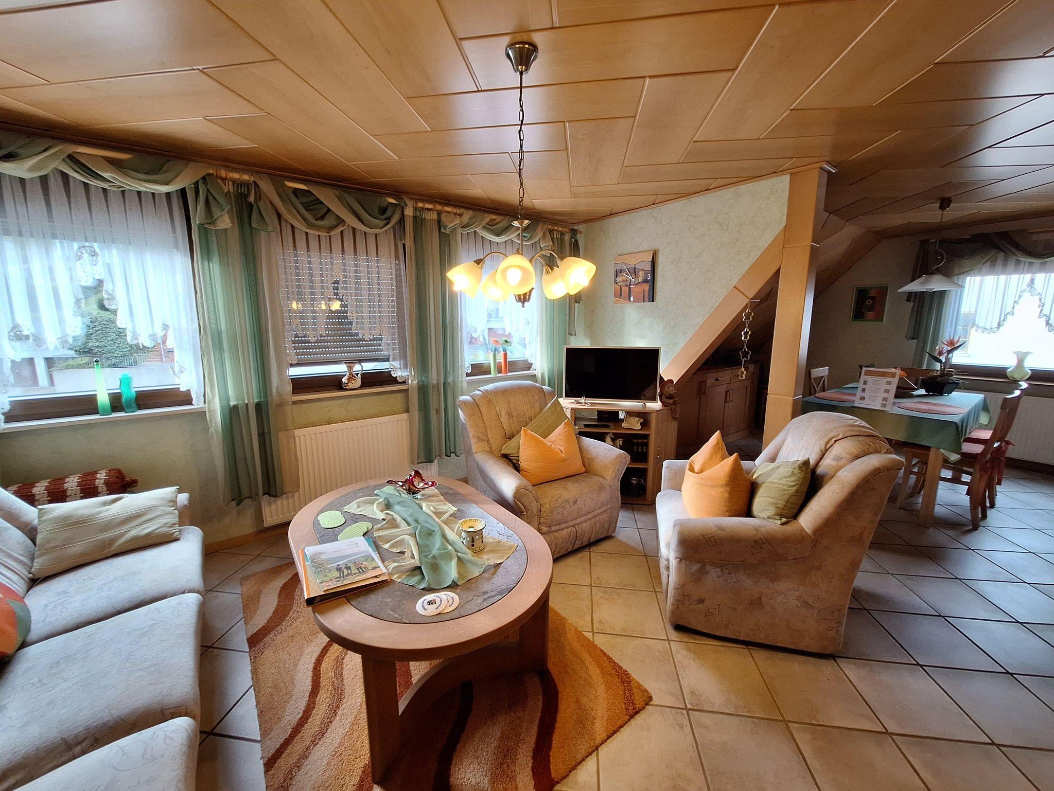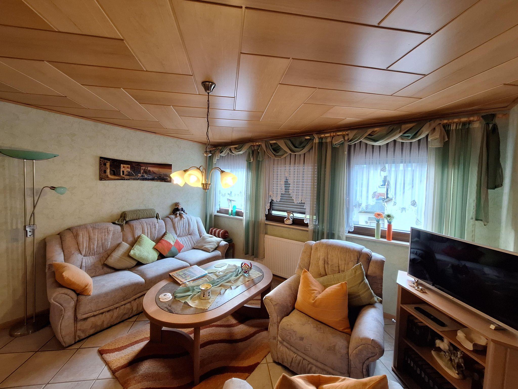 Die Ferienwohnung befindet sich im 2. Stockwerk unseres Hauses. Dafür sind ca. 18 Treppenstufen zu gehen. Die großzügige Wohnung ist mit einem Wohn-Esszimmer eingerichtet. Dort befindet sich auch ein Fernseher. Die Küche ist vollständig ausgestattet. Dort befindet sich im Haushaltsschrank auch ein Bügeleisen & Bügelbrett, Wäscheständer, Nähzeug und Co. Das separate Schlafzimmer mit Doppelbett (1,80 x 2,00 m) und einem geräumigen Kleiderschrank sorgt für erholsame Nächte. Die Betten sind bei Anreise bezogen. Das Badezimmer ist mit einer ebenerdigen Dusche, Waschbecken, WC sowie Kosmetikartikeln & einem Föhn ausgestattet. Im Garten steht Ihnen ein Freisitz mit Sonnenliegen und Sonnenschirm zur Verfügung.