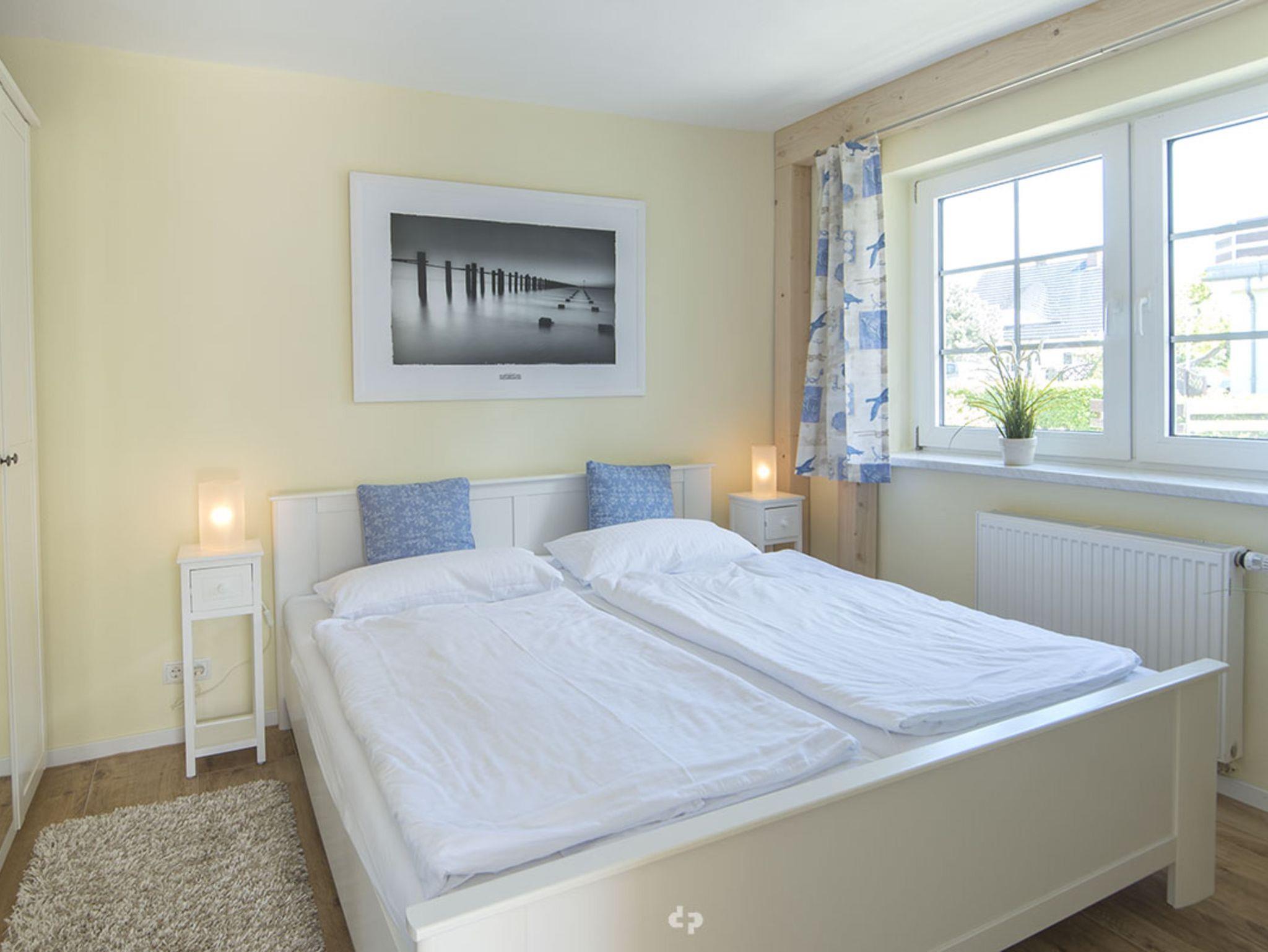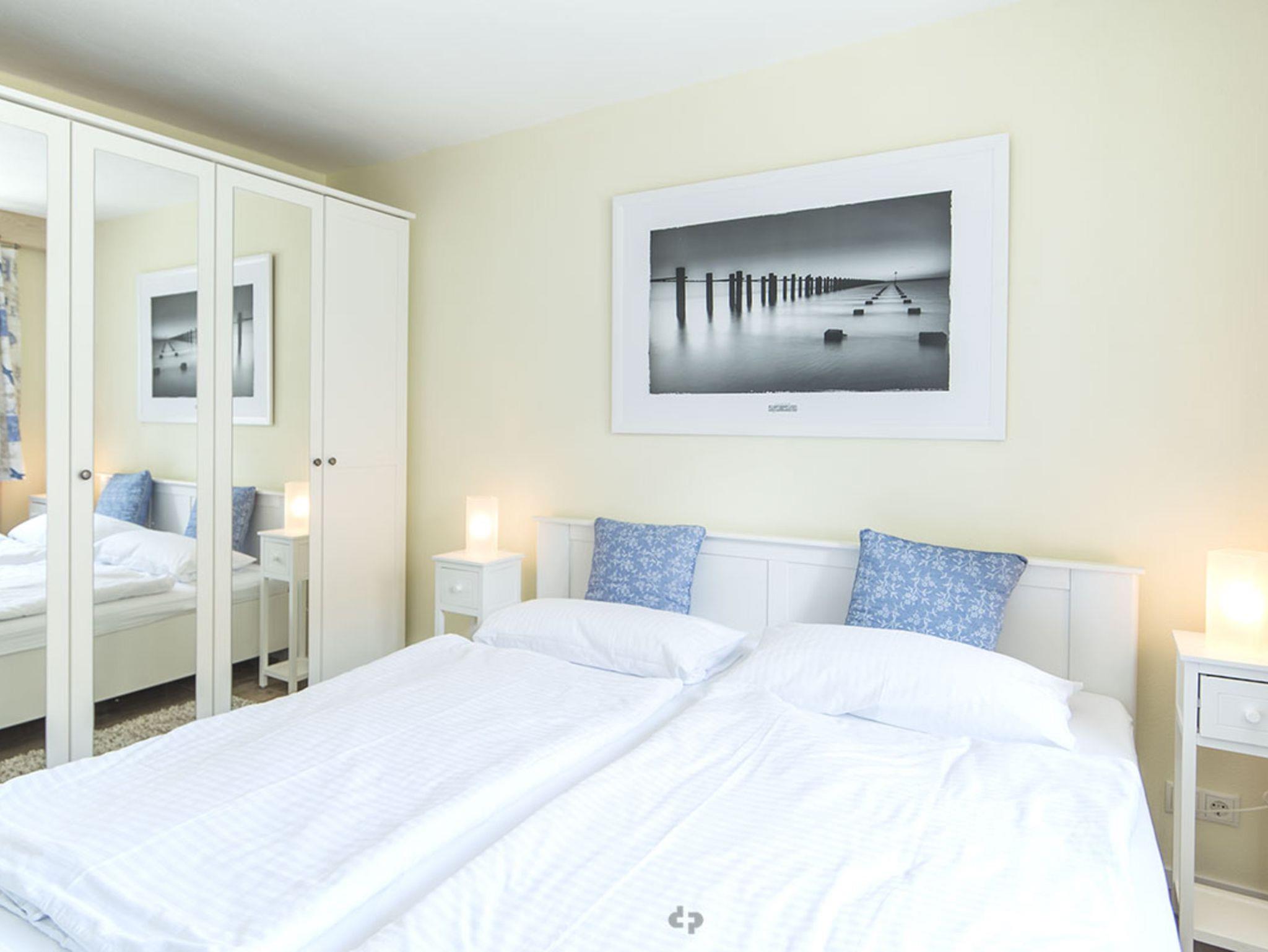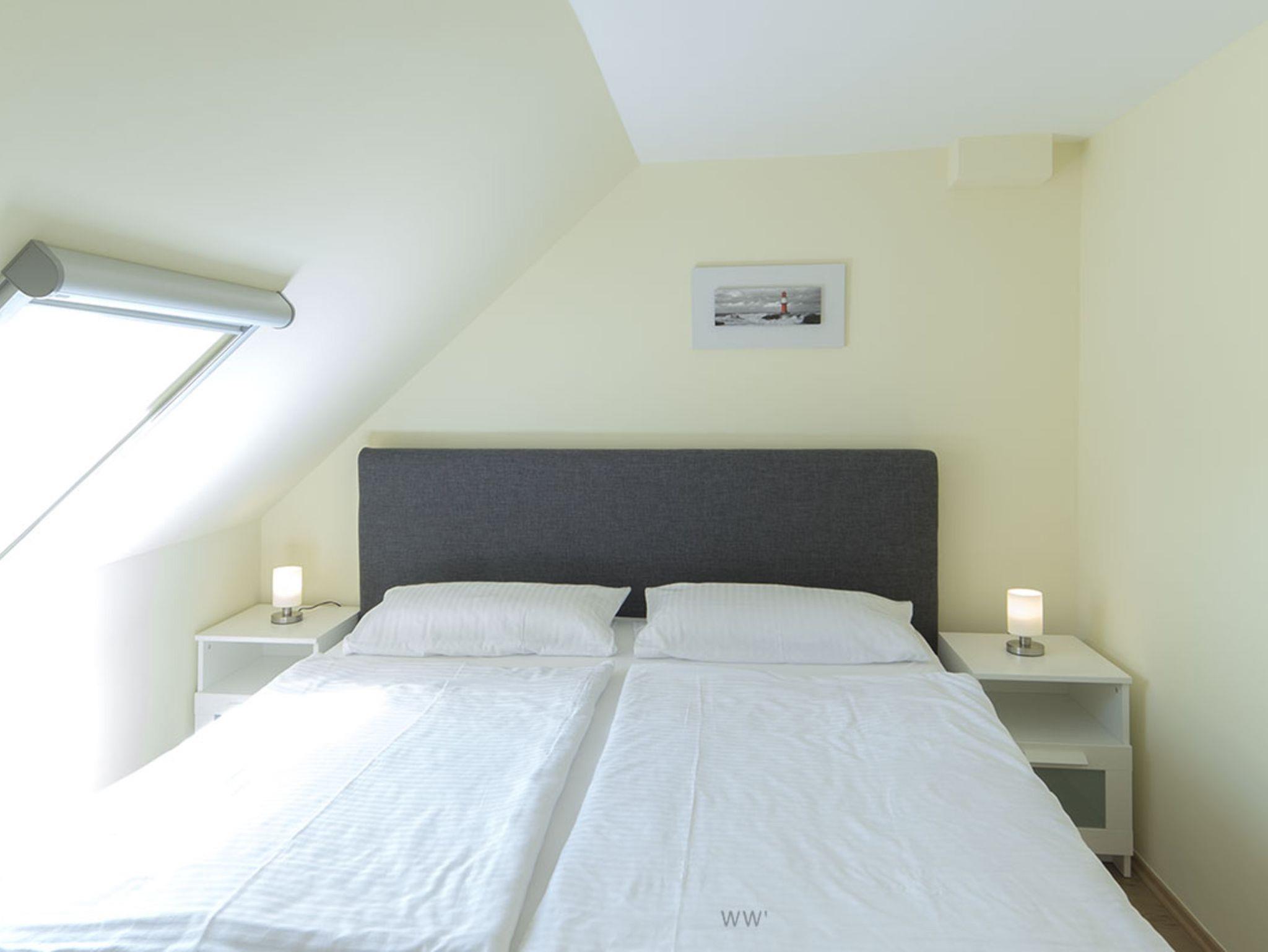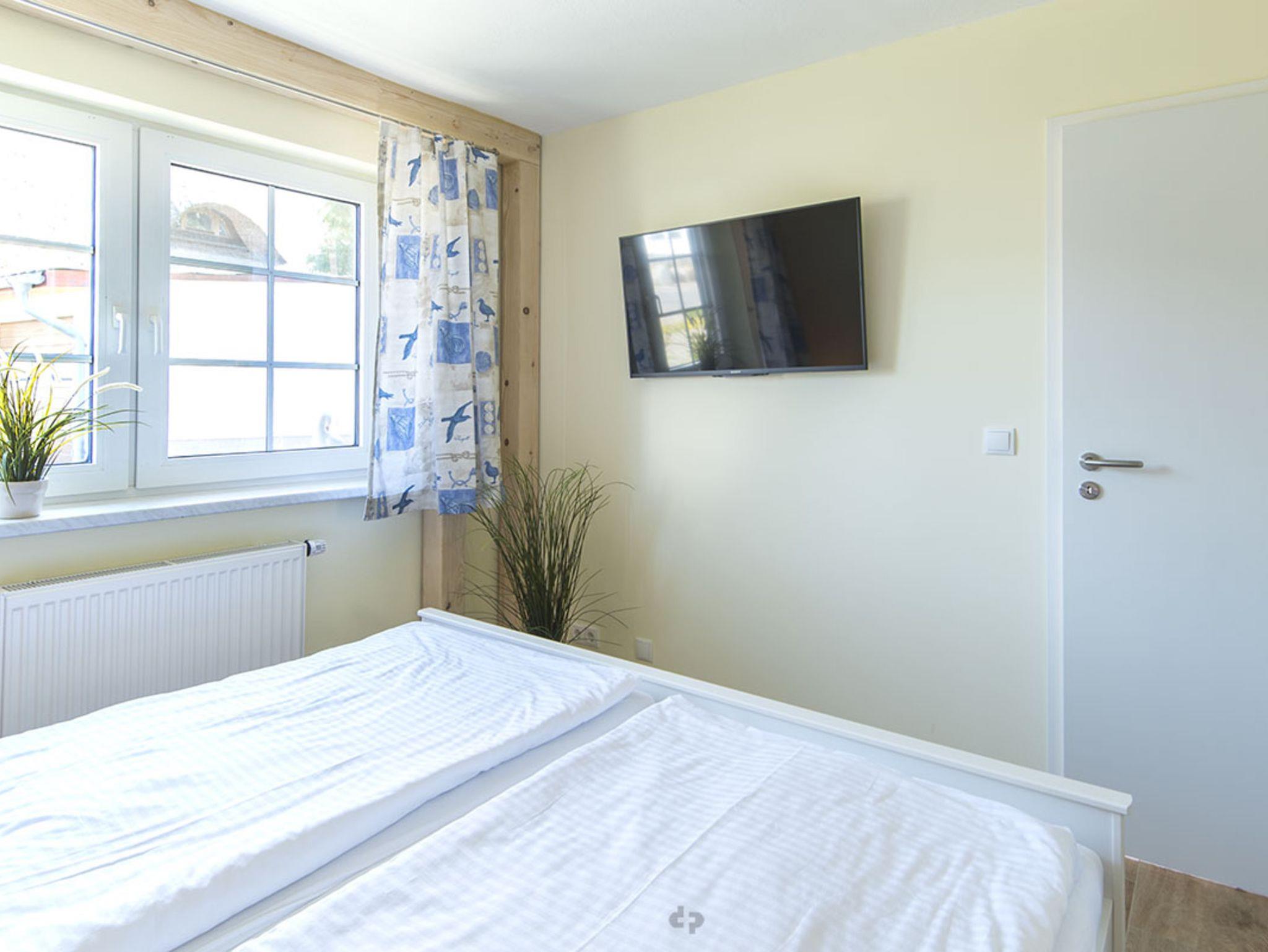 • Im Schlafzimmer befinden sich ein Doppelbett, ein Kleiderschrank mit ausreichend Stauraum sowie ein Flachbildfernseher.